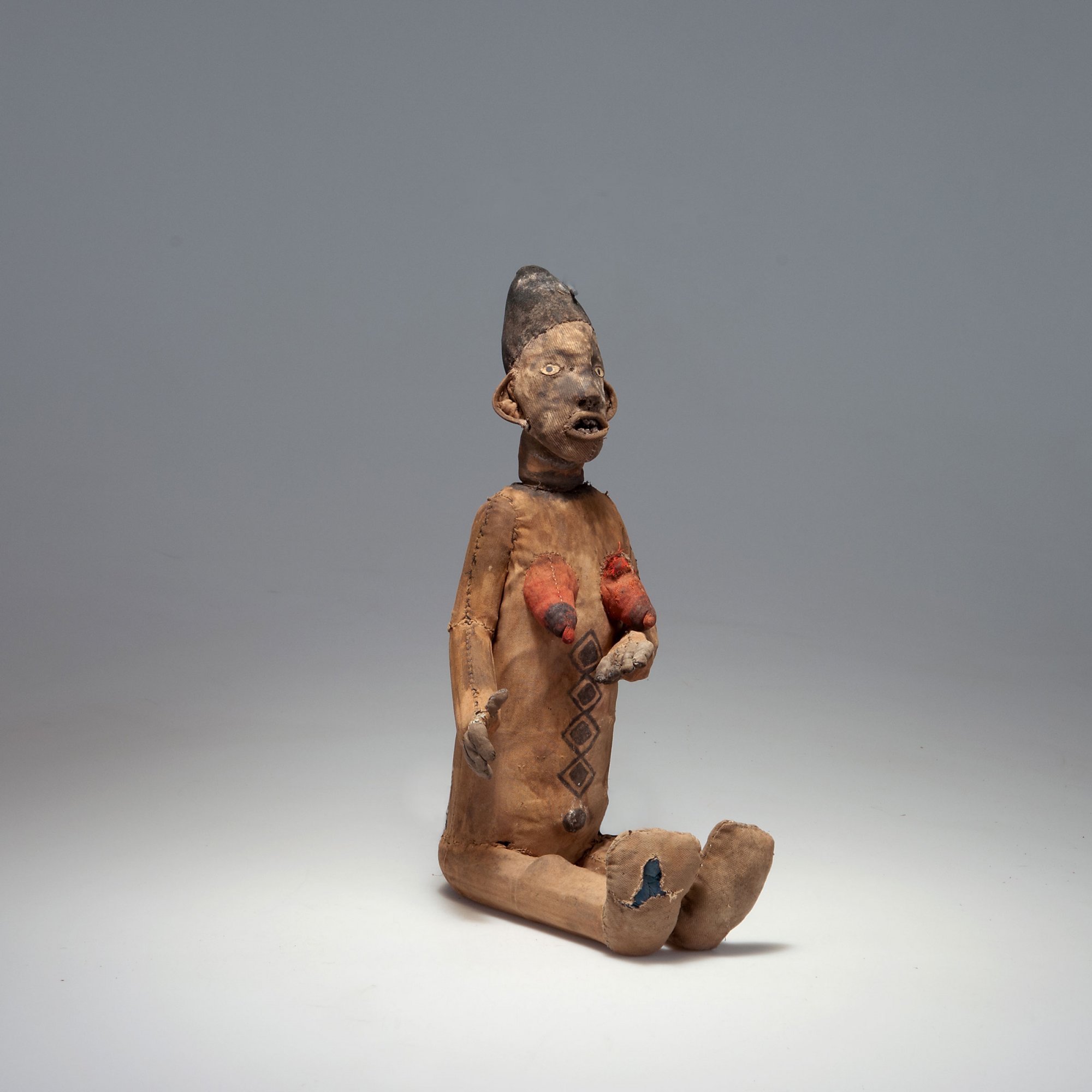 Alte, sehr seltene weibliche 'muzidi' mit üppigen Brüsten. Sitzend, rechter Arm ausgestreckt, linker Arm angewinkelt. Die Figur, mit einem Korpus aus getrockneter Naturfaser, mit ocker eingefärbtem Baumwollgewebe überzogen. Tatauierungen auf dem Bauch dunkel eingefärbt, Brüste rot, bzw. Brustwarzen blau eingefärbt, hell- bis dunkelgrau eingefärbtes Gesicht, dunkle Kopfbedeckung.