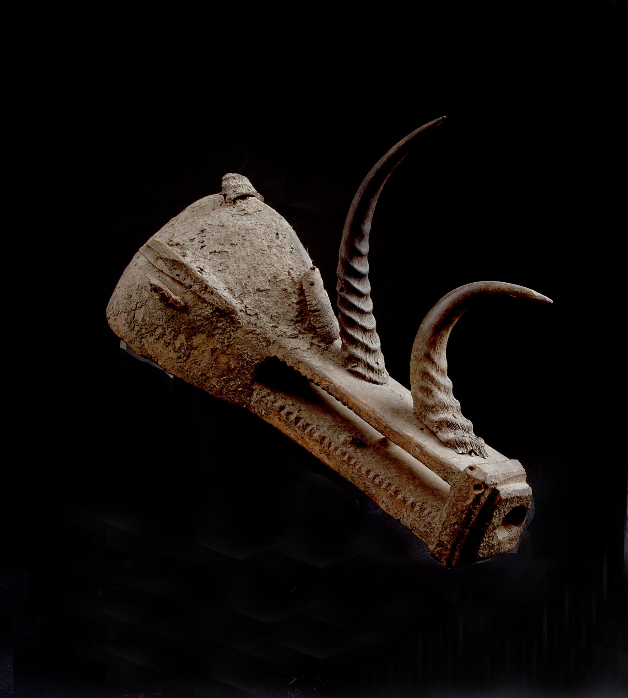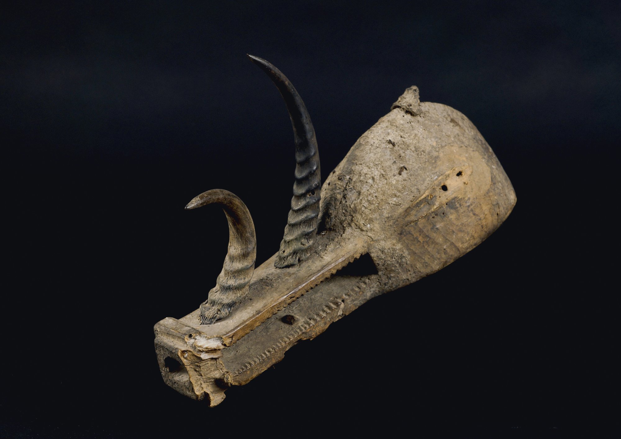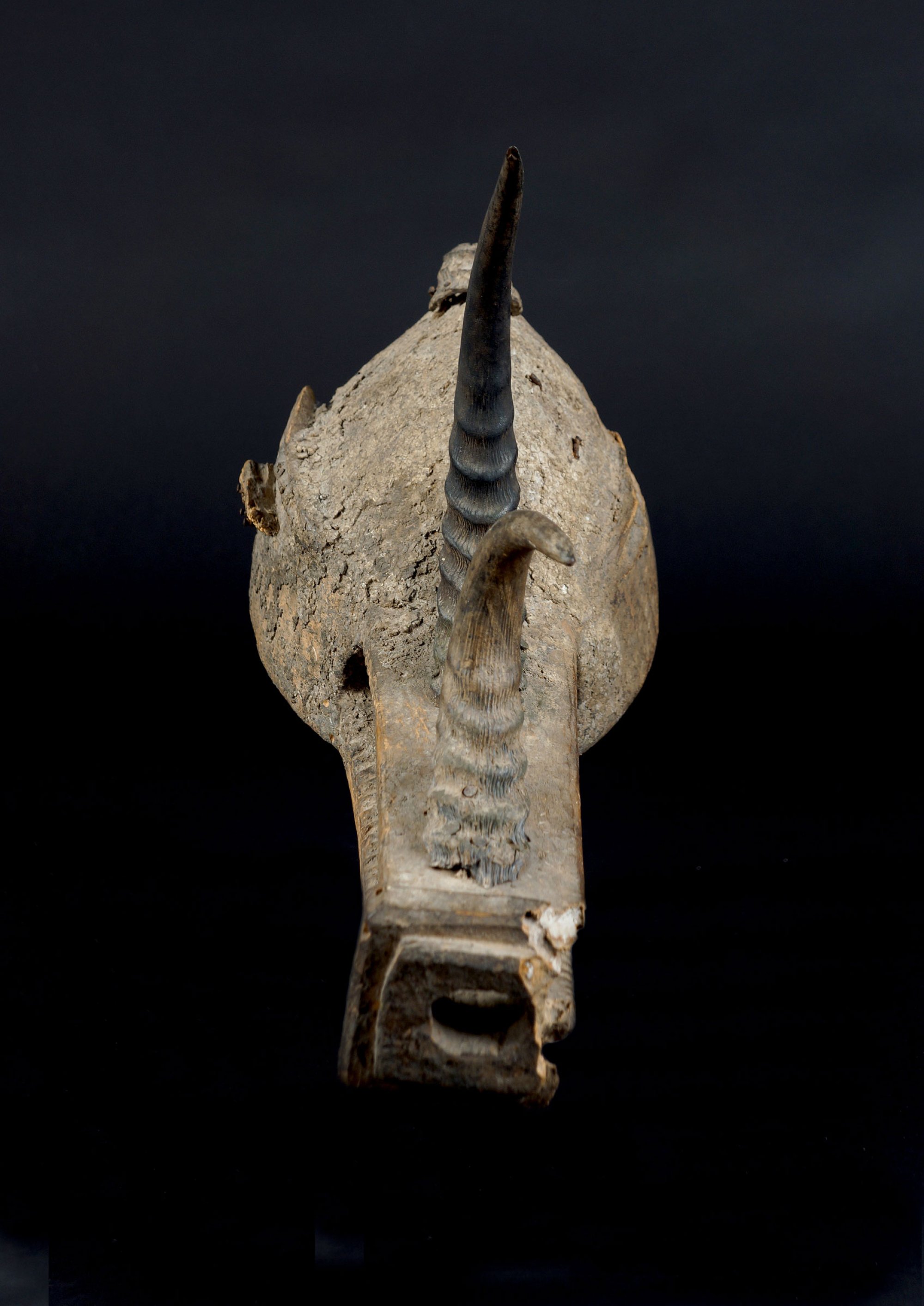 Helmmaske mit halbkugeligem Kopfteil, zwei aufgenagelte, unterschiedlich große Antilopenhörner.