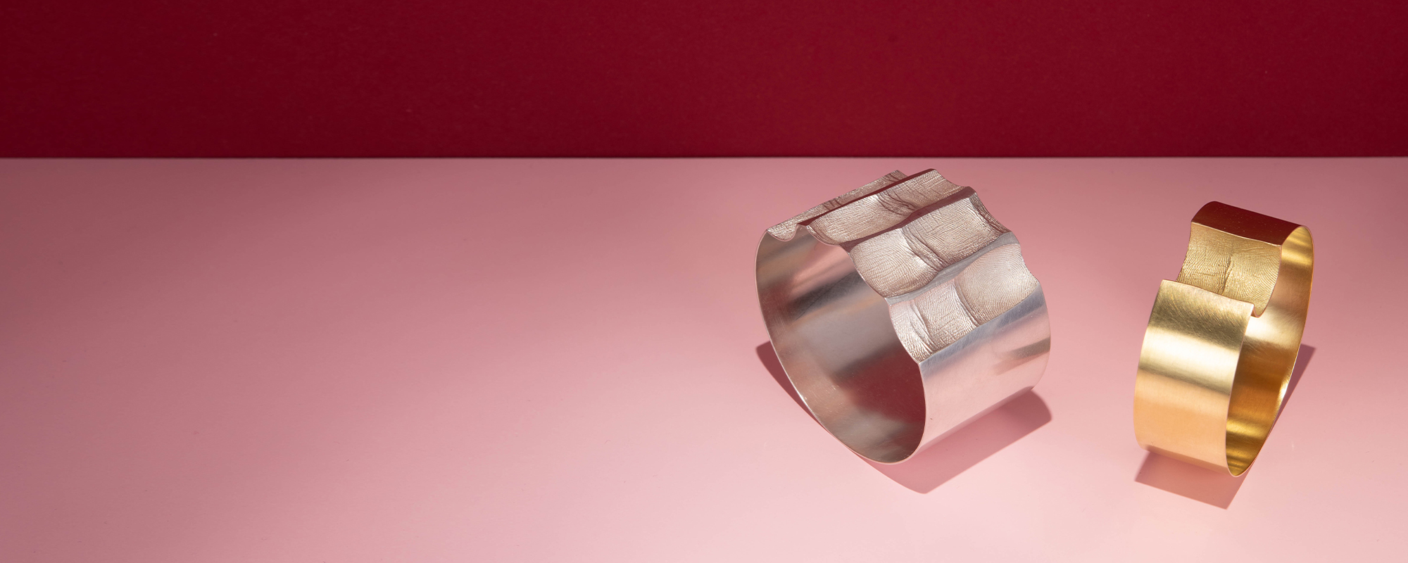 Es muss nicht immer Gold sein. Ein Kapitel des Katalogs widmen wir einem federleichtem Metall - Aluminium. 1991 erschien unter dem Namen ‚Aluminium - das Metall der Moderne‘ eine wunderbar illustrierte Aufsatzsammlung, die die Ausstellungstrilogie der Museen in Köln, Neuss und Engelskirchen begleitete. Bereits zwei Jahre zuvor startete die Düsseldorfer Galerie für Design UND Designvermittlung eine Ausstellungsreihe, die den zeitgenössischen Aluminiumschmuck in den Fokus rückte. Die hier angebotenen Schmuckstücke stammen aus den Ausstellungen von 1989 und 1991 und zeigen nur einen kleinen Ausschnitt der faszinierenden Varianz des Werkstoffes. Lassen Sie sich vom wandelbaren ‚Metall der Moderne‘ mitreißen.