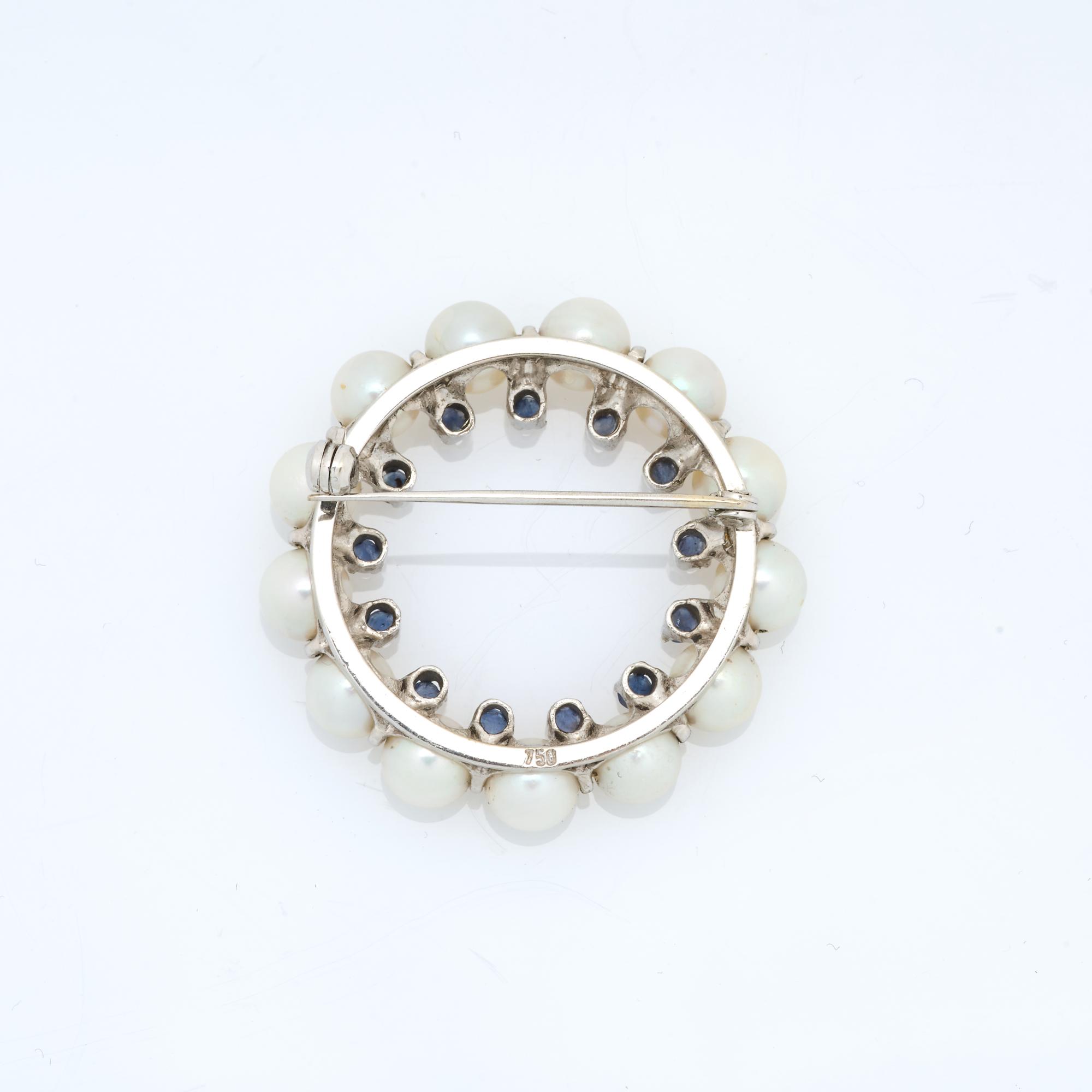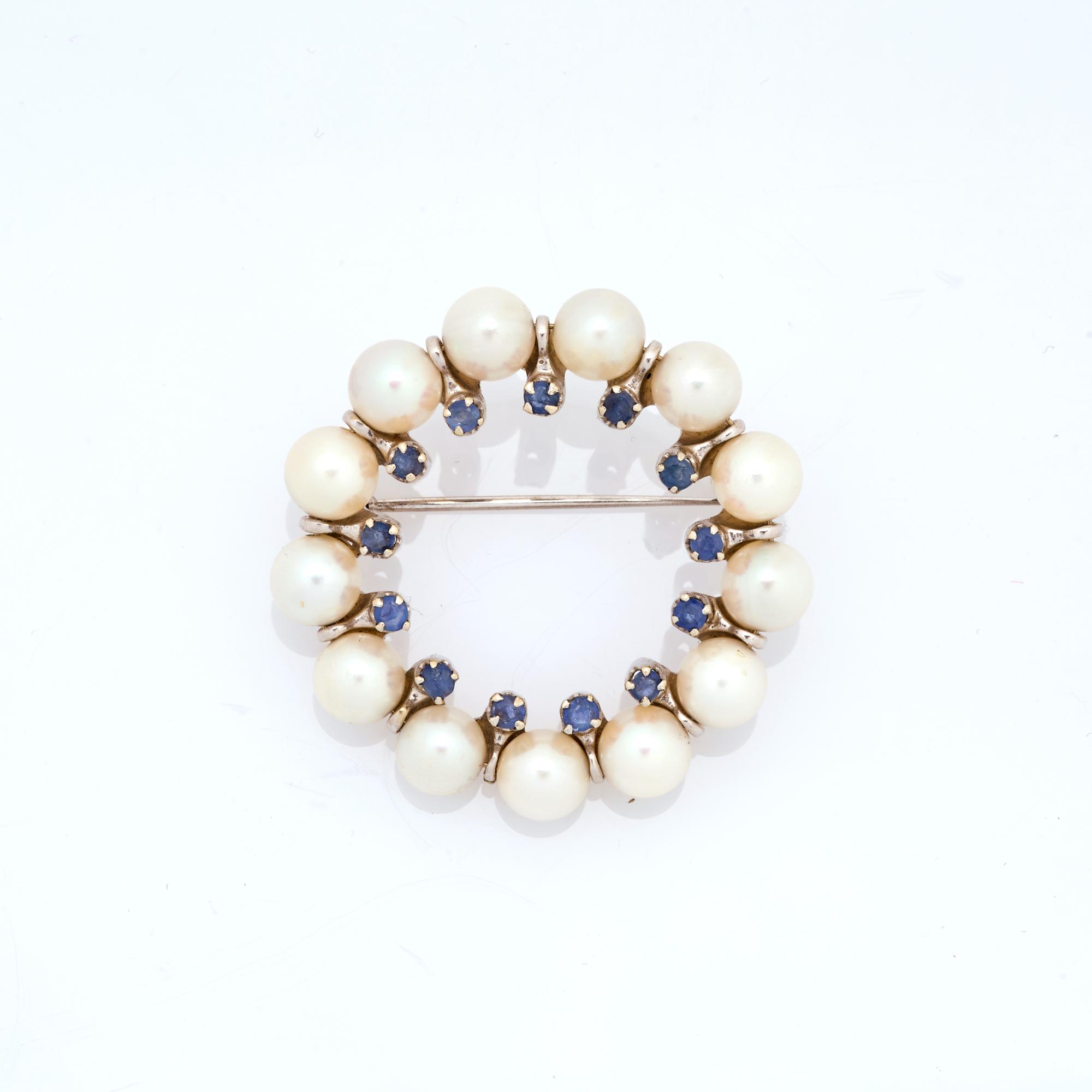 Weißgold 750, 13 Perlen, zart rosafarbener bis grüner Lüster, 13 Saphire im Rundschliff.