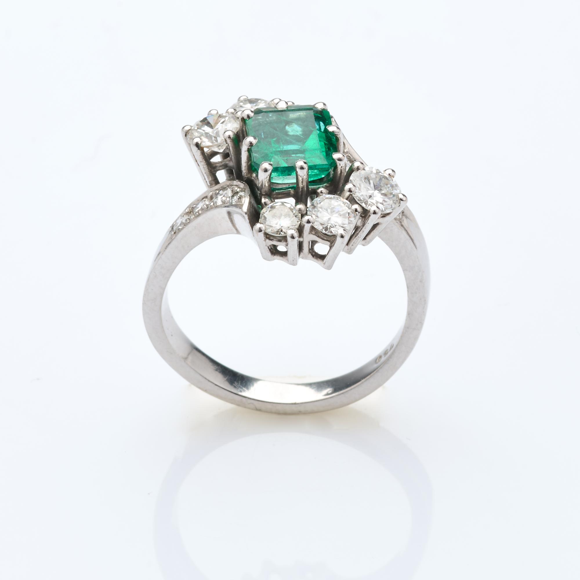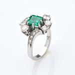Weißgold 750, Smaragd im Smaragdschliff (ca. 0,90 ct., errechnetes Gewicht), 14 Diamanten im Altschliff und Kleinbrillanten (zus. ca. 1,01 ct., errechnetes Gewicht).