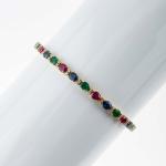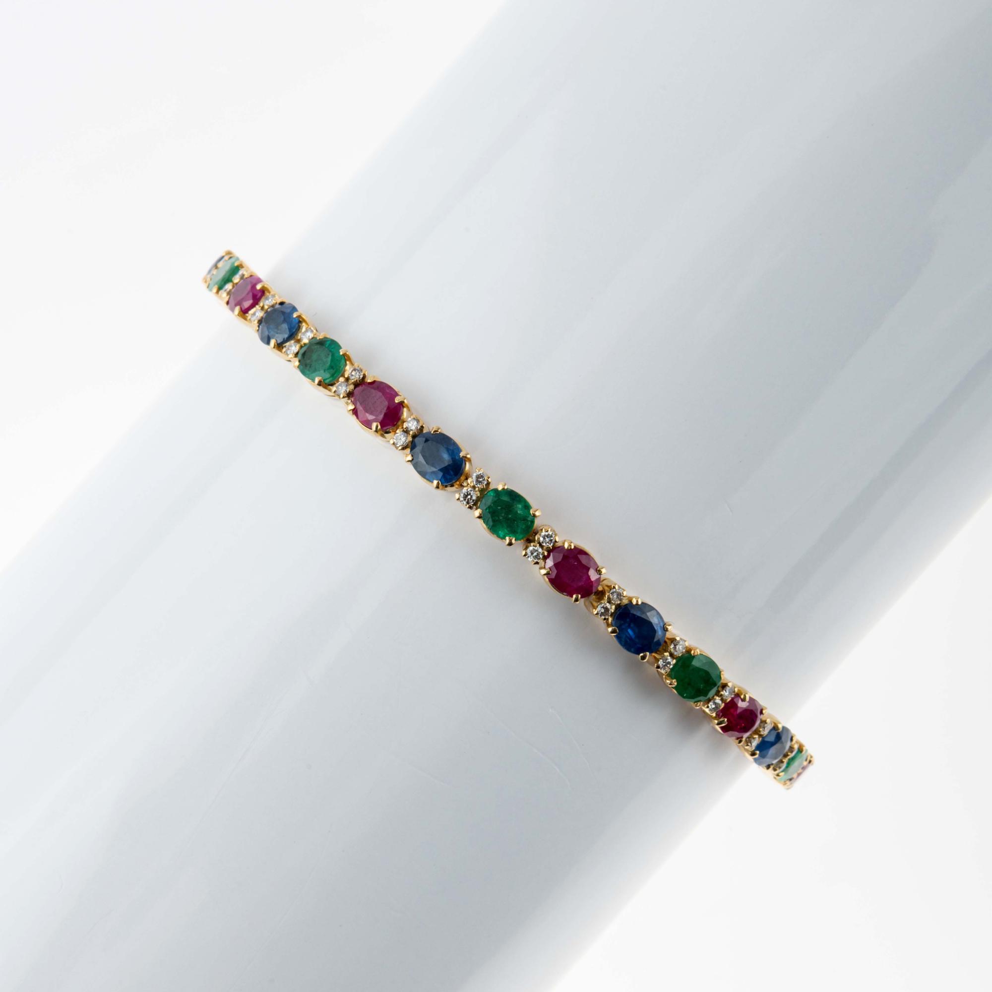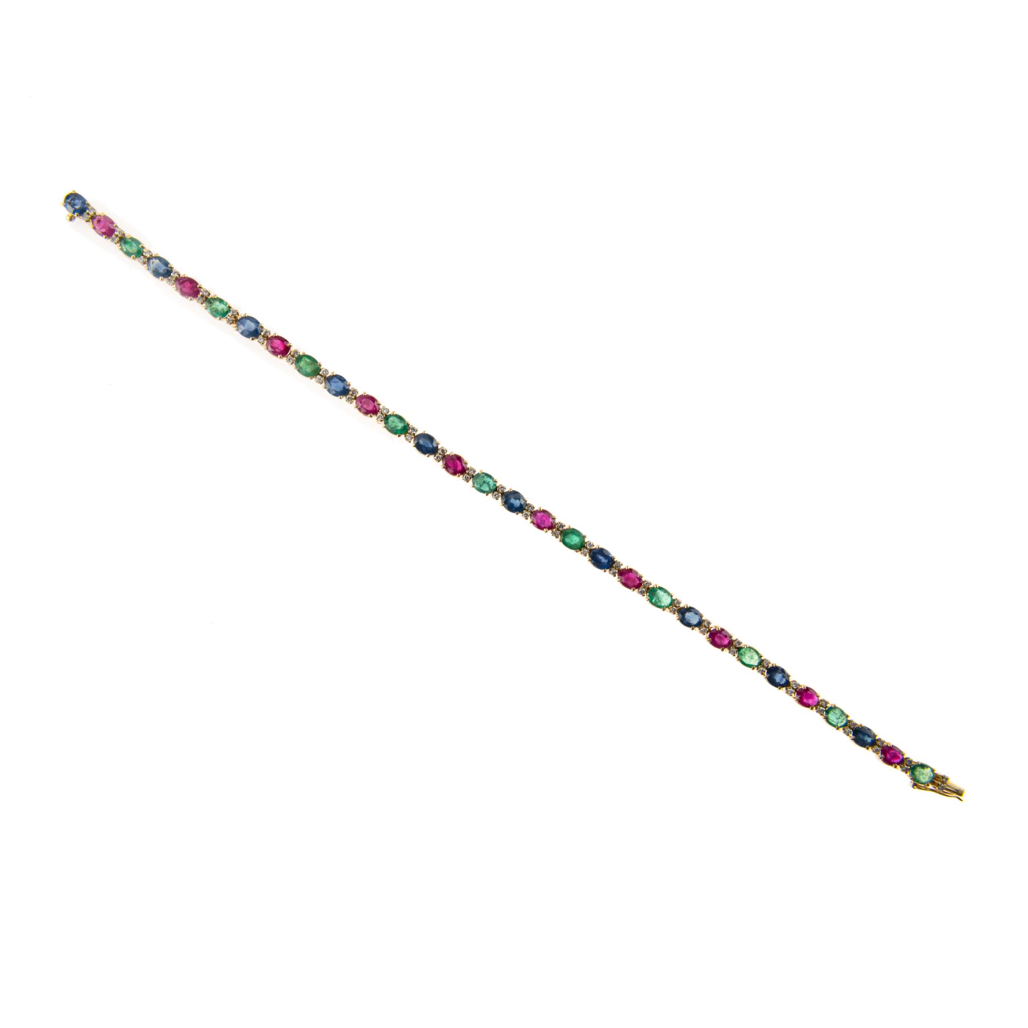Gelbgold 750 (getestet), zehn Saphire (zus. ca. 3,80 ct., errechnetes Gewicht), zehn Rubine (zus. ca. 2,90 ct., errechnetes Gewicht), zehn Smaragde (zus. ca. 2,00 ct., errechnetes Gewicht), 60 Kleinbrillanten.