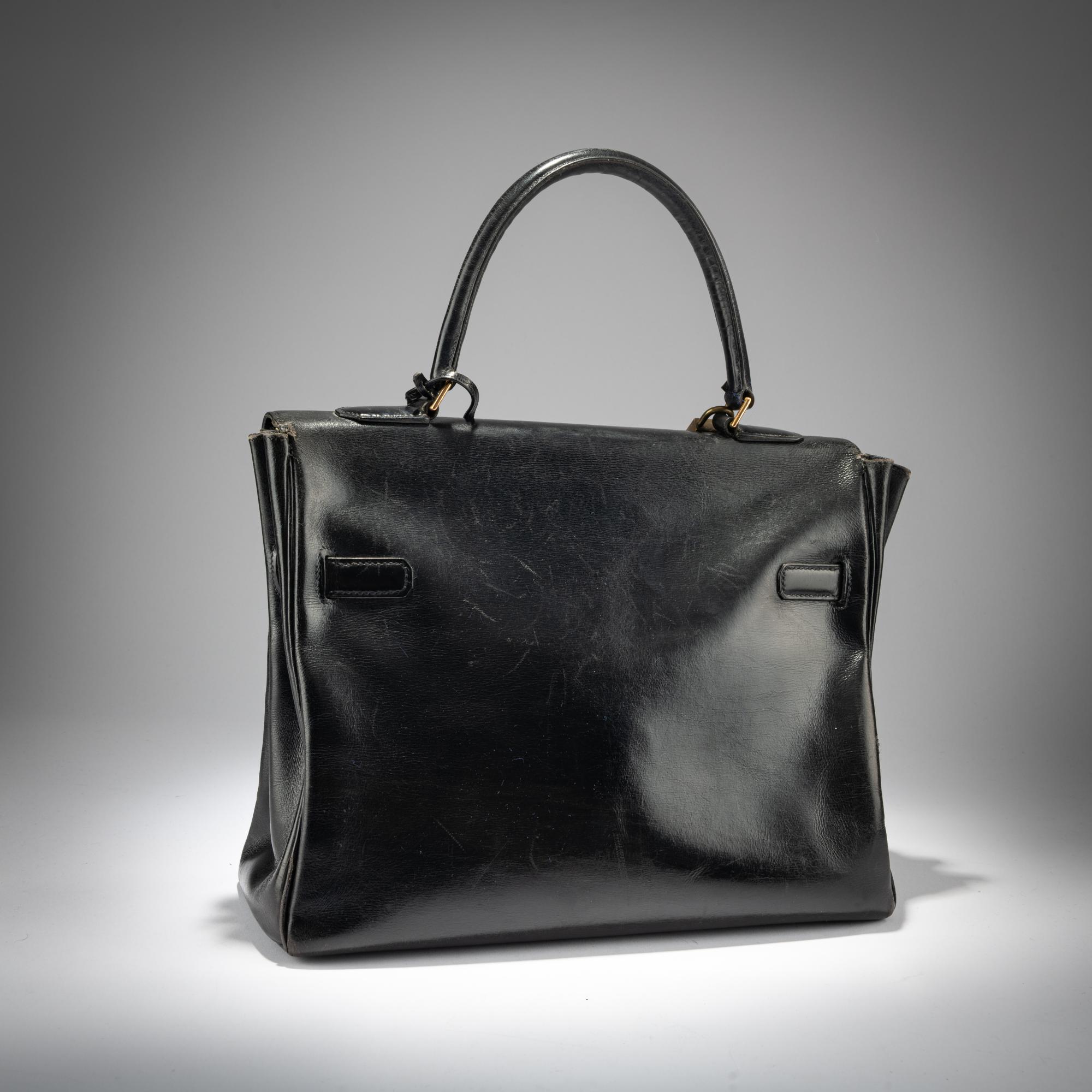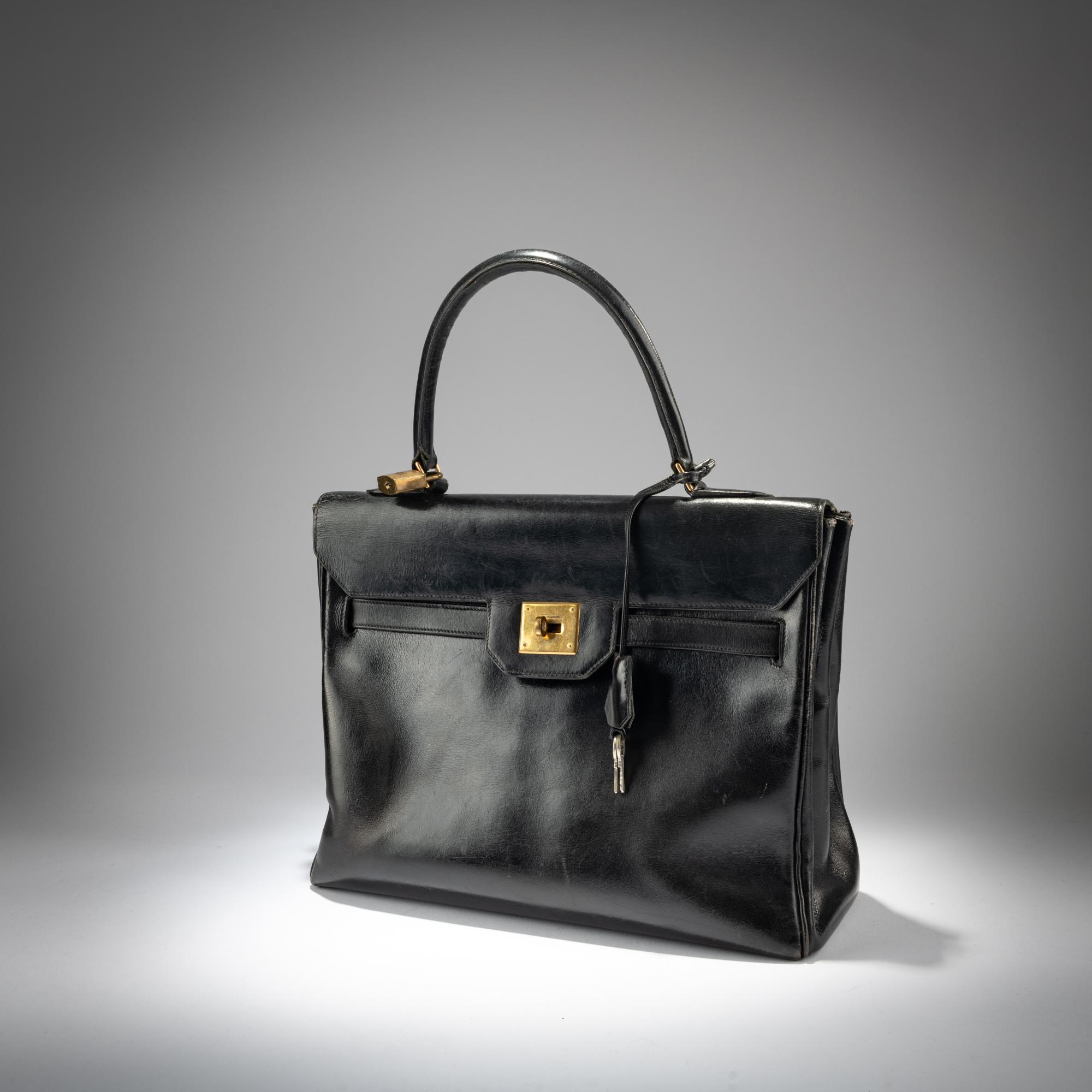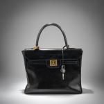 Mit Gurt, L. 77 cm, Schloss und Schlüssel. Dabei: Kalender aus dem Jahr 1965. Schwarzes Kalbsleder, 10 x 8 cm mit Bleistift. L. 9,2 cm. Messingblech, vergoldet, schwarzer Kunststoff.