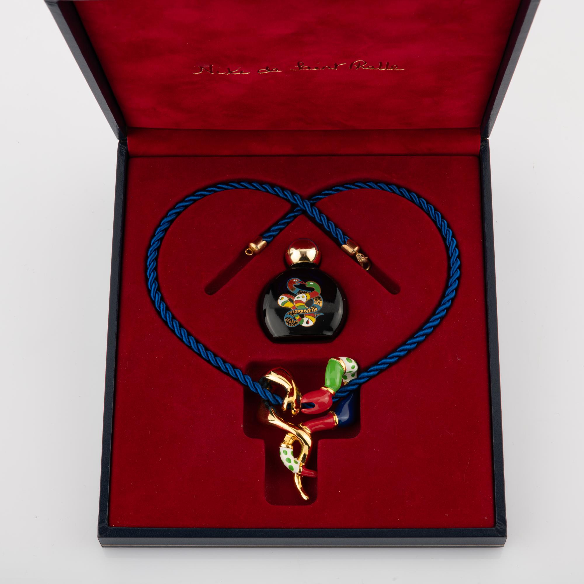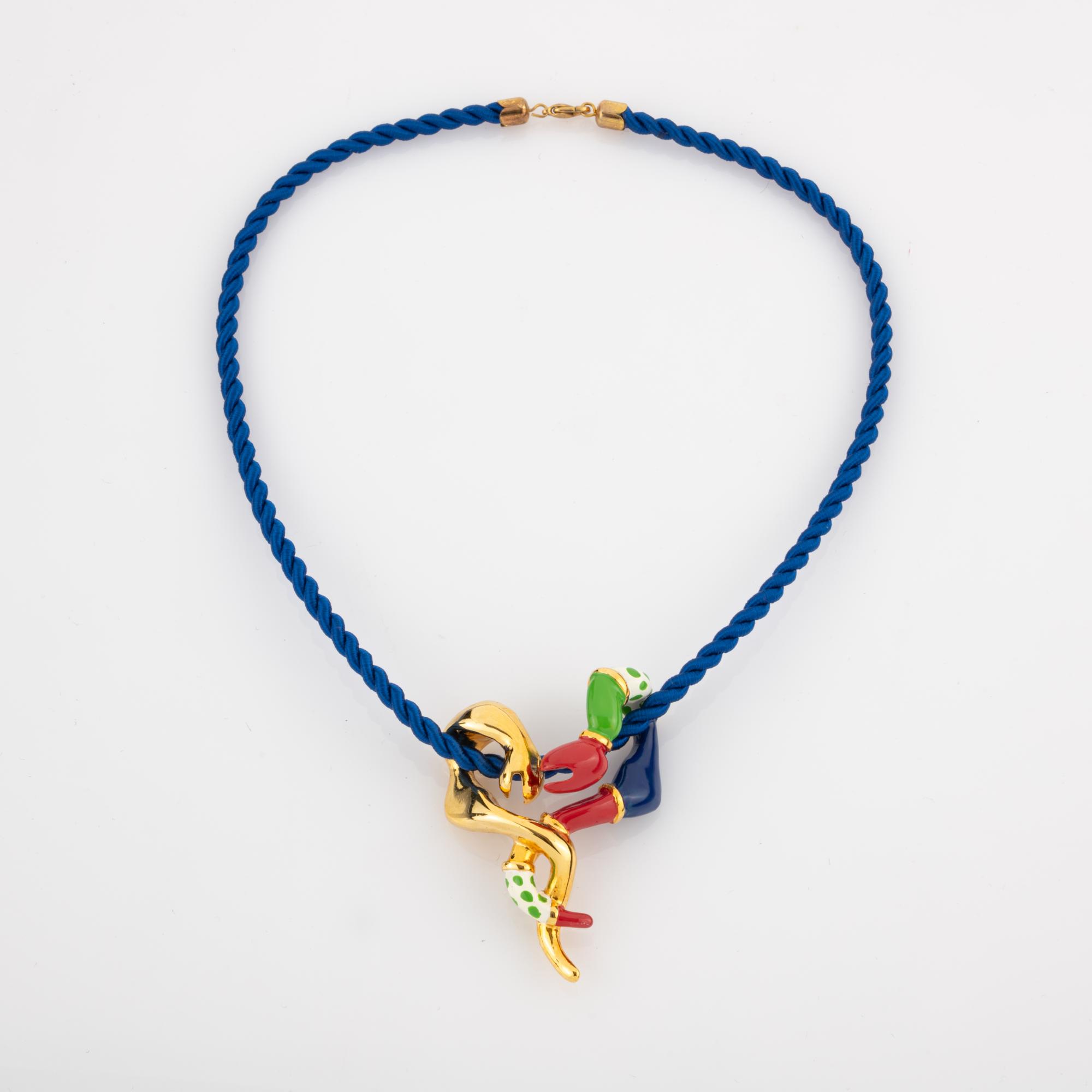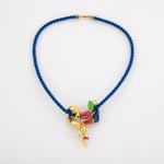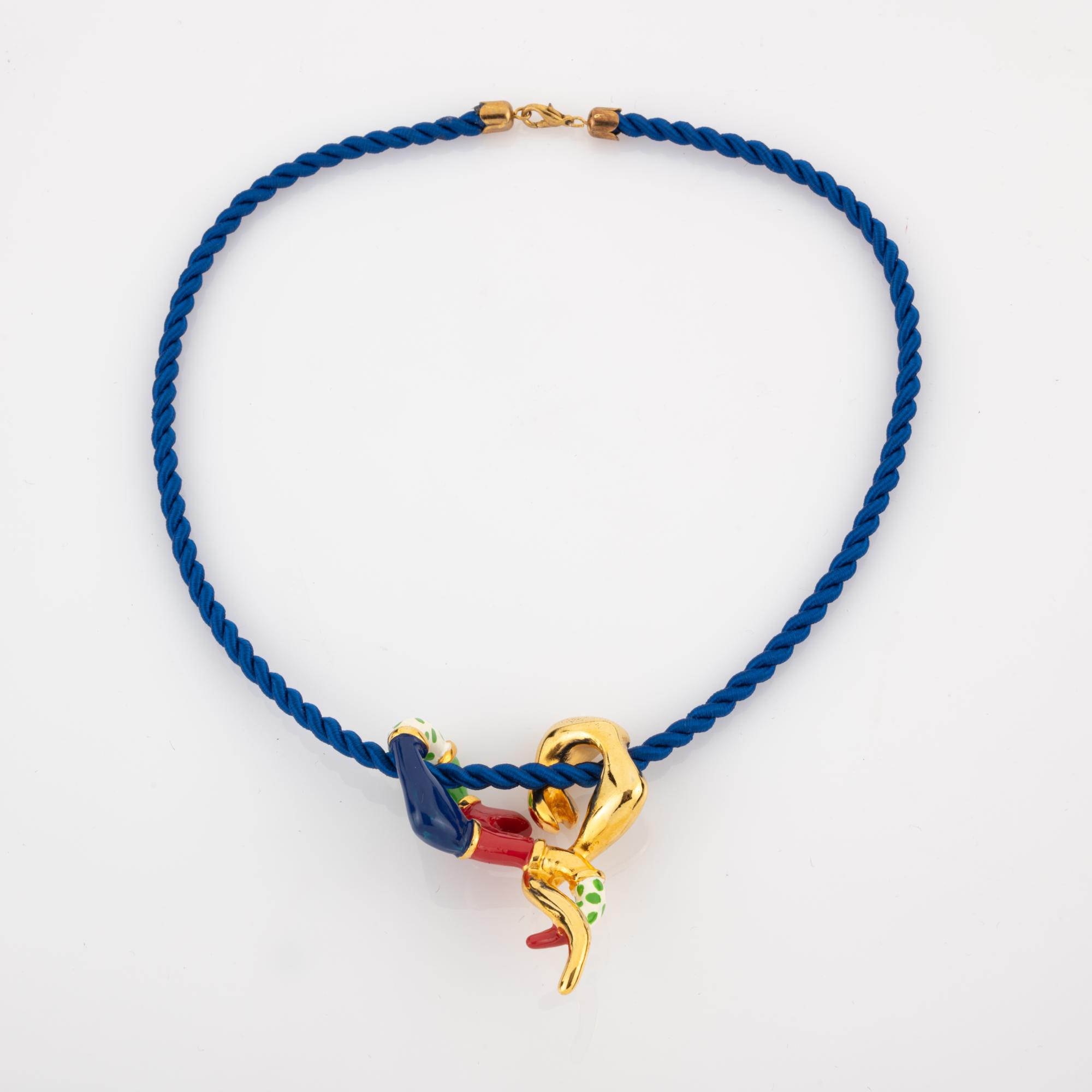 Metall, vergoldet, polychrom handbemalt, blaue Textilkordel.