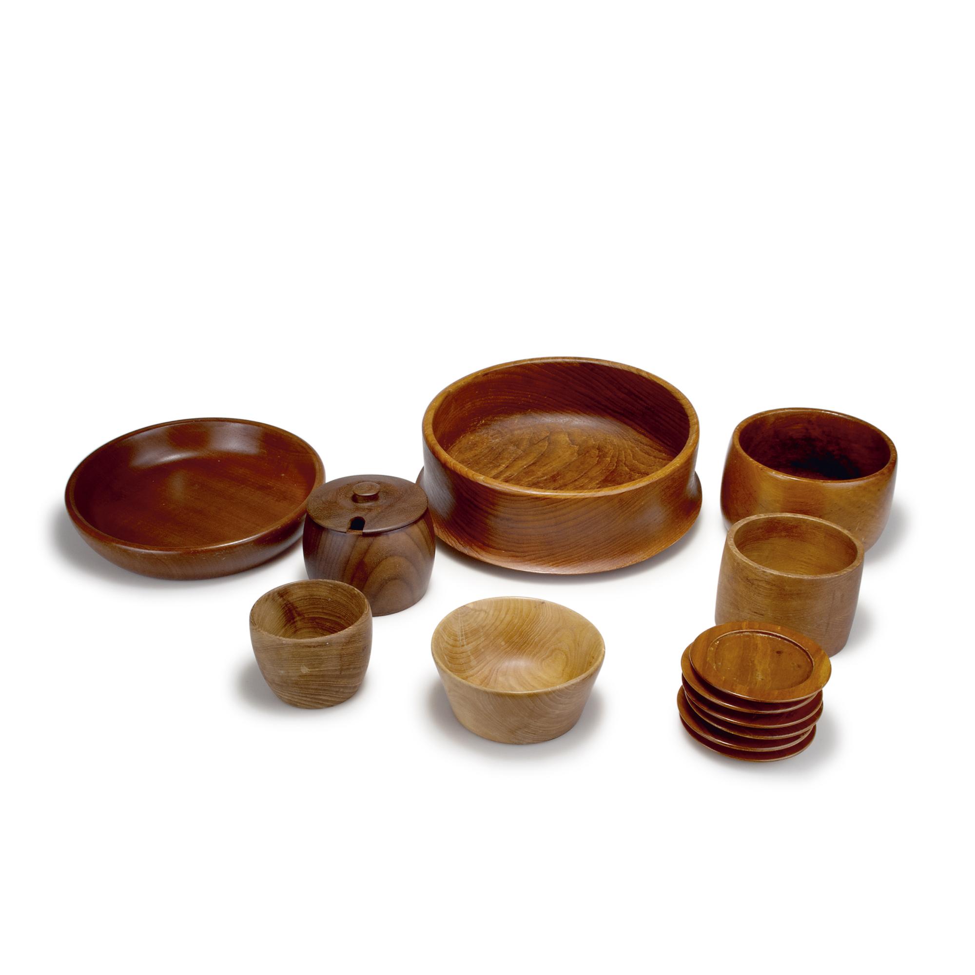 Konvolut aus sechs Schalen, einer Deckeldose und sechs Untersetzern, 1950er Jahre