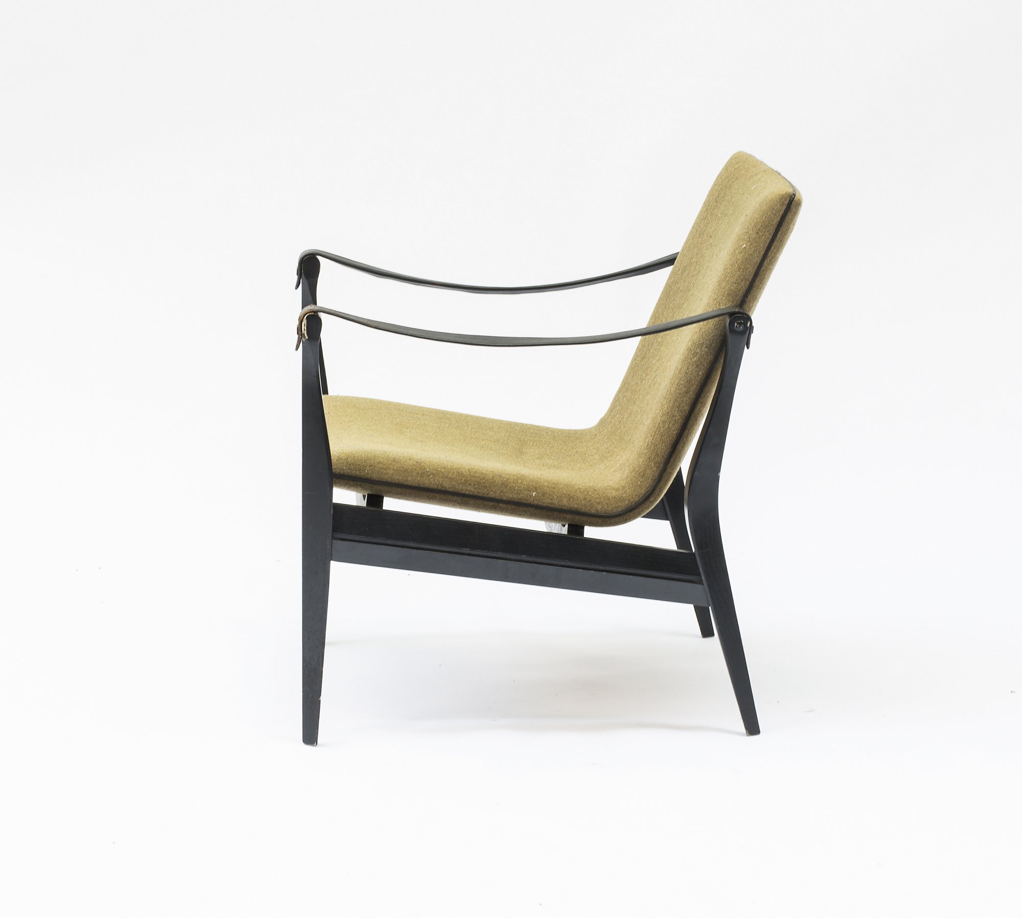 Holz, schwarz lackiert, schwarzes Leder, moosgrüner Textilbezug.