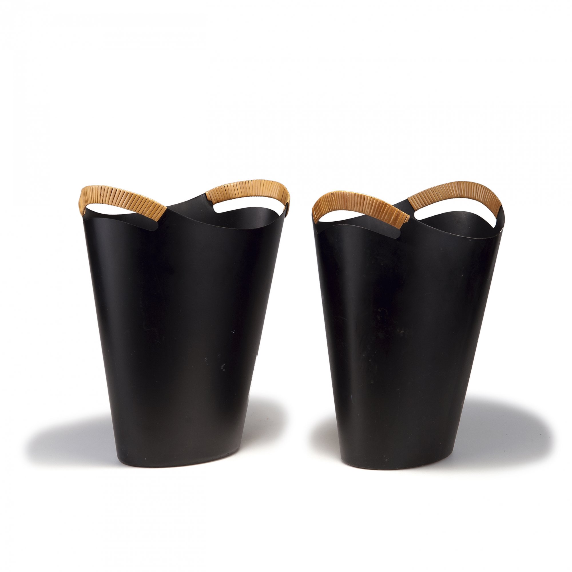 Metallblech, matt schwarz lackiert, Henkel mit Bast umwickelt.