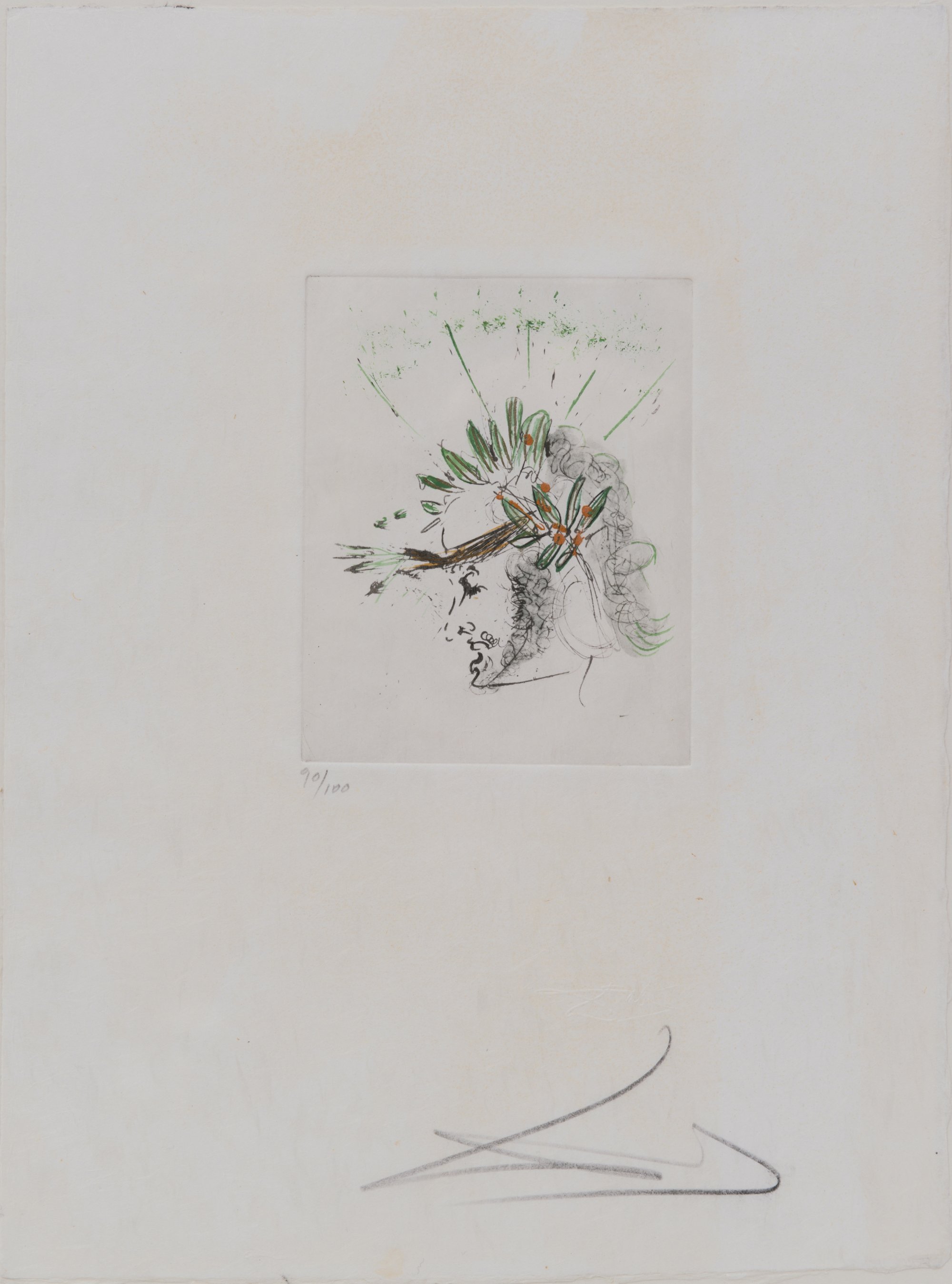 15,0 x 12,0 cm (Darstellung), 38,5 x 28,5 cm (Blatt). Kaltnadelradierung mit Roulette, handkoloriert, auf Japan. Oberhalb des unteren Randes sign.: Dalí, rechts unterhalb der Darstellung nummeriert (Bleistift) und Prägestempel Dalí. Ex. 90 von 100. Verso auf Unterlagekarton Galeriestempel der Galerie Christine Weiden/Amberg. Unter Glas gerahmt.