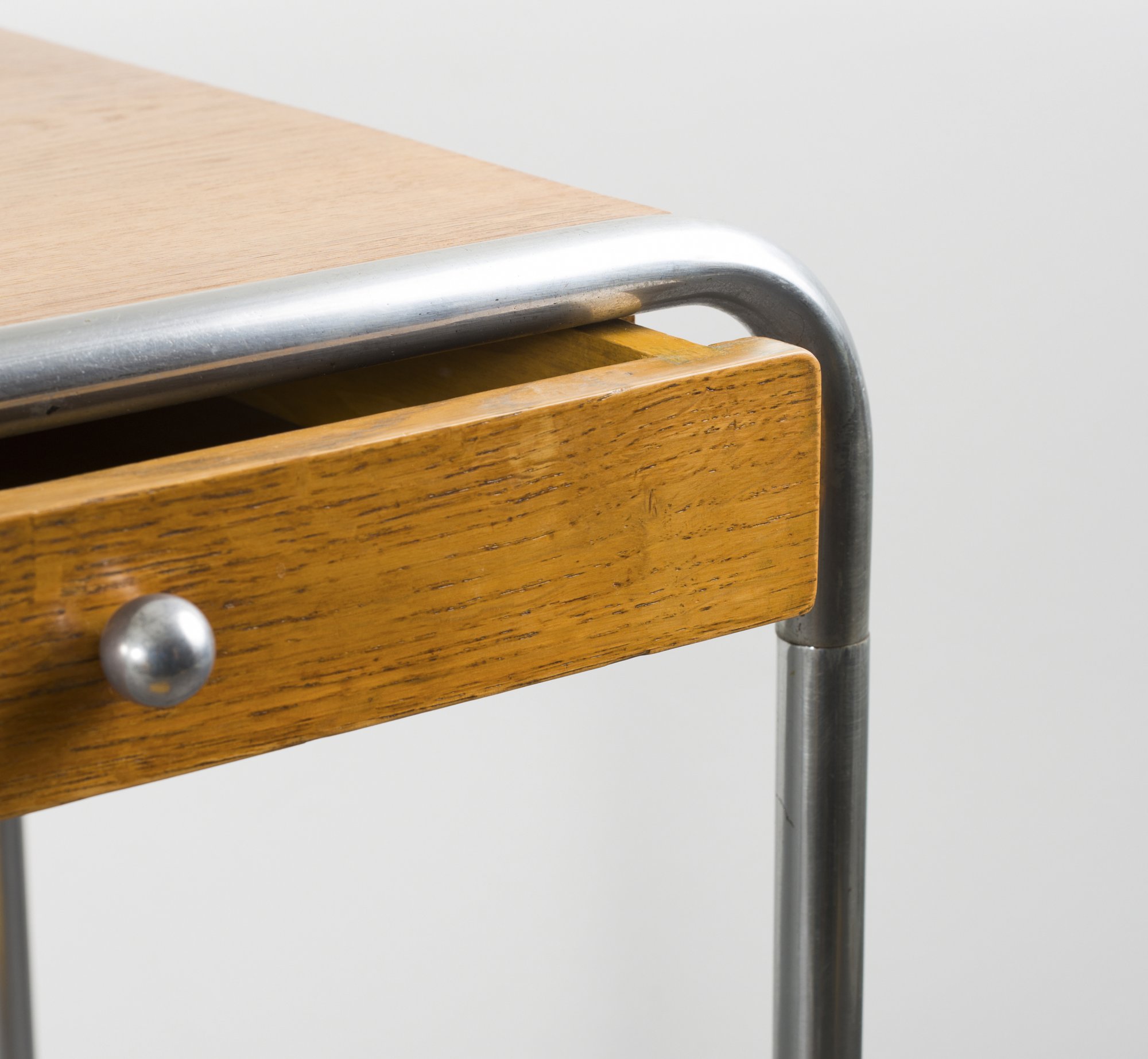 Stahlrohr, verchromt, Holzkastenkonstruktion mit Rüsterfurnier.