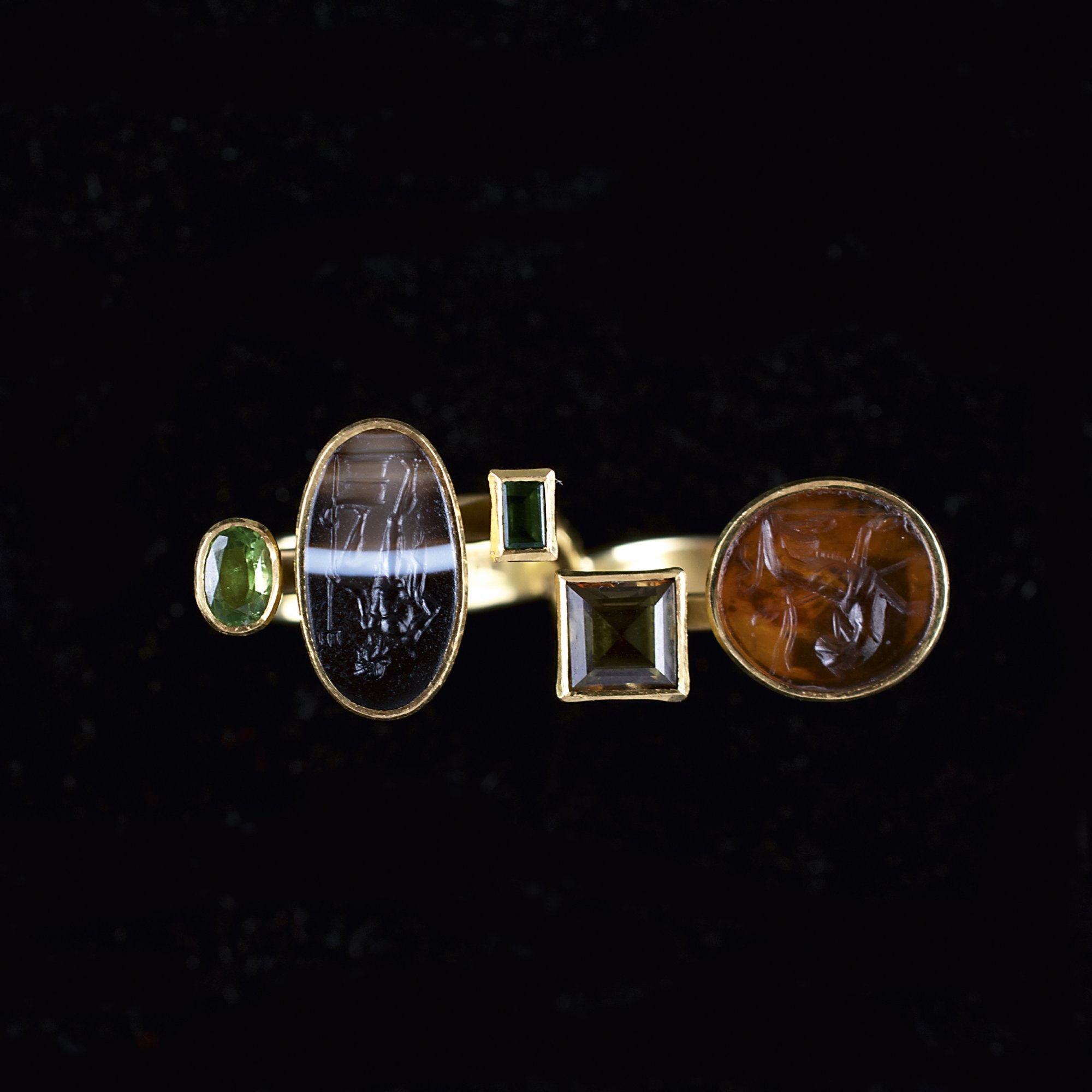 Ringstärken 53 und 55. 18 Kt. Gelbgold mit römischer Karneolgemme, Andalusit, Smaragd, griechische Onyxgemme und Demantoid. Bez.: PGH 750.