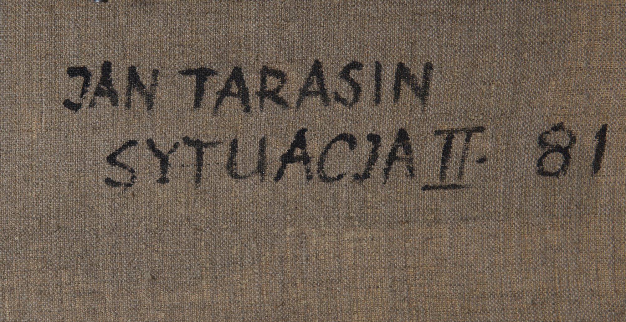 100,0 x 130,0 cm. Öl auf Leinwand. Rechts unten sign.: Jan Tarasin und datiert (19)81 (öl). Verso sign.: Jan Tarasin, datiert (19)81 und betitelt: Sytuacja II. Verso oben auf dem Keilrahmen Klebeetikett der 'Centraline Biuro Wystow Artystycznyck' in Warschau.