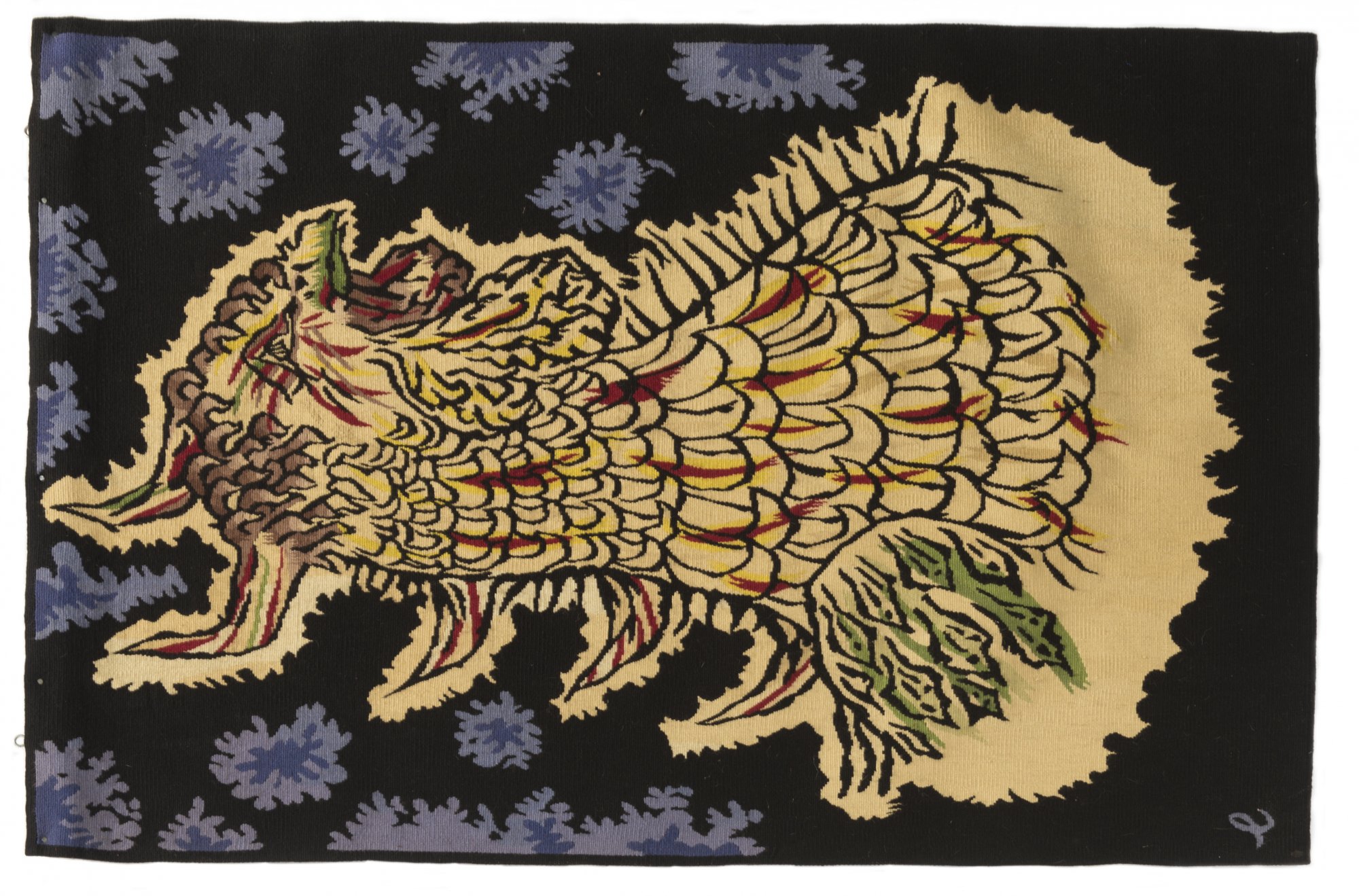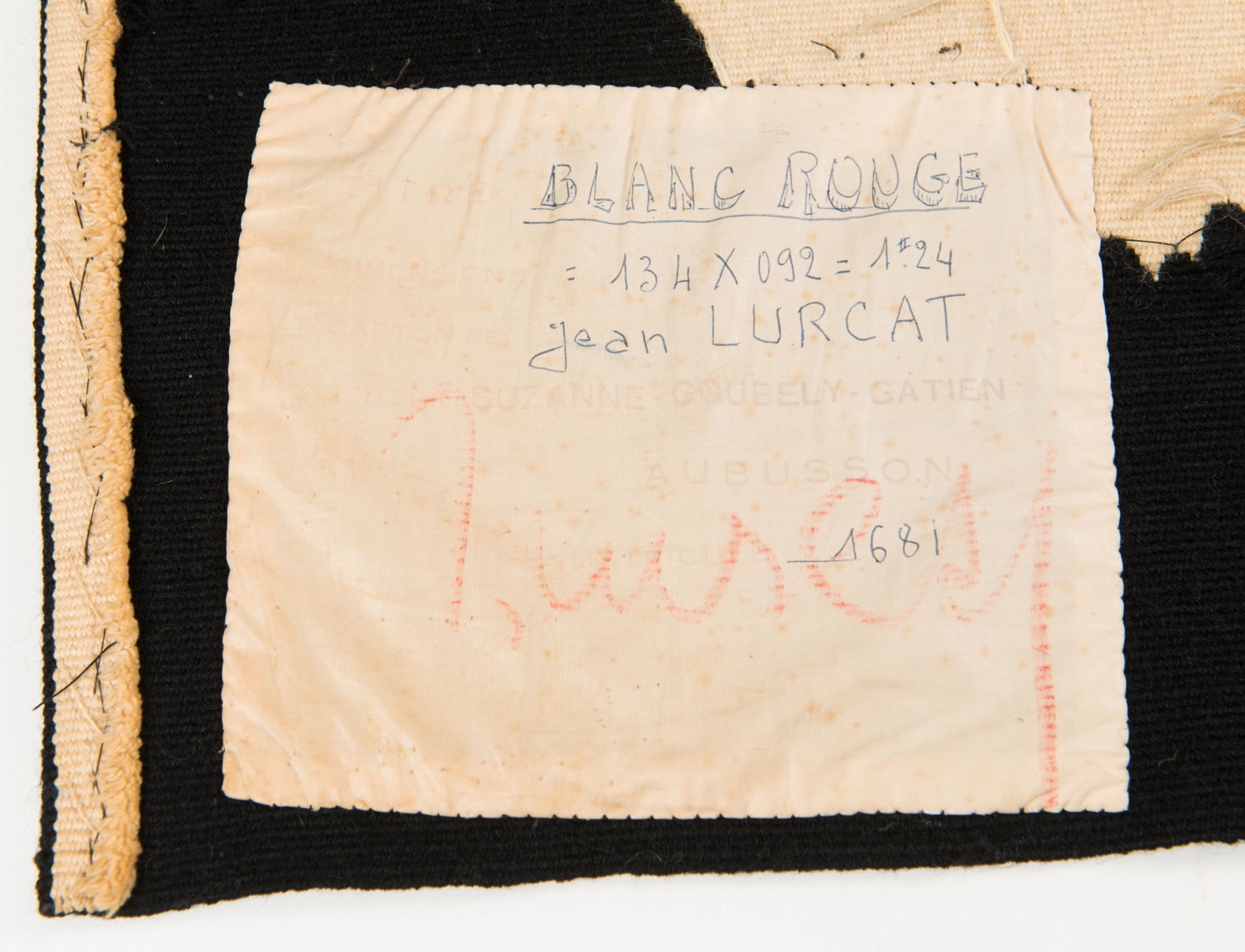 Eingewebt: l, Rückseite: verblichenes Herstelleretikett mit allen Angaben (teilweise mit Kugelschreiber nachgemalt, bez.: Blanc-Rouge) und Signatur Lurçat.