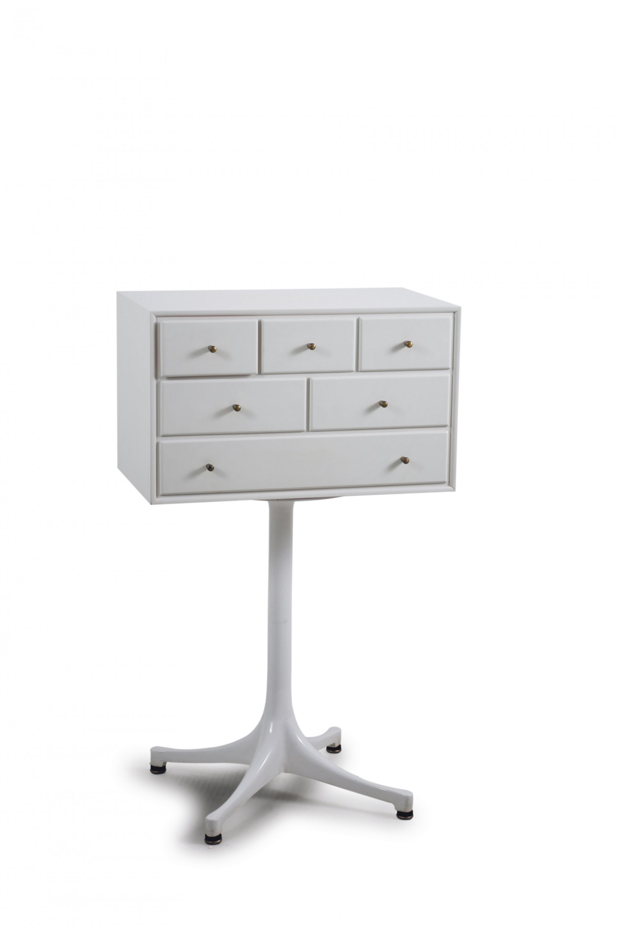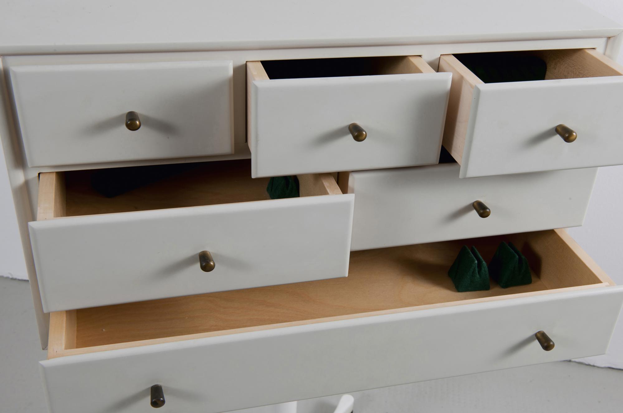 Holzkorpus und Aluminiumguß, weiß lackiert, Messinggriffe.