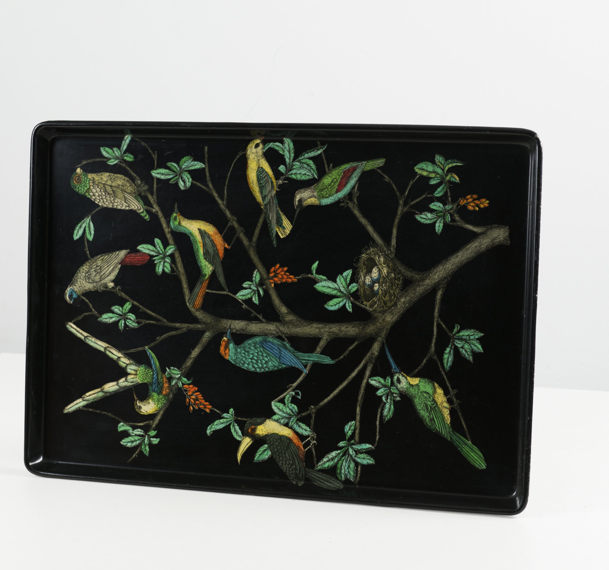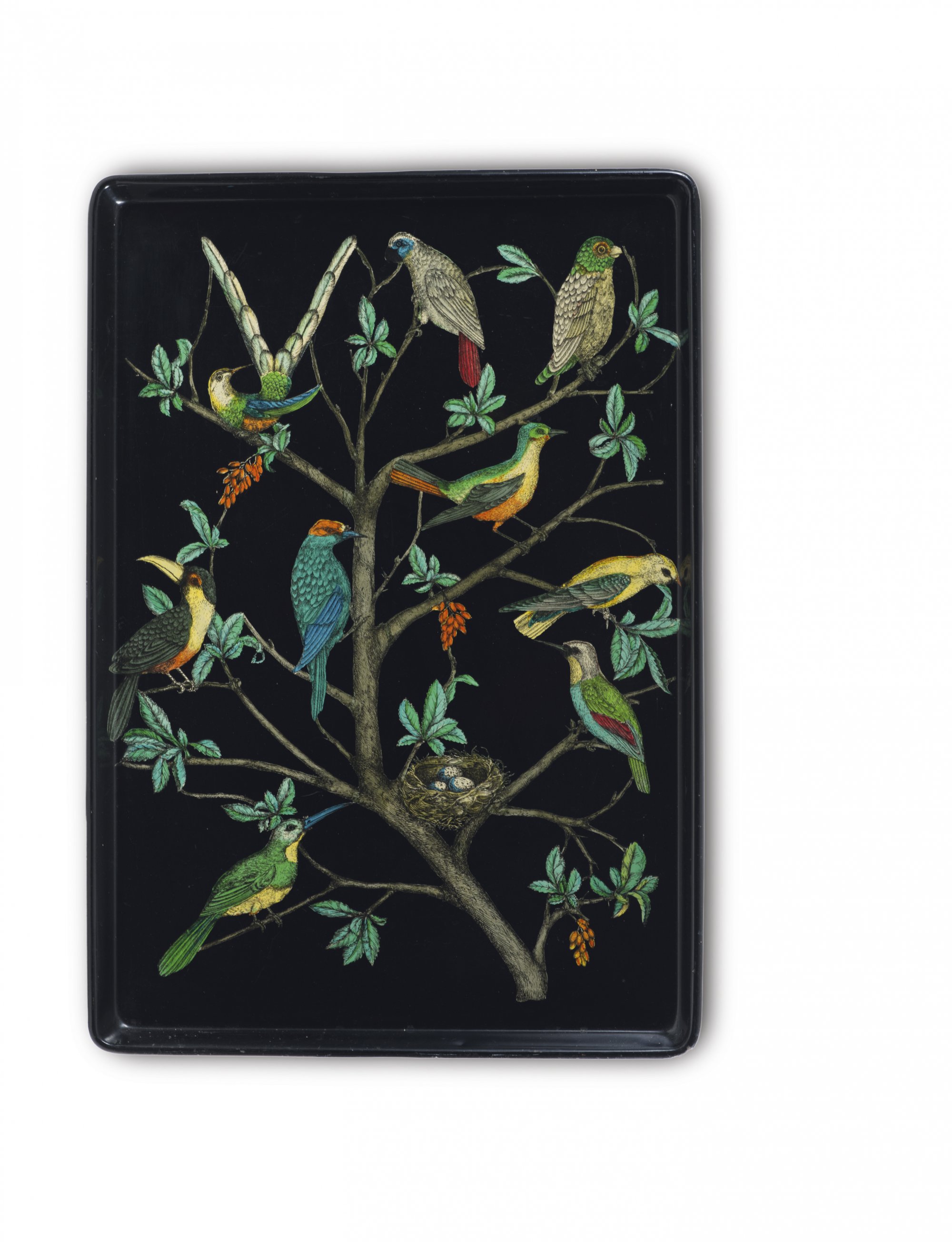 Metallblech, schwarz lackiert mit polychromem Vogelmotiv.