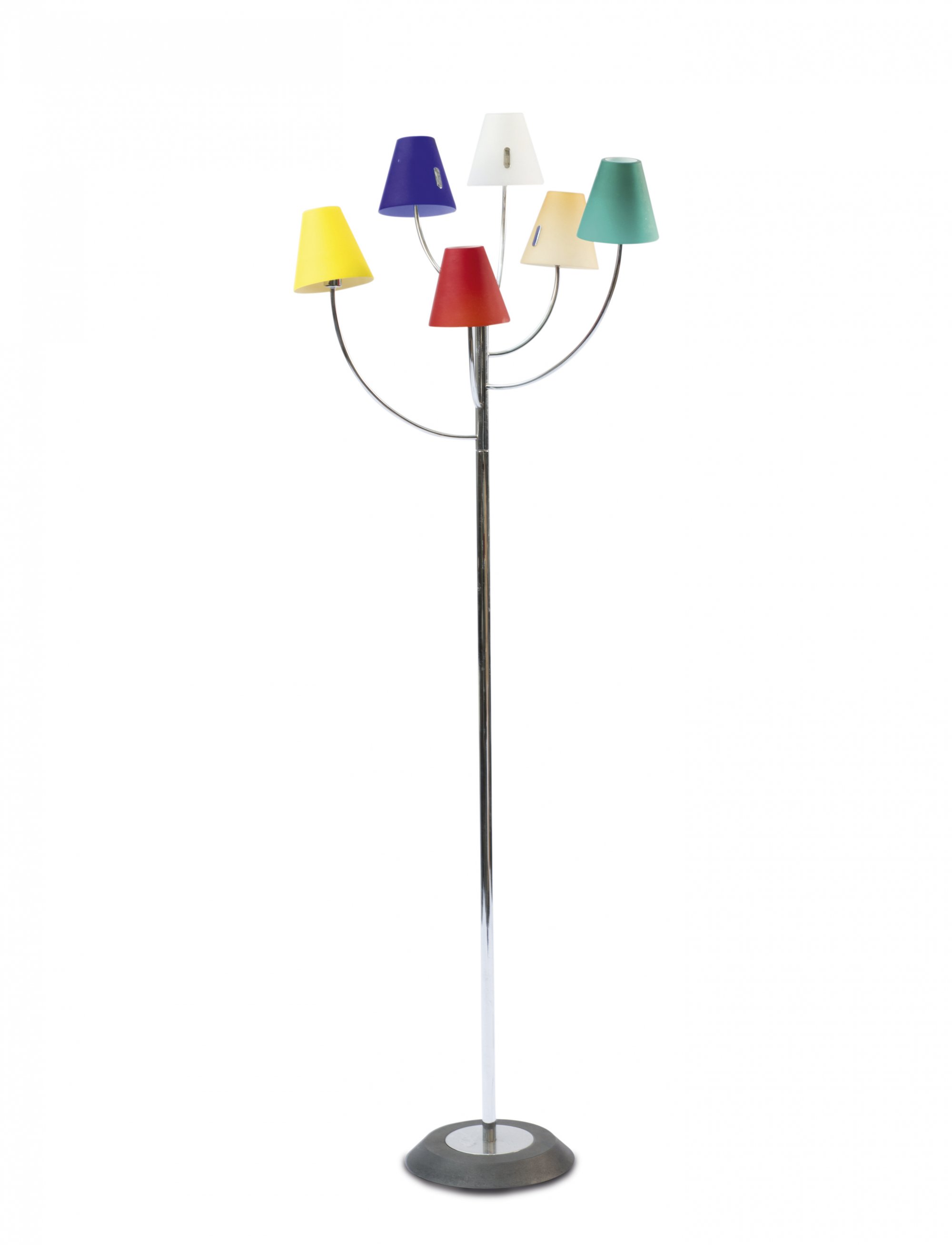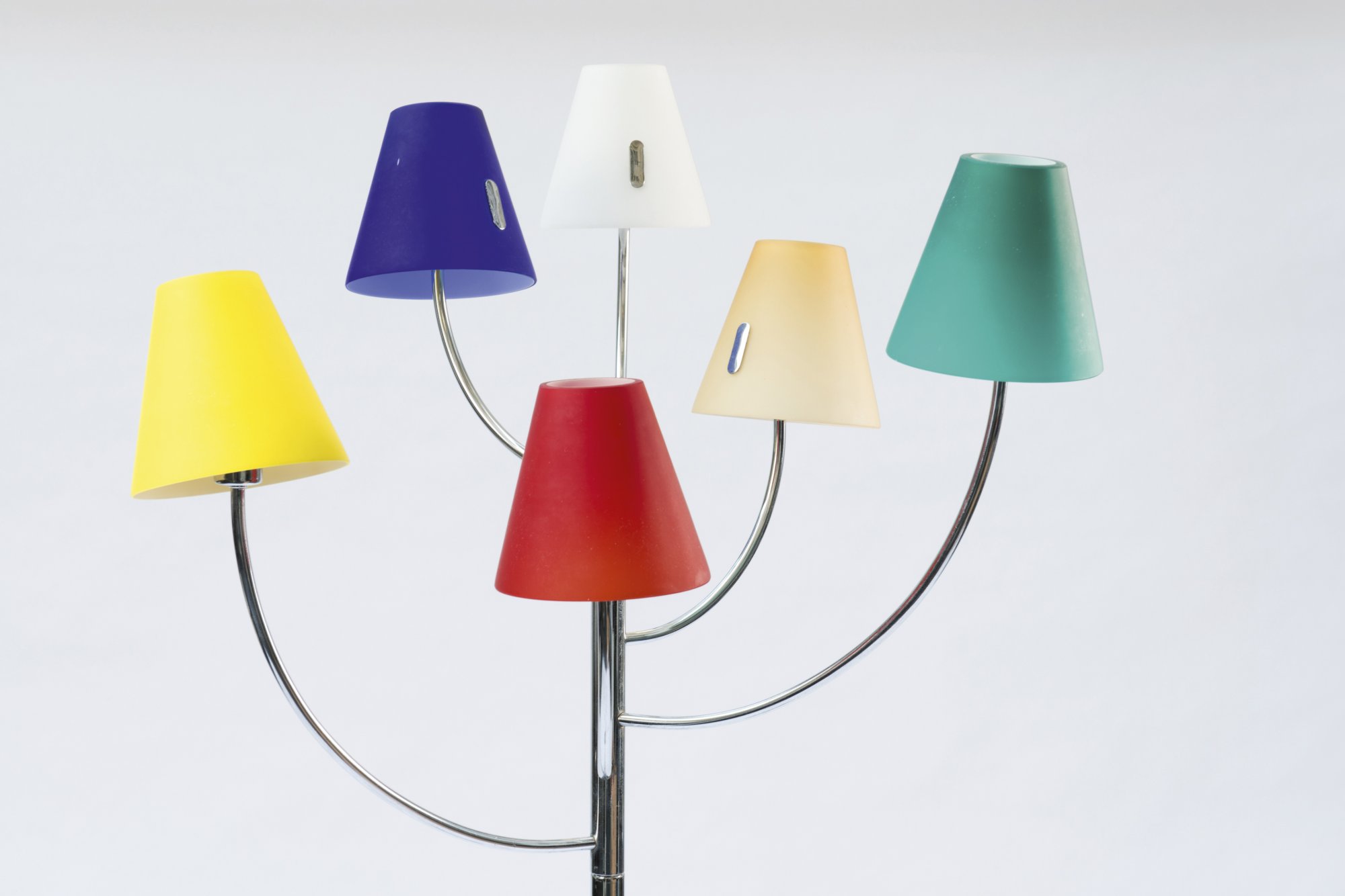 Eisenguß, Stahlrohr, verchromt, farbiges Glas.