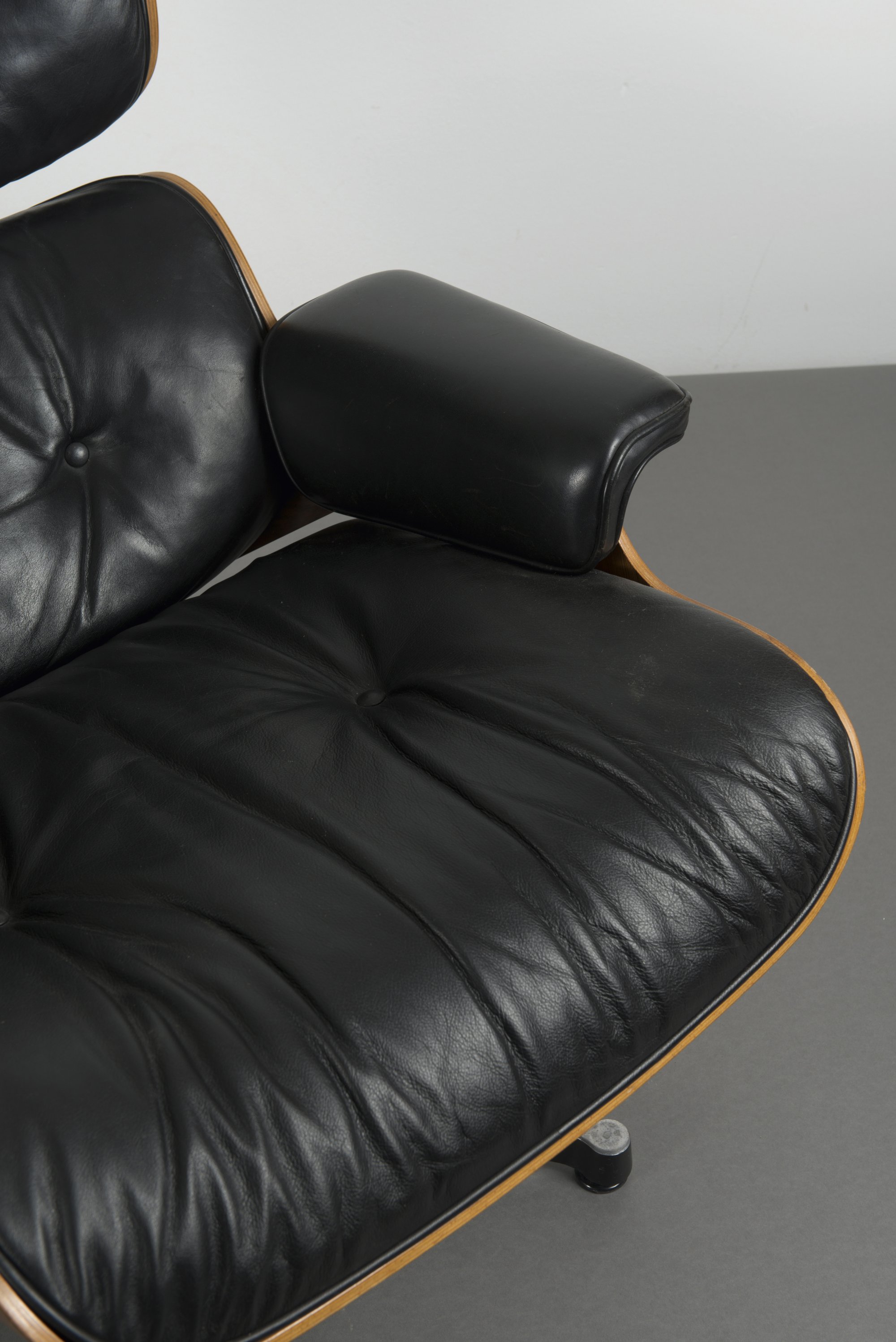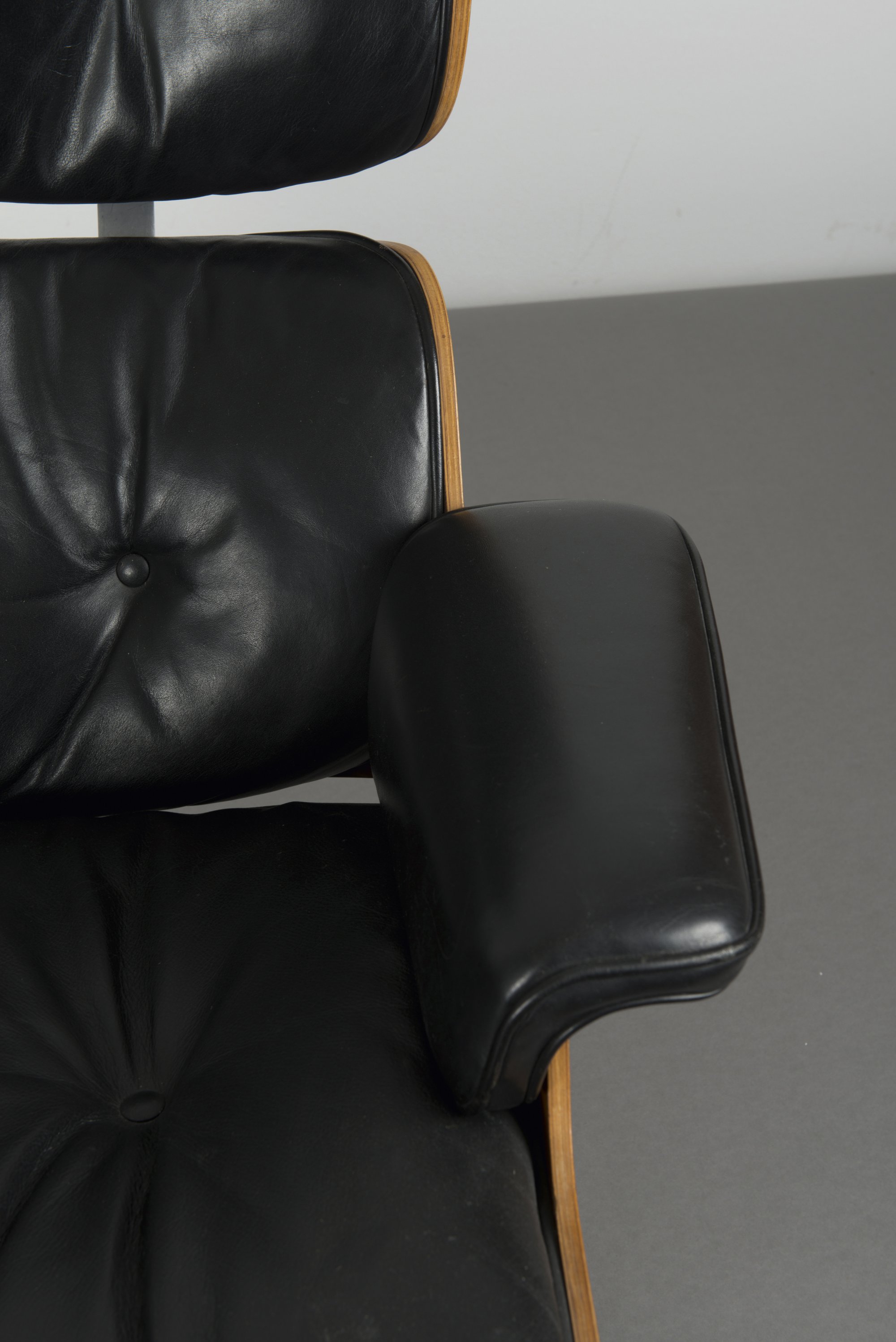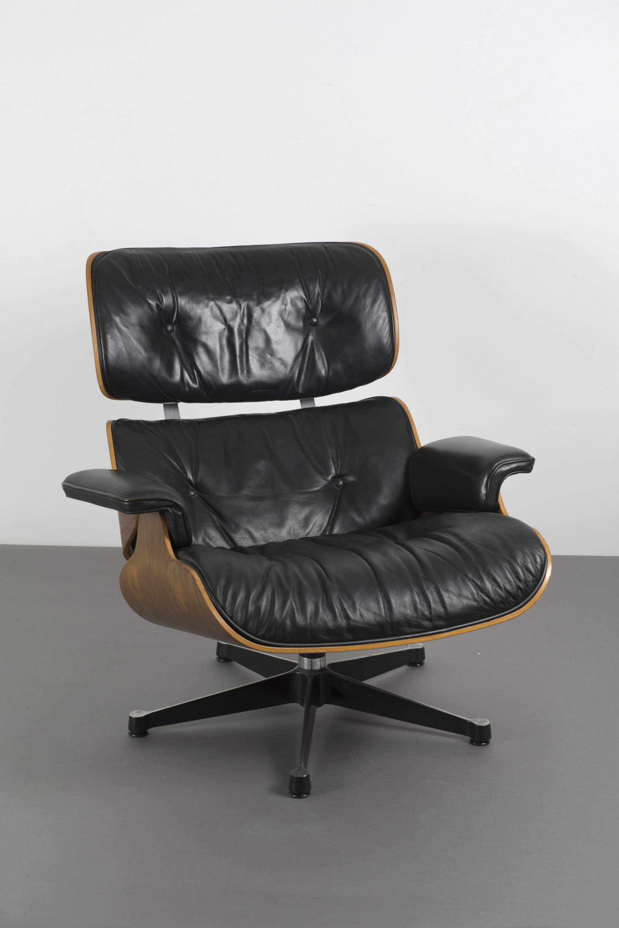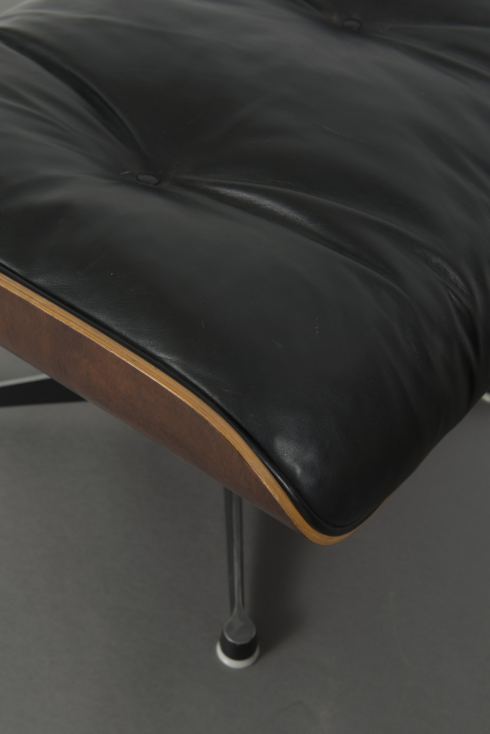 Schichtholz mit Palisanderfurnier, schwarzes Leder, Aluminiumguß, teilweise schwarz lackiert.