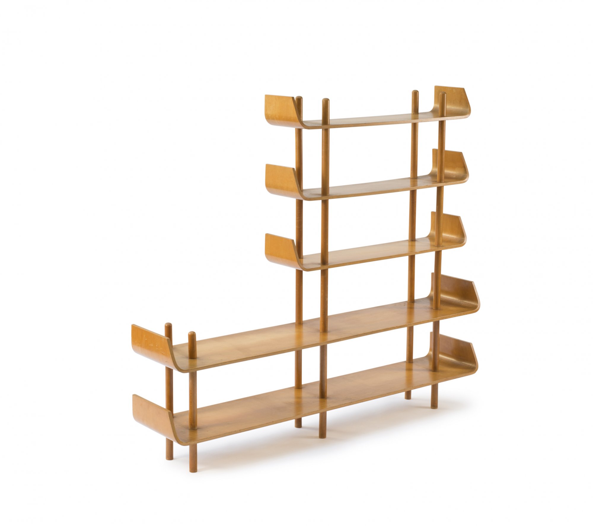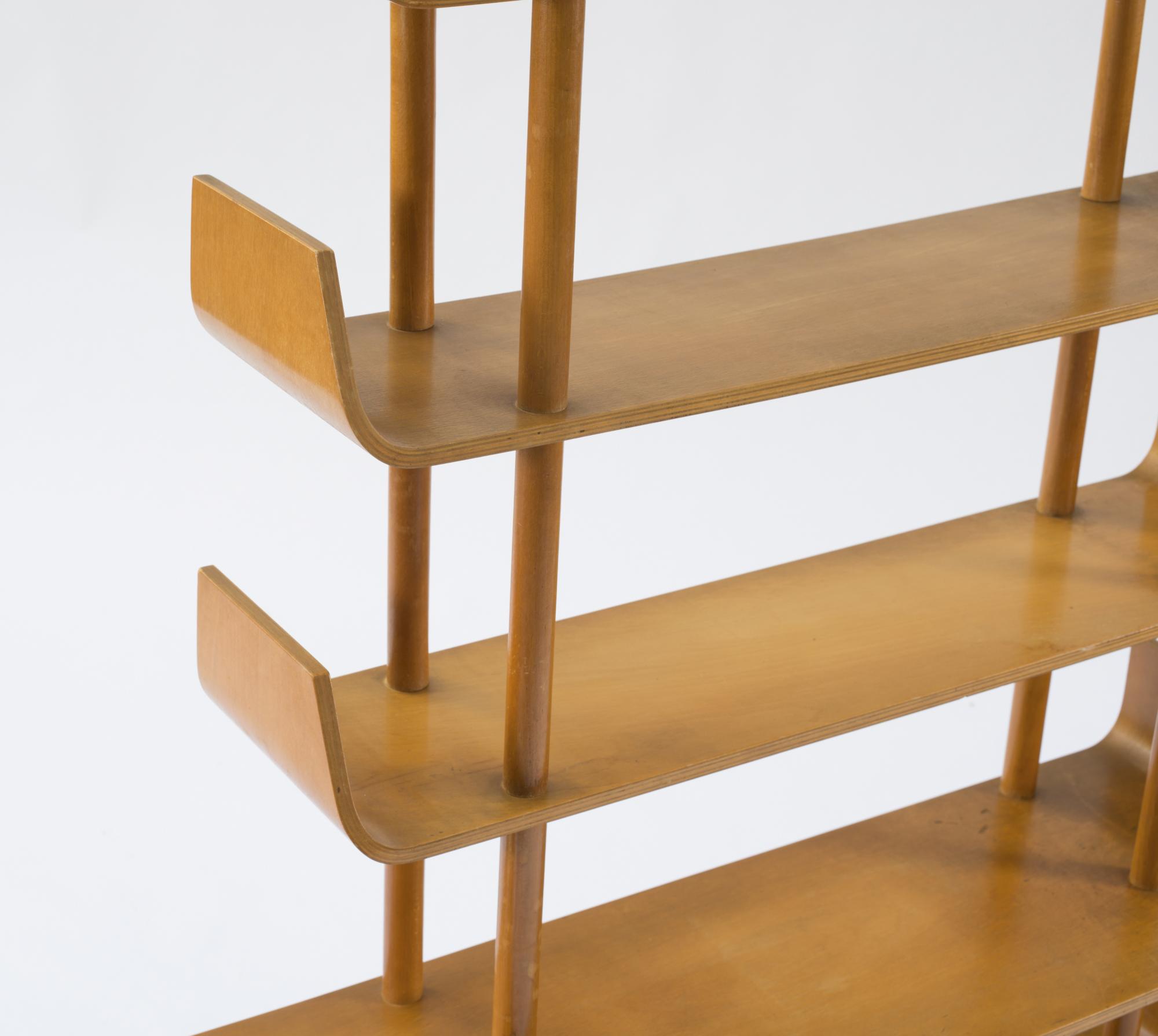 Ein besonders gelungenes Beispiel zeitlosen Designs der Nachkriegszeit. Mit den günstigen und sehr leichten Materialien Buchensperrholz und Buchenrundhölzern gelang Wilhelm Lutjens ein minimalistisch zurückhaltender, eleganter, fast japanisch anmutender Entwurf der sowohl als Wandregal als auch als Raumteiler verwendet werden kann.