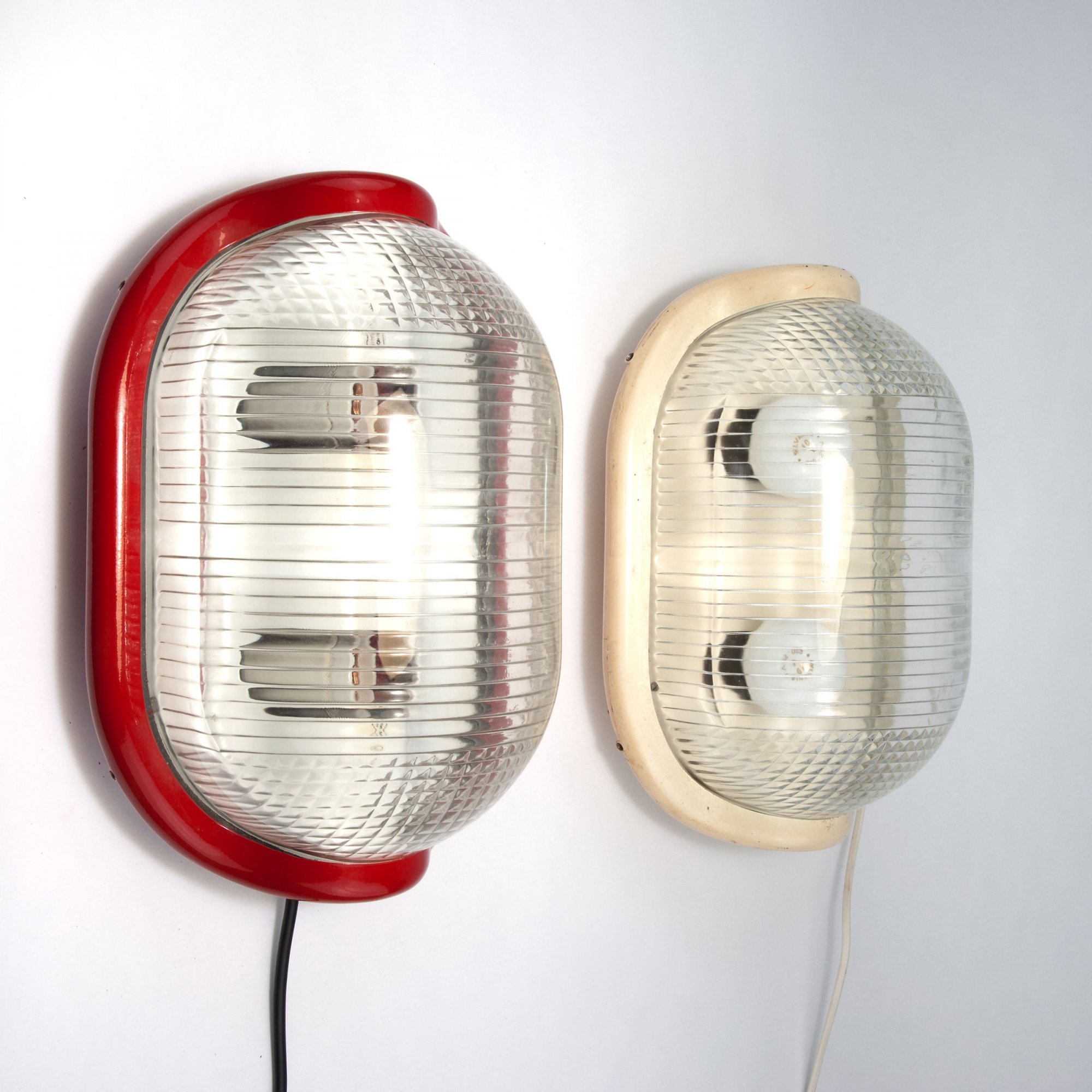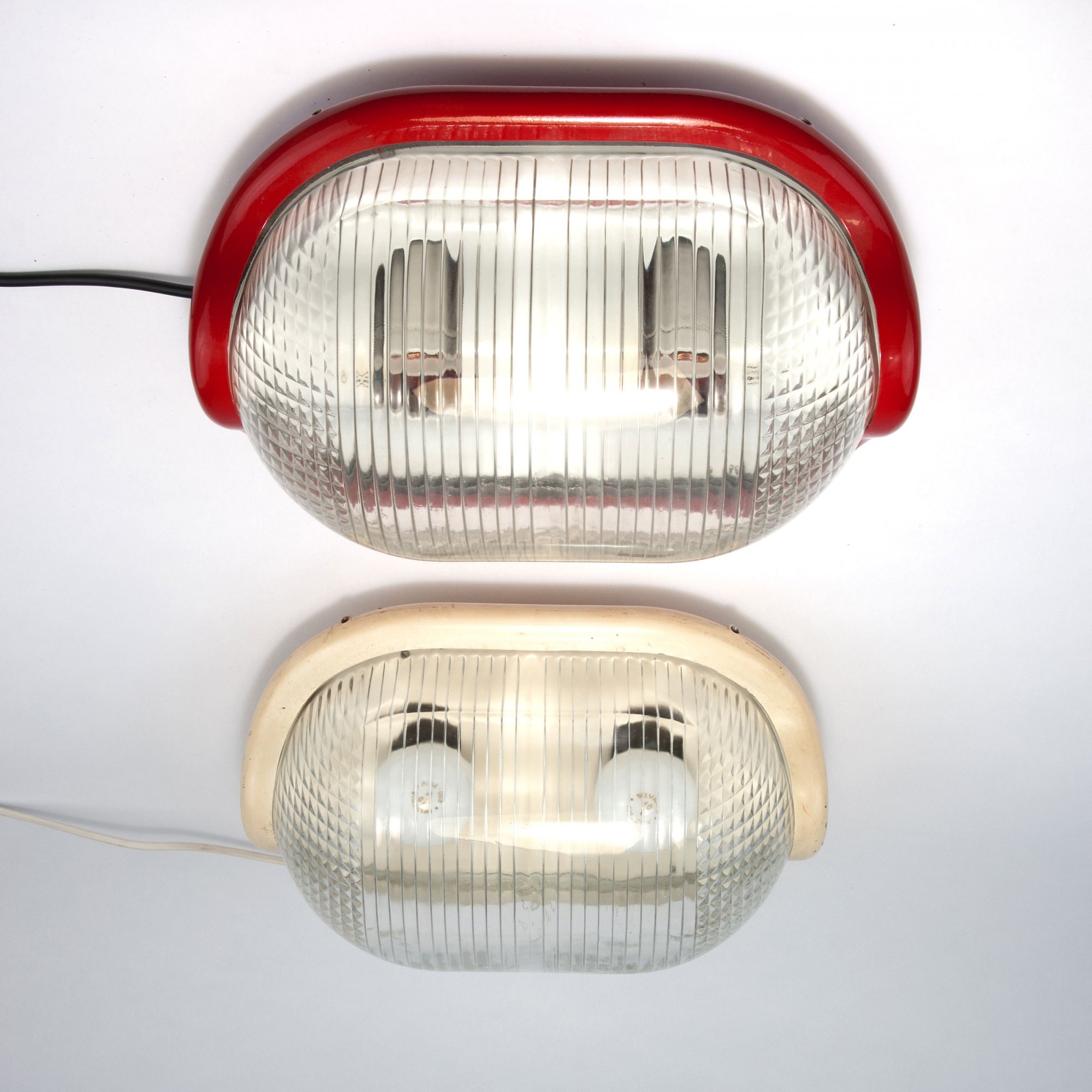Aluminiumdruckguß, weiß bzw. rot lackiert, farbloses Preßglas.
