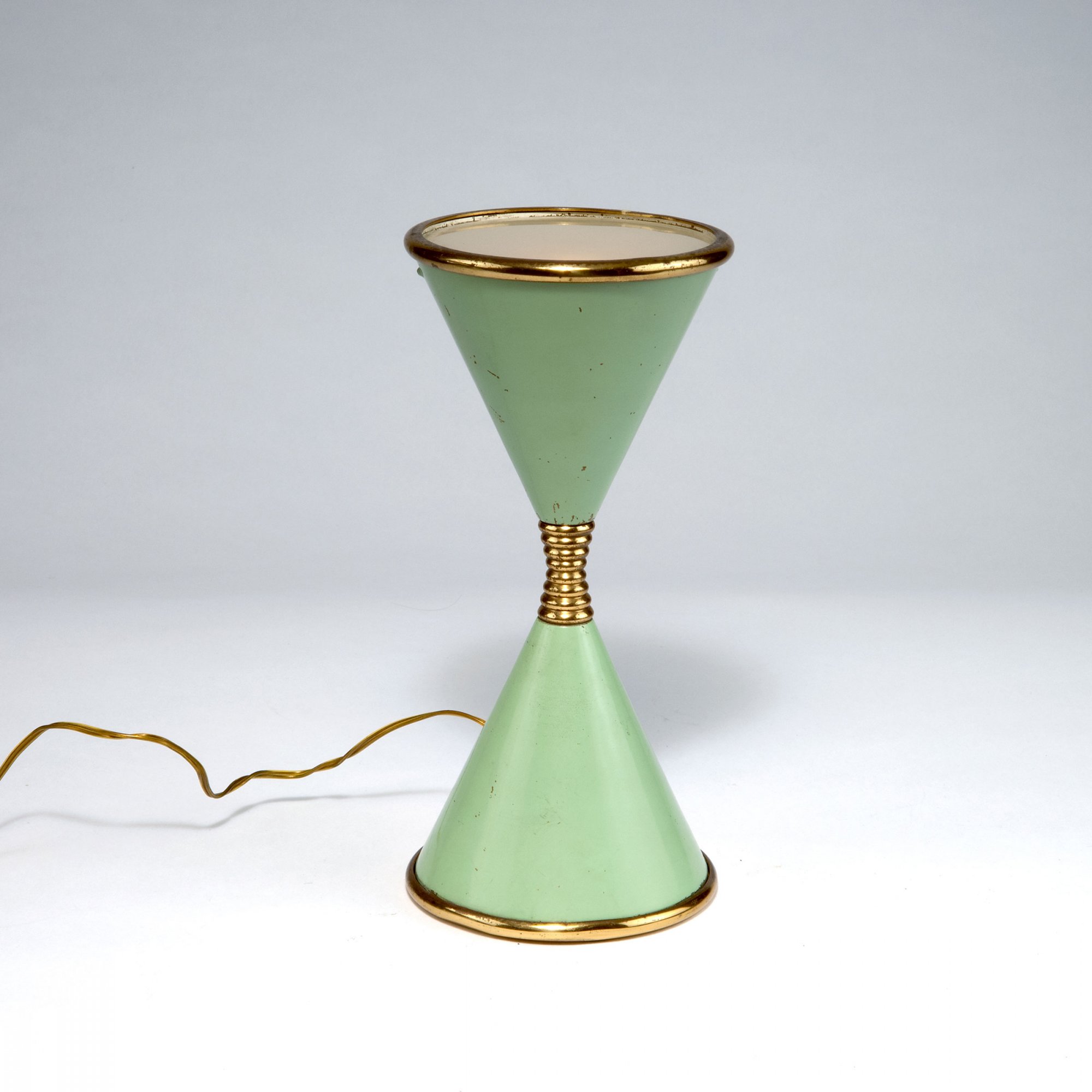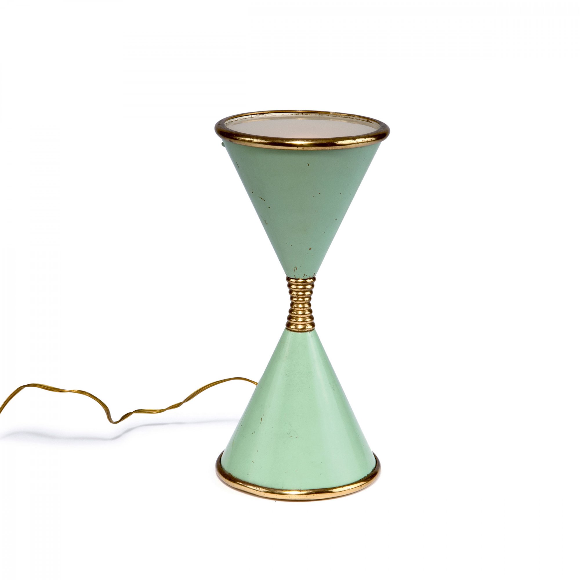 Messingblech, teilweise mintgrün lackiert, mattiertes Glas.