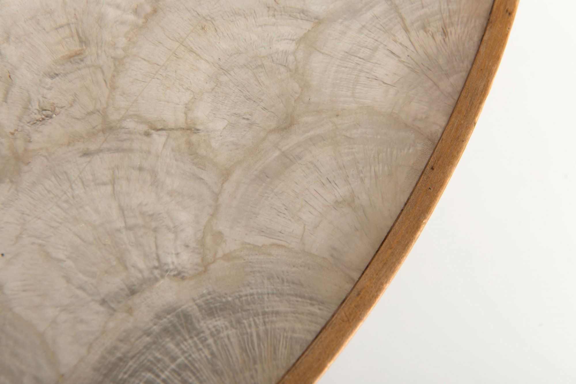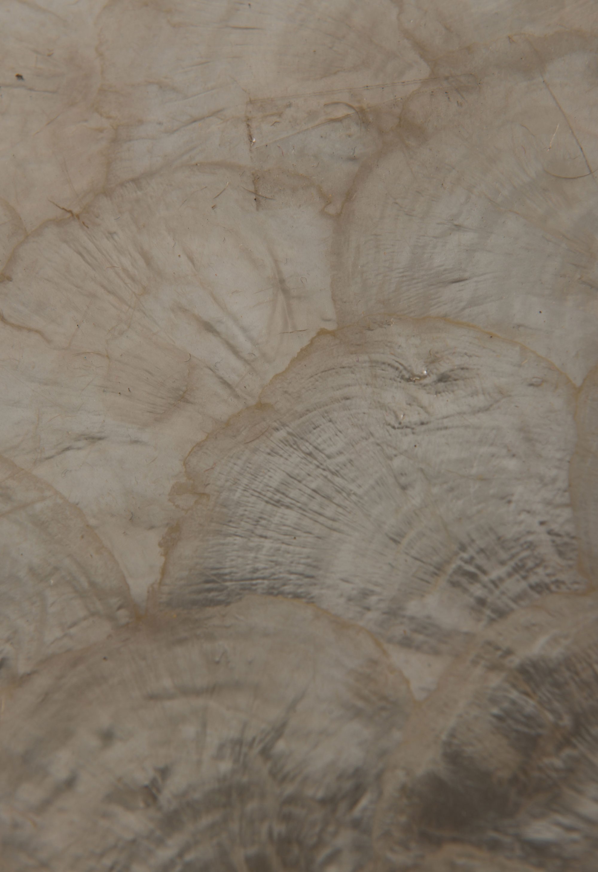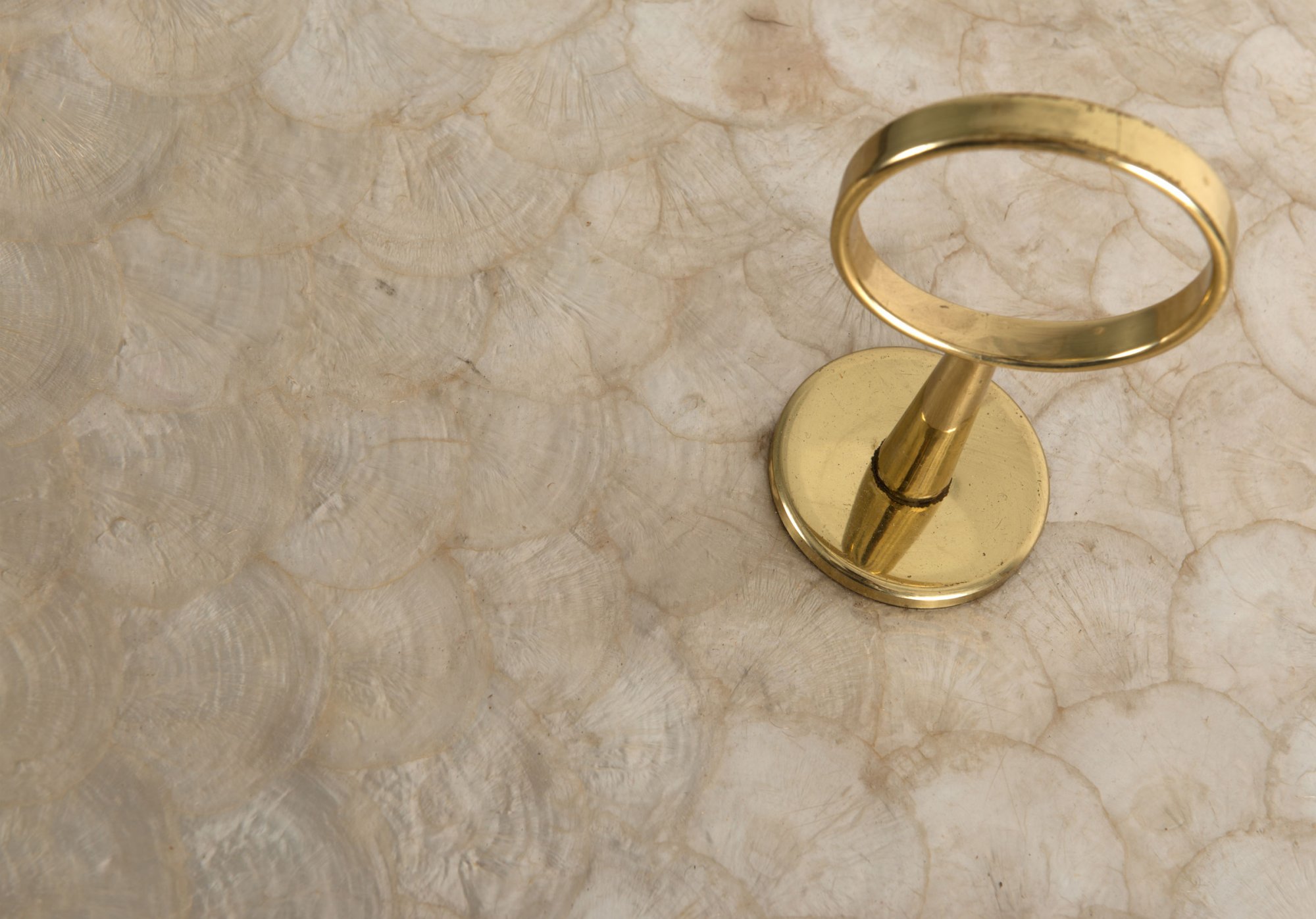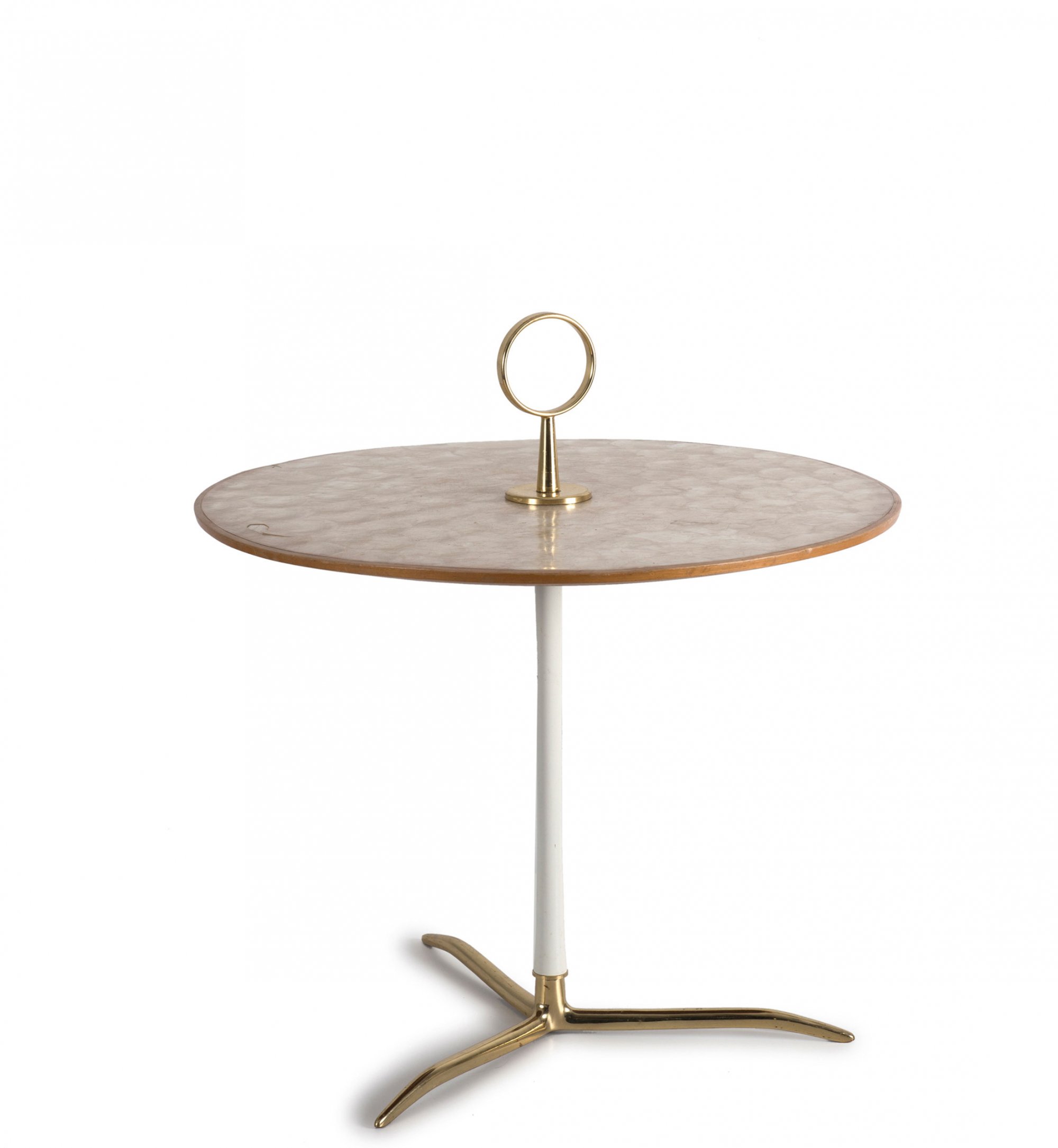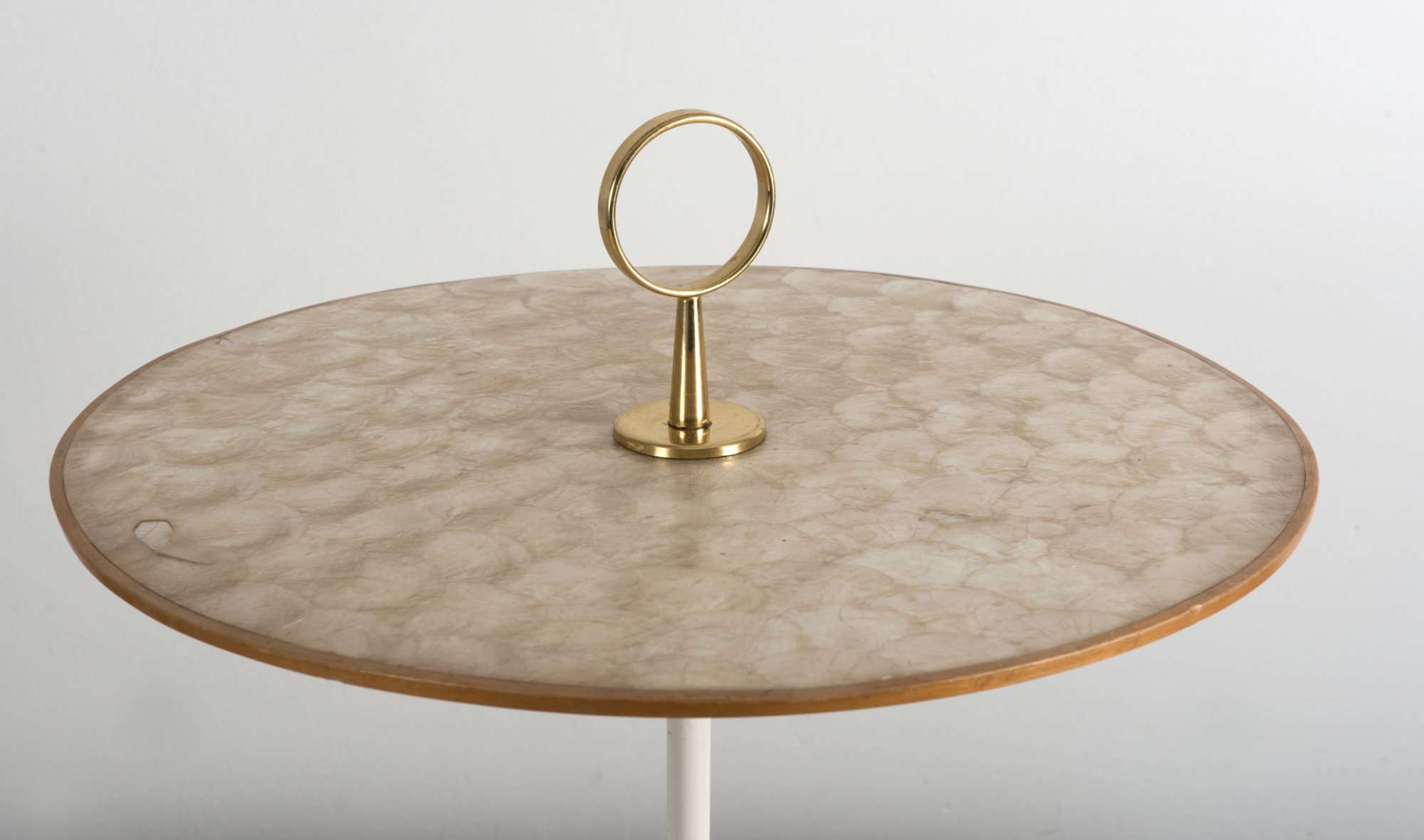 Messingrohr, teilweise weiß lackiert, Holzplatte mit eingelegtem Perlmutt, darüber farbloser Lack.