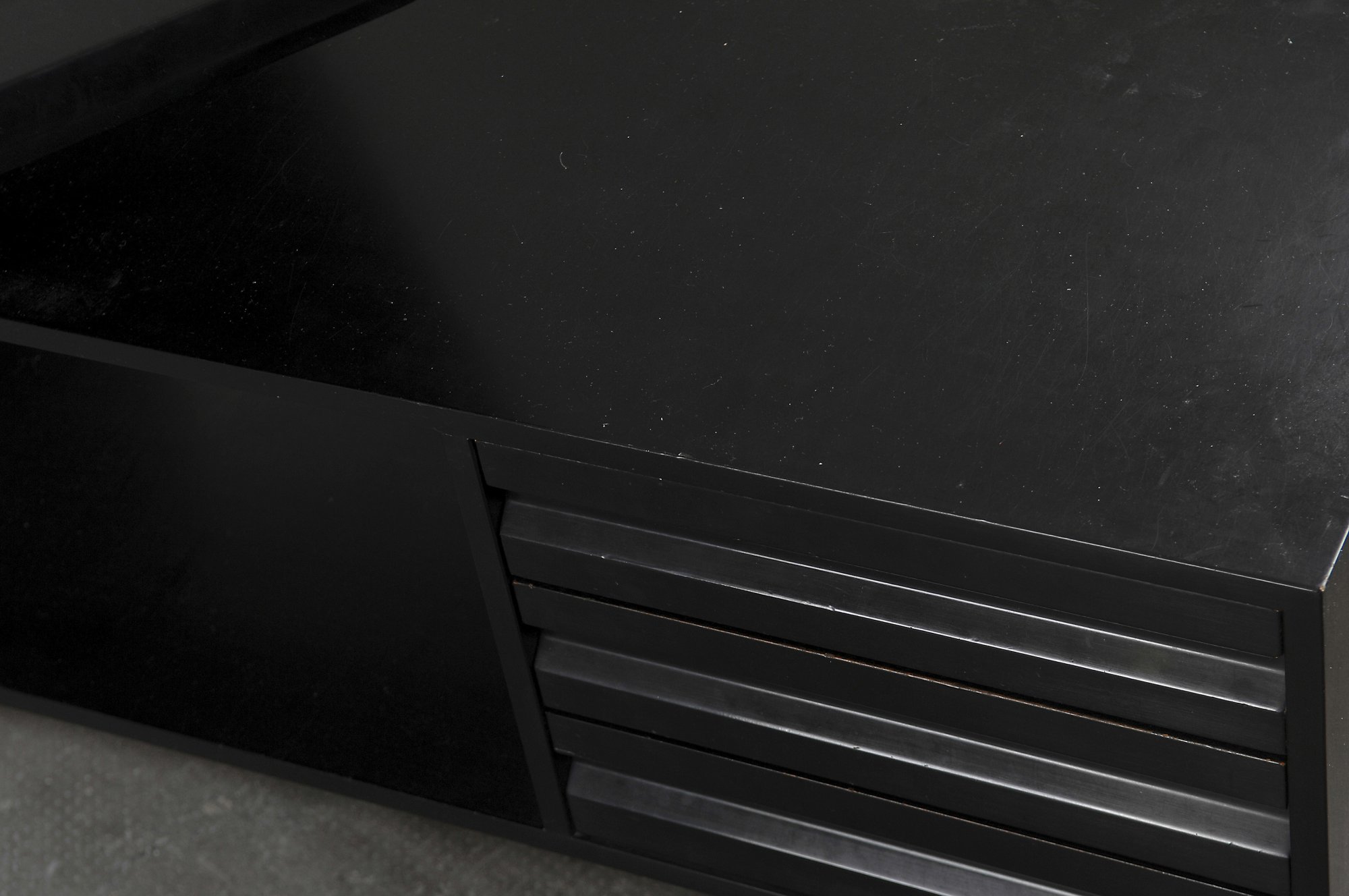 Frei schwenkbare Aktenablage und Kasten mit Schubfächern.