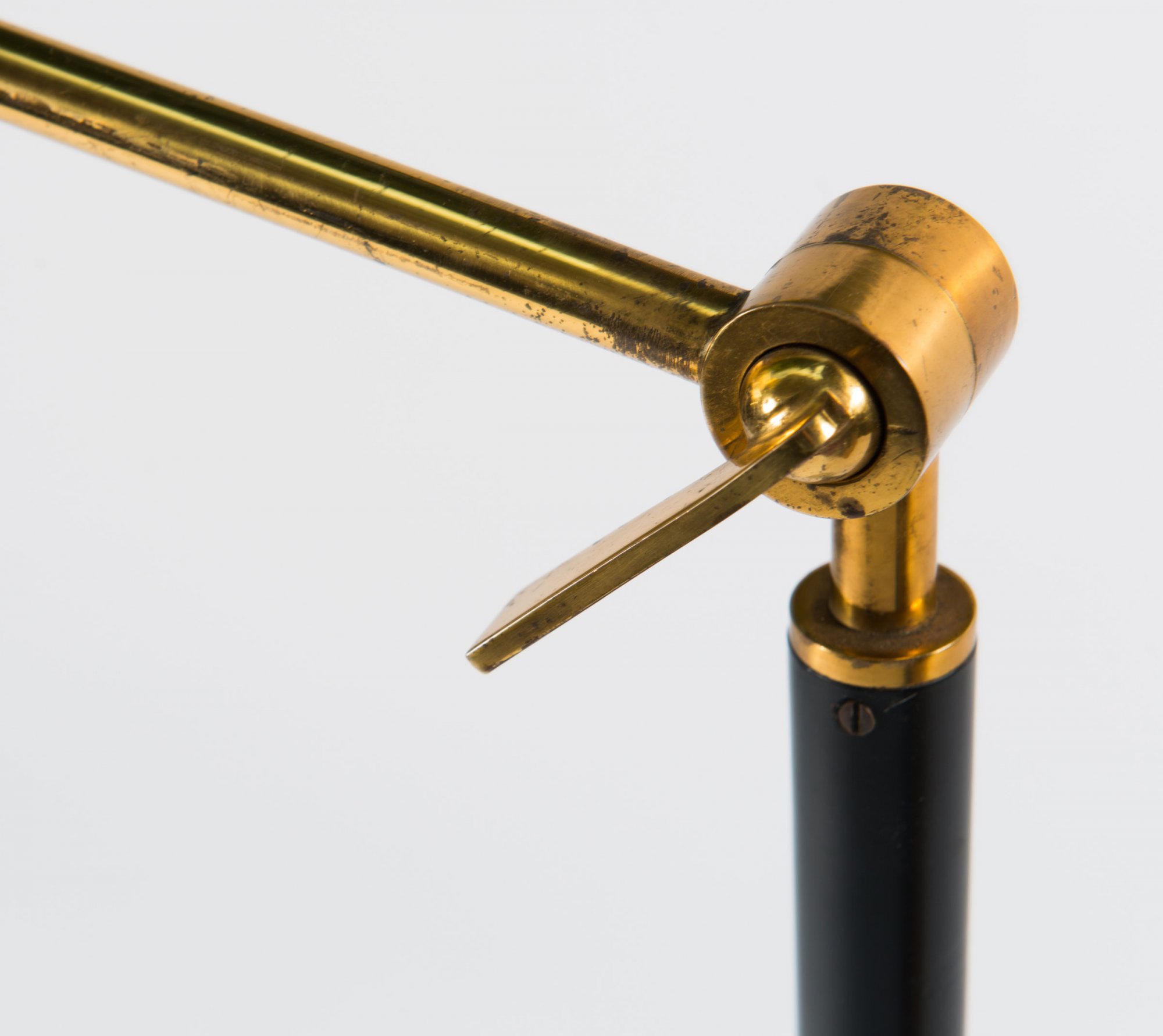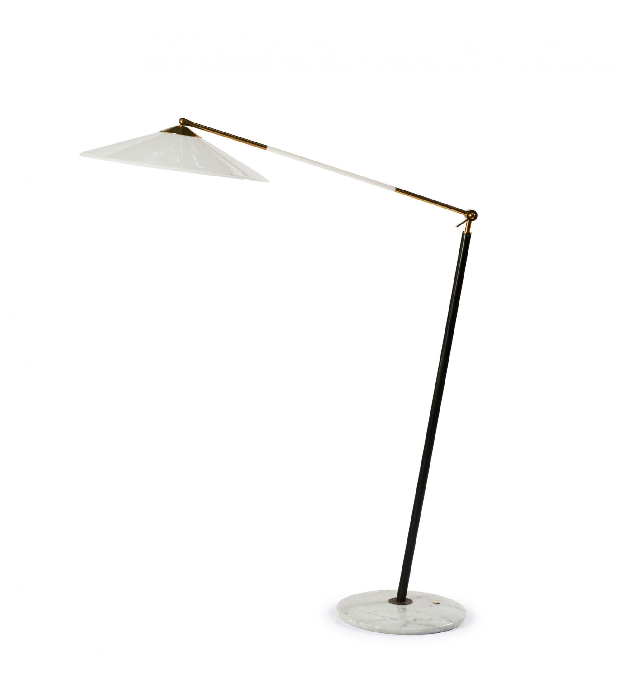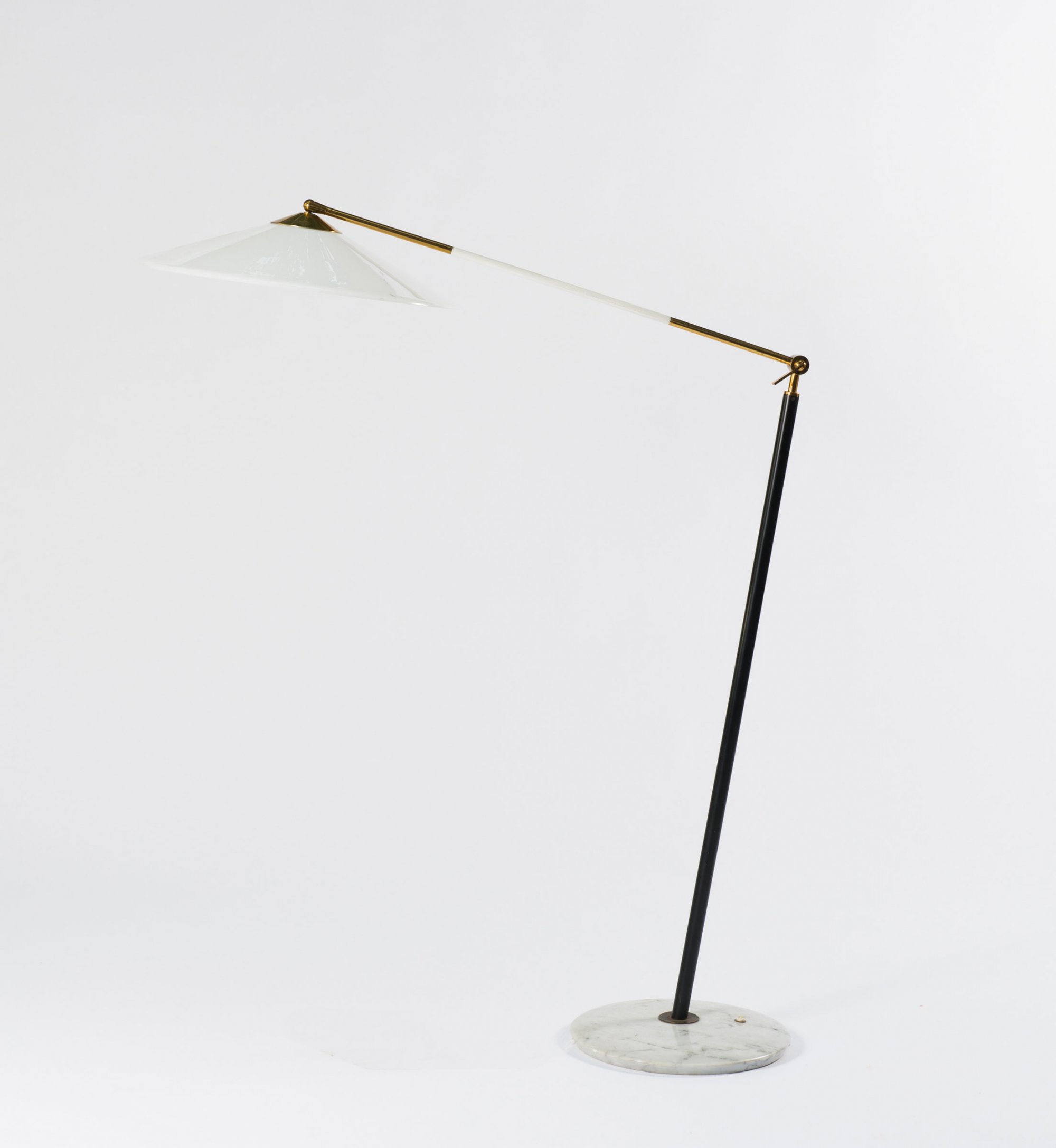 Weißgrauer Marmorfuß, Messingrohr, teilweise schwarz bzw. weiß lackiert, weißer Kunststoffschirm.
