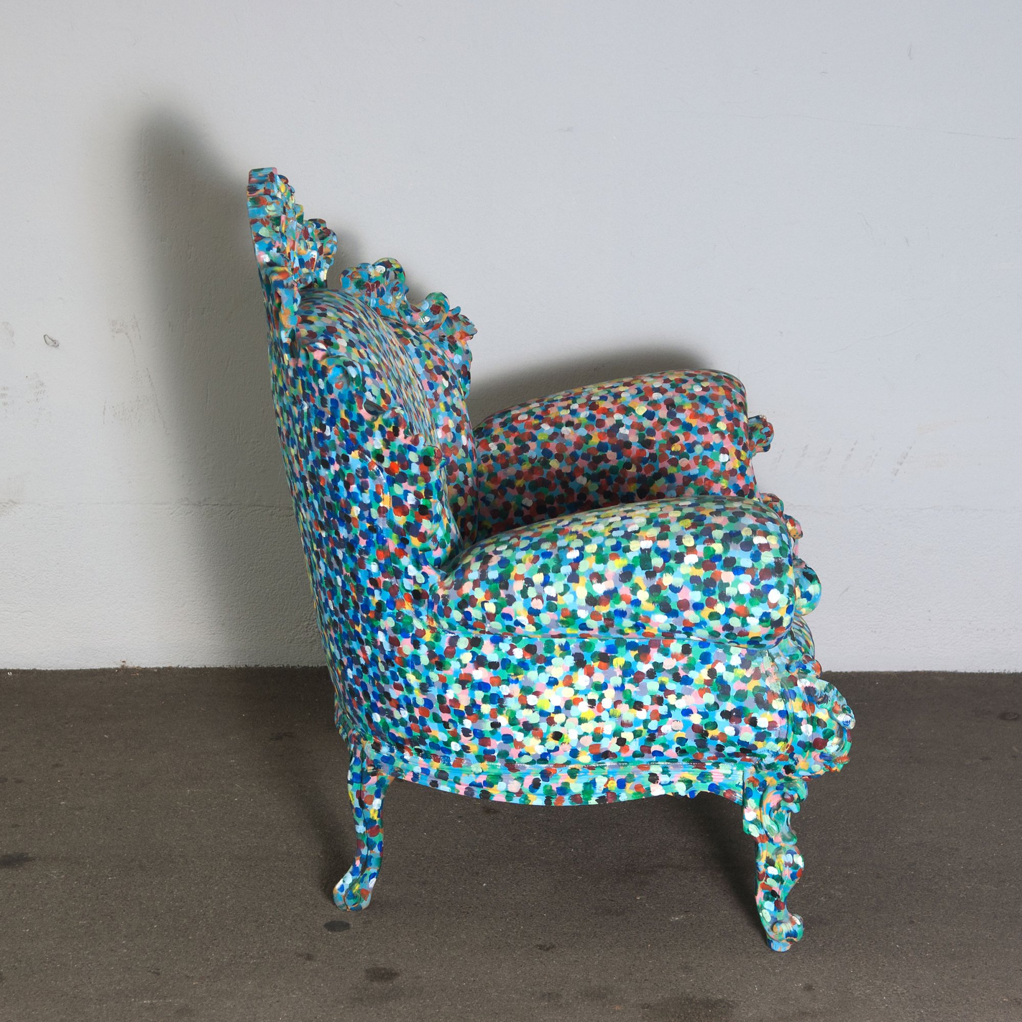 Der Sessel wurde von Alessandros Tochter, Claudia Mendini, im Studio Mendini handbemalt. 10 cm langer Riss im Bezug auf der Rückseite des Sessels. Der Riss wird auf Wunsch beim Studio Mendini auf Kosten des Einlieferers repariert.