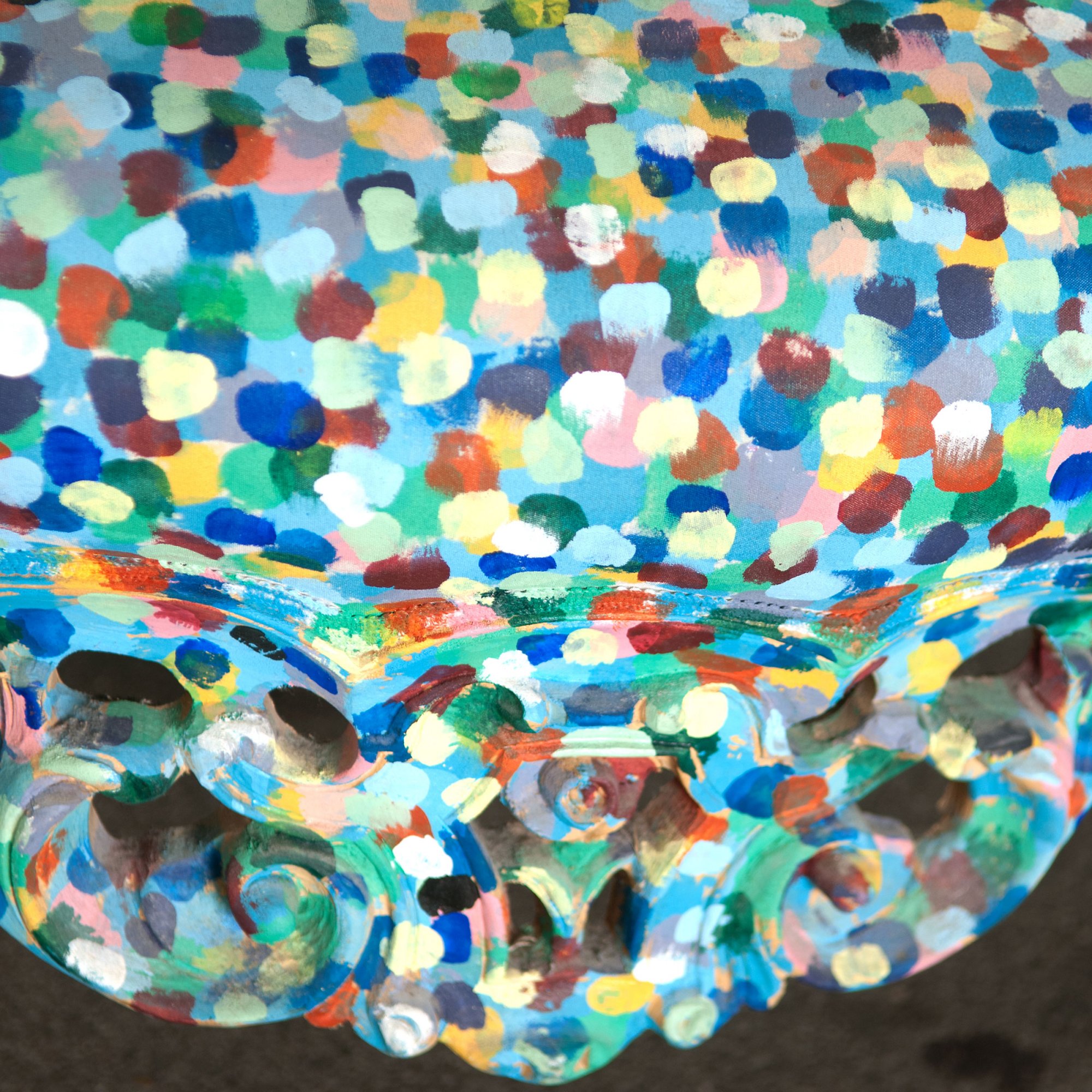 Holzrahmenkonstruktion, geschnitztes und vielfarbig, in pointillistischer Manier, handbemaltes Holz, handbemalte Stoffpolsterung.