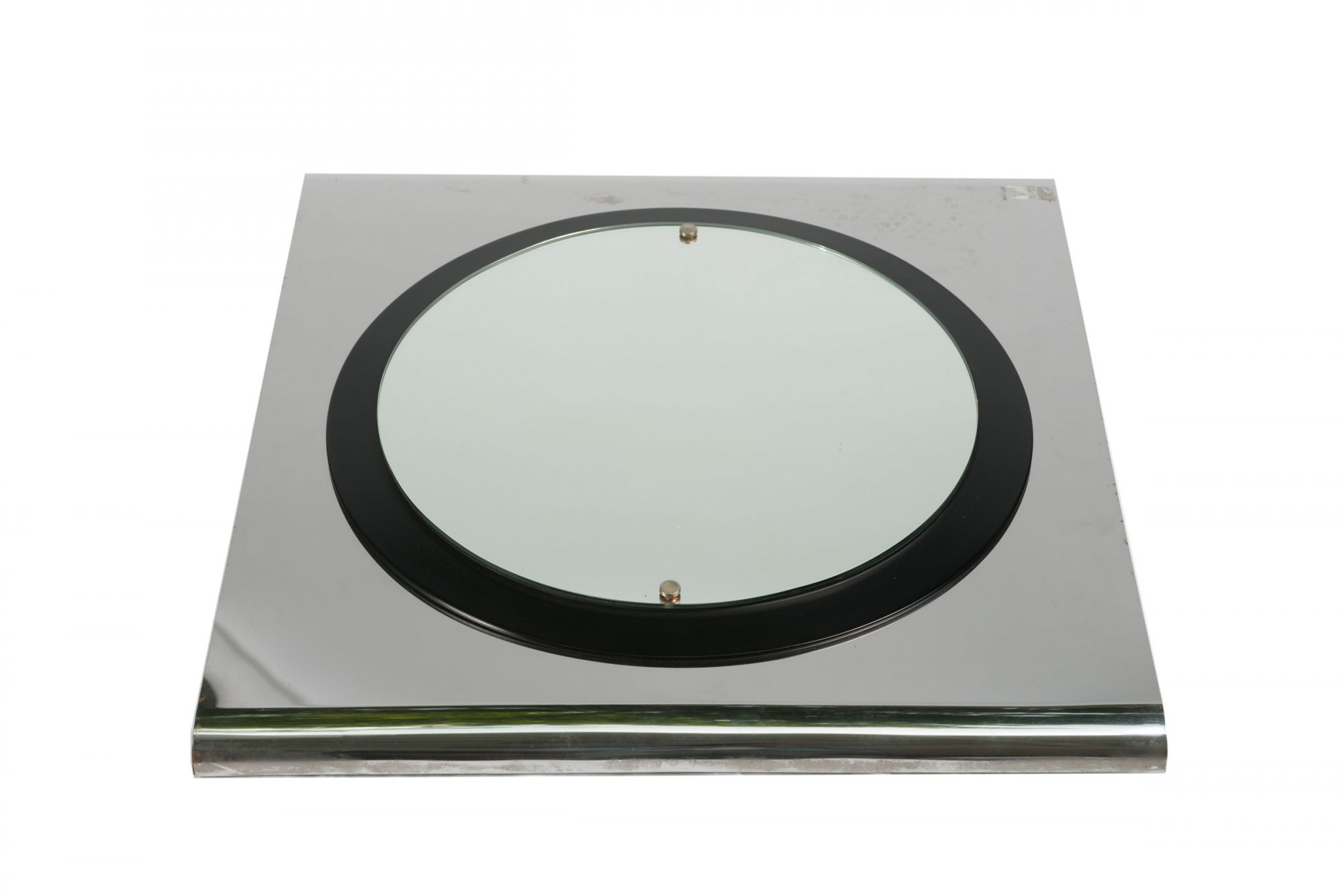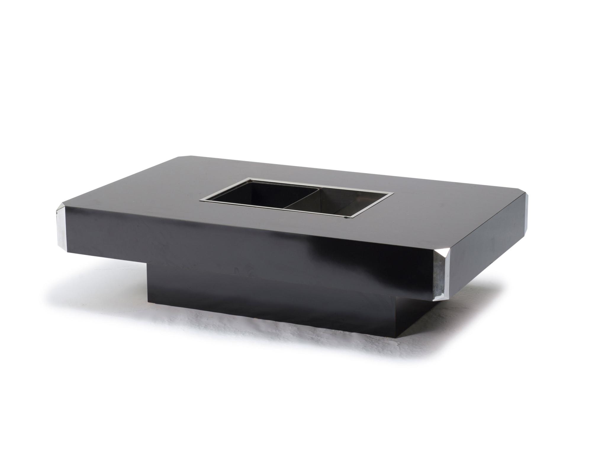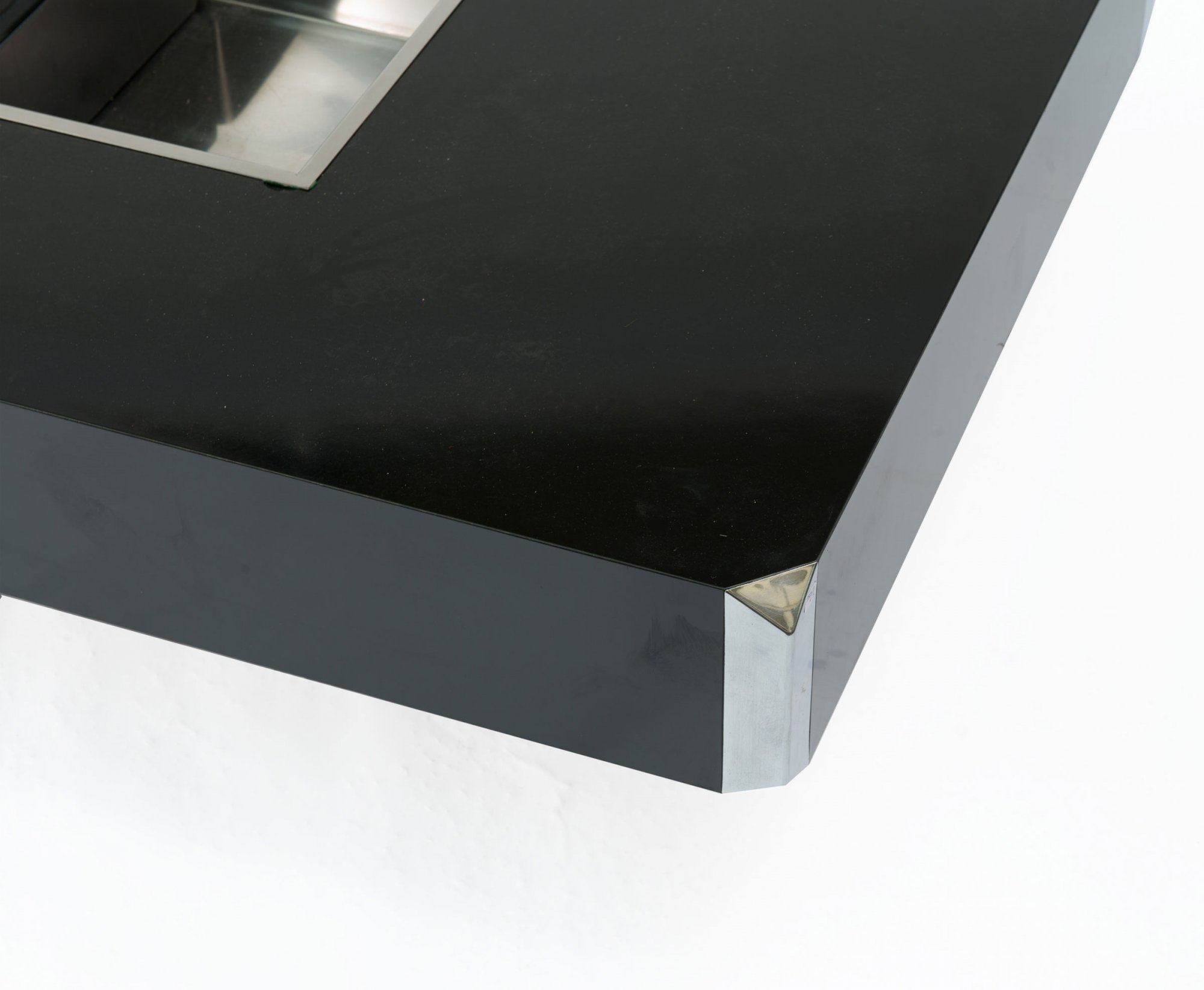 Holzkastenkonstruktion, schwarzes Kunststofflaminat, Edelstahlblech, verchromt.