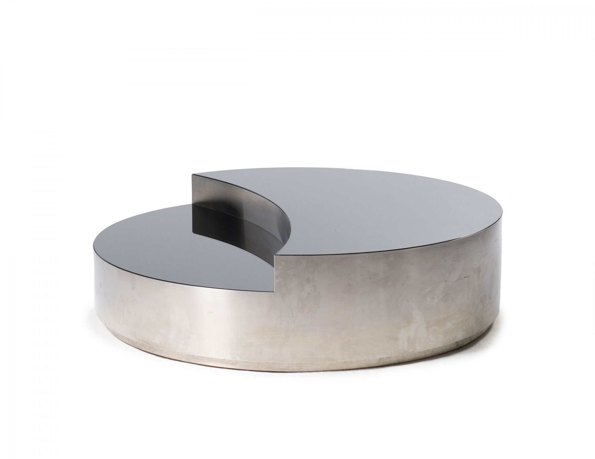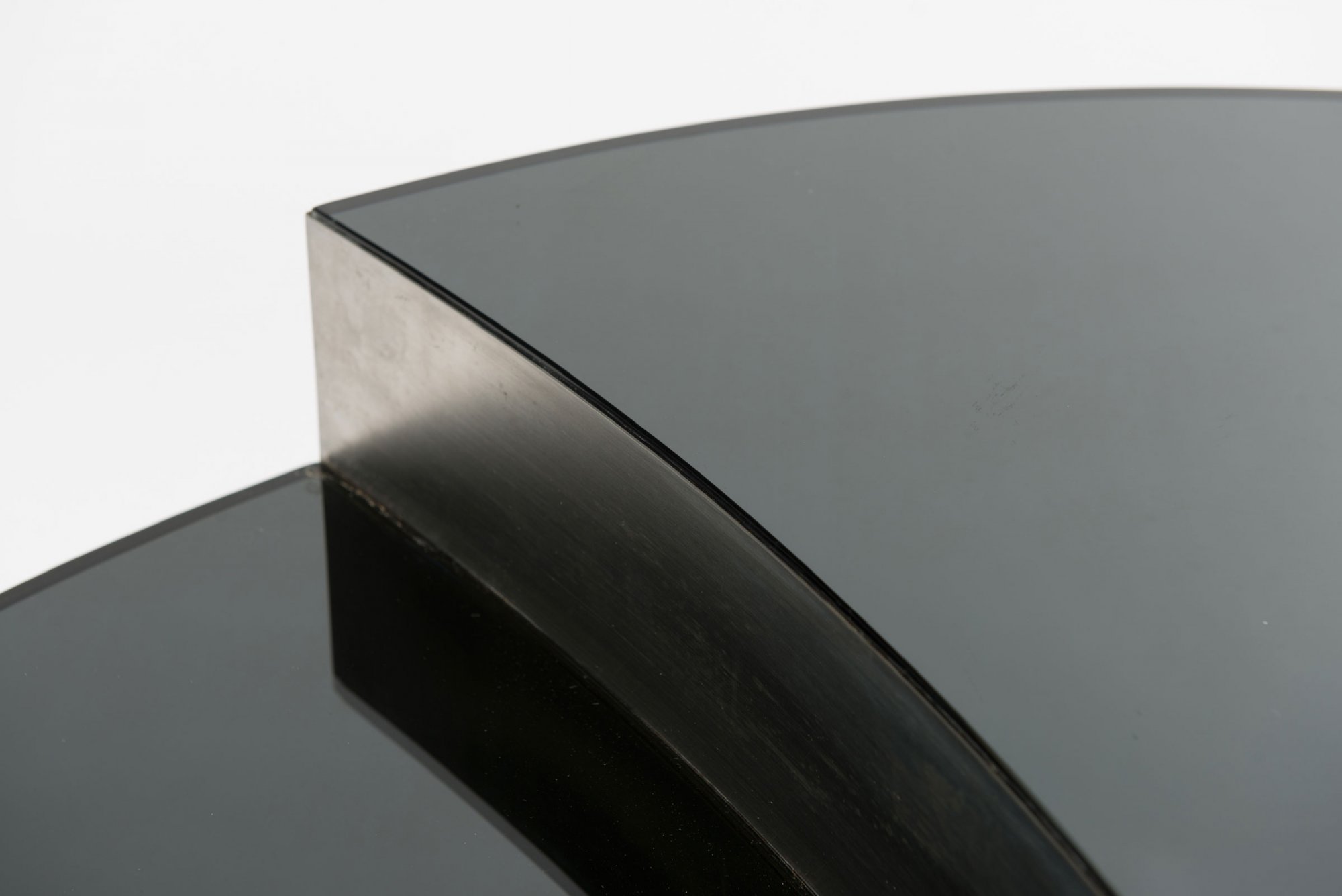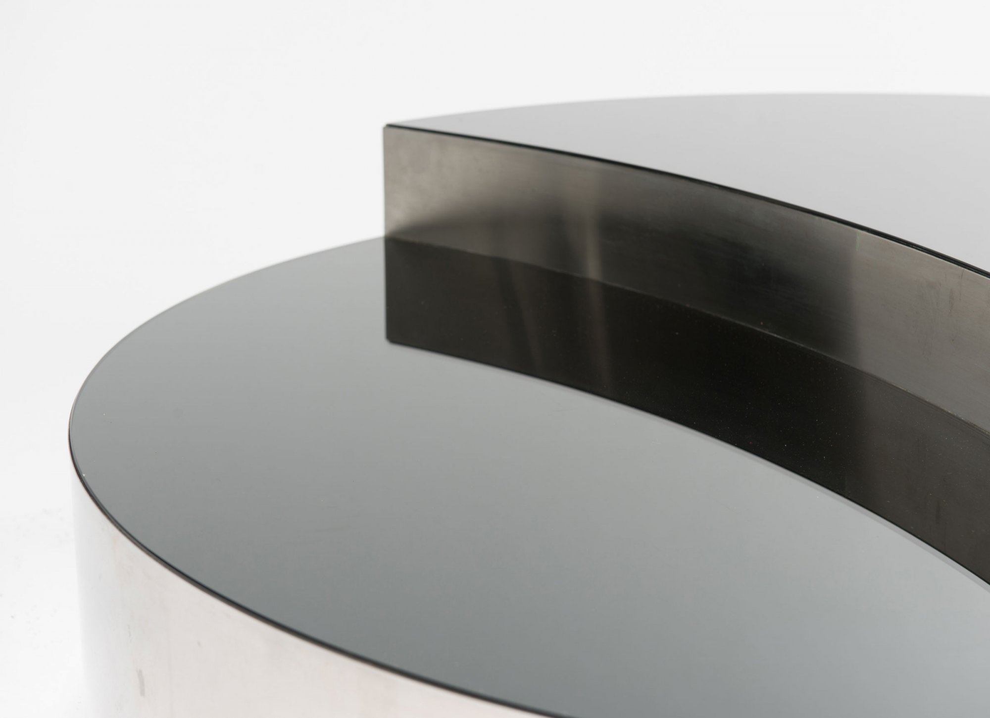 Holz, Edelstahlblech, schwarzer Lack, farbloses Glas.