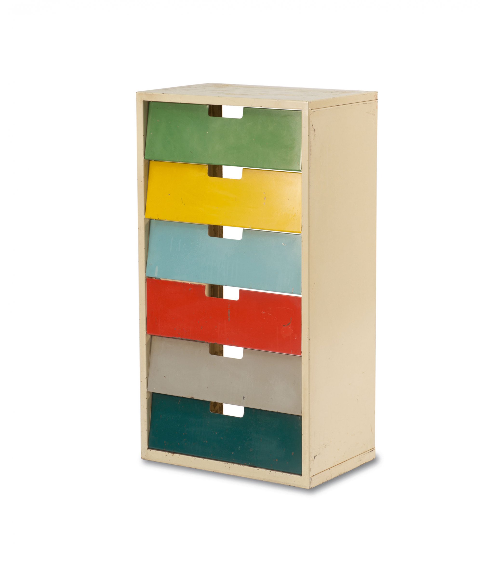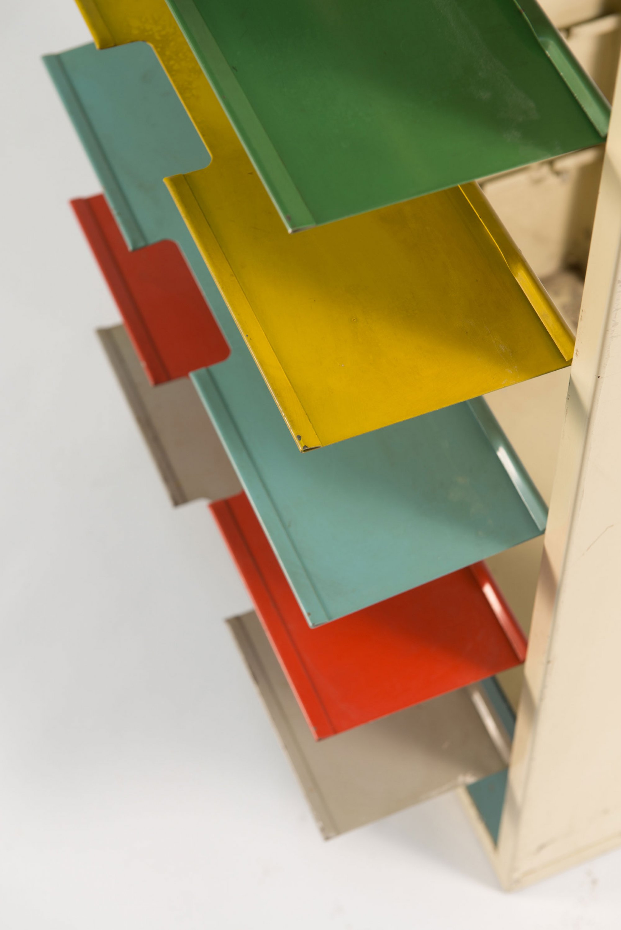 Metallblech, grau, rot, grün, gelb, dunkel- und hellblau lackiert.