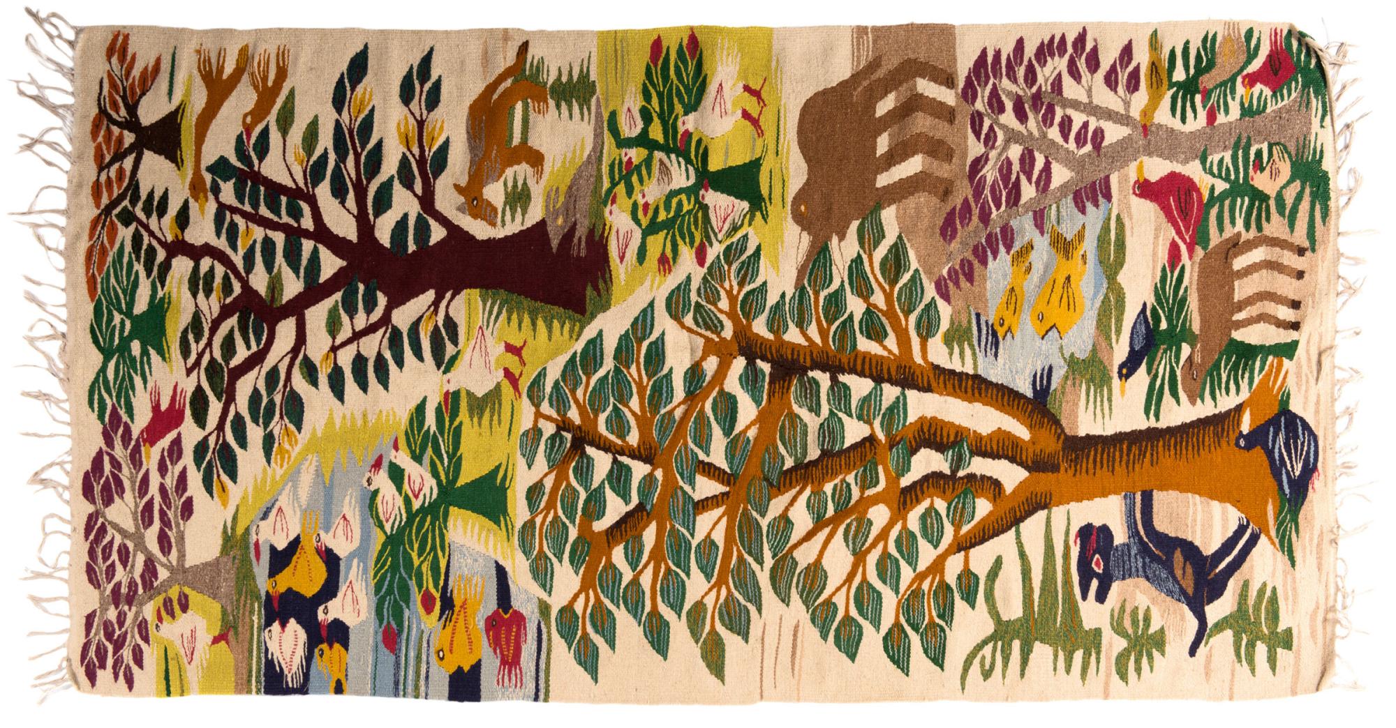 Wolle, gewebt, vielfarbig, mit Tier- und Baummotiv.