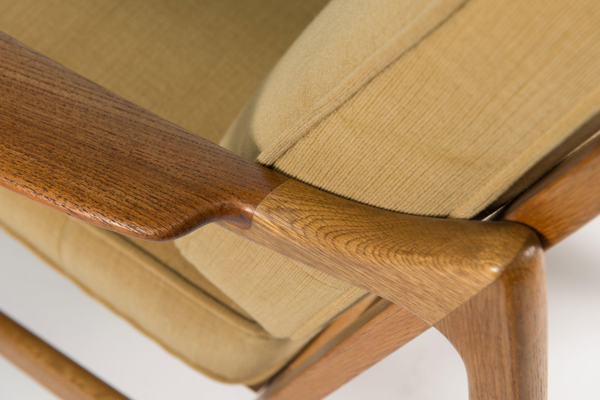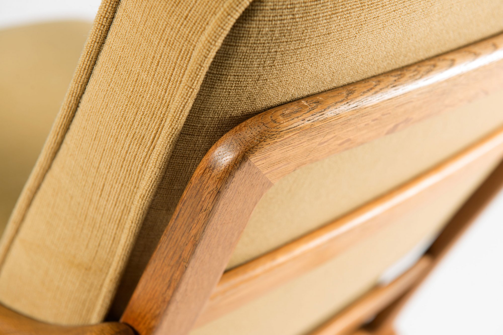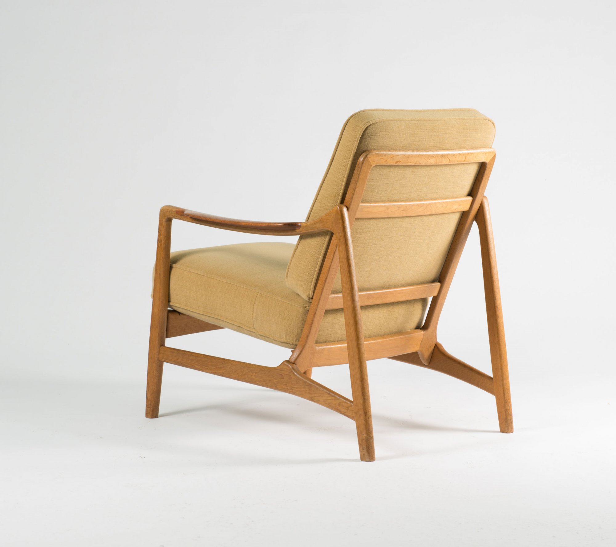 Eichen- und Teakholz, sandfarbener Textilbezug.