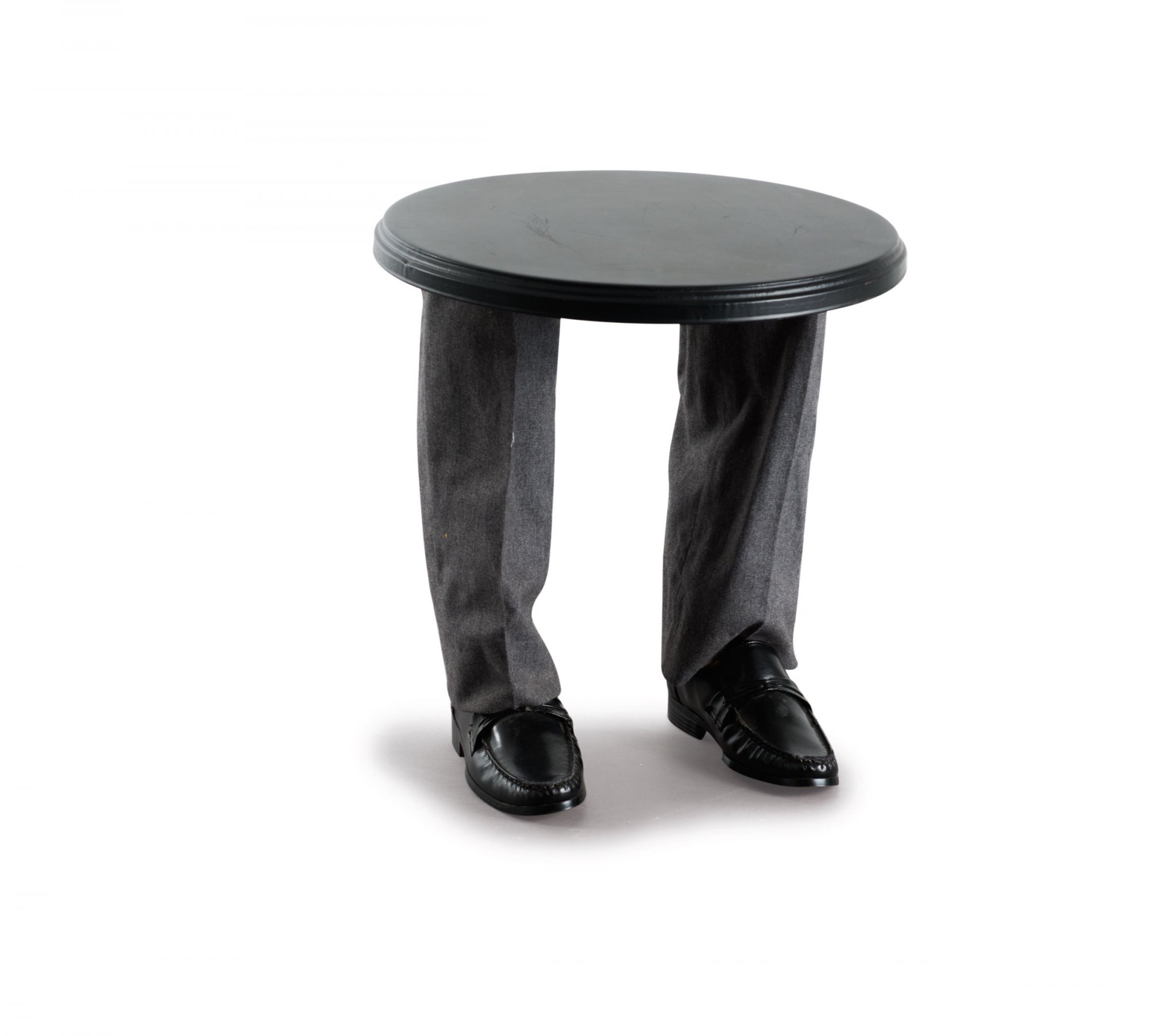 Lederschuhe, Flanellhose, Holz, schwarz lackiert.