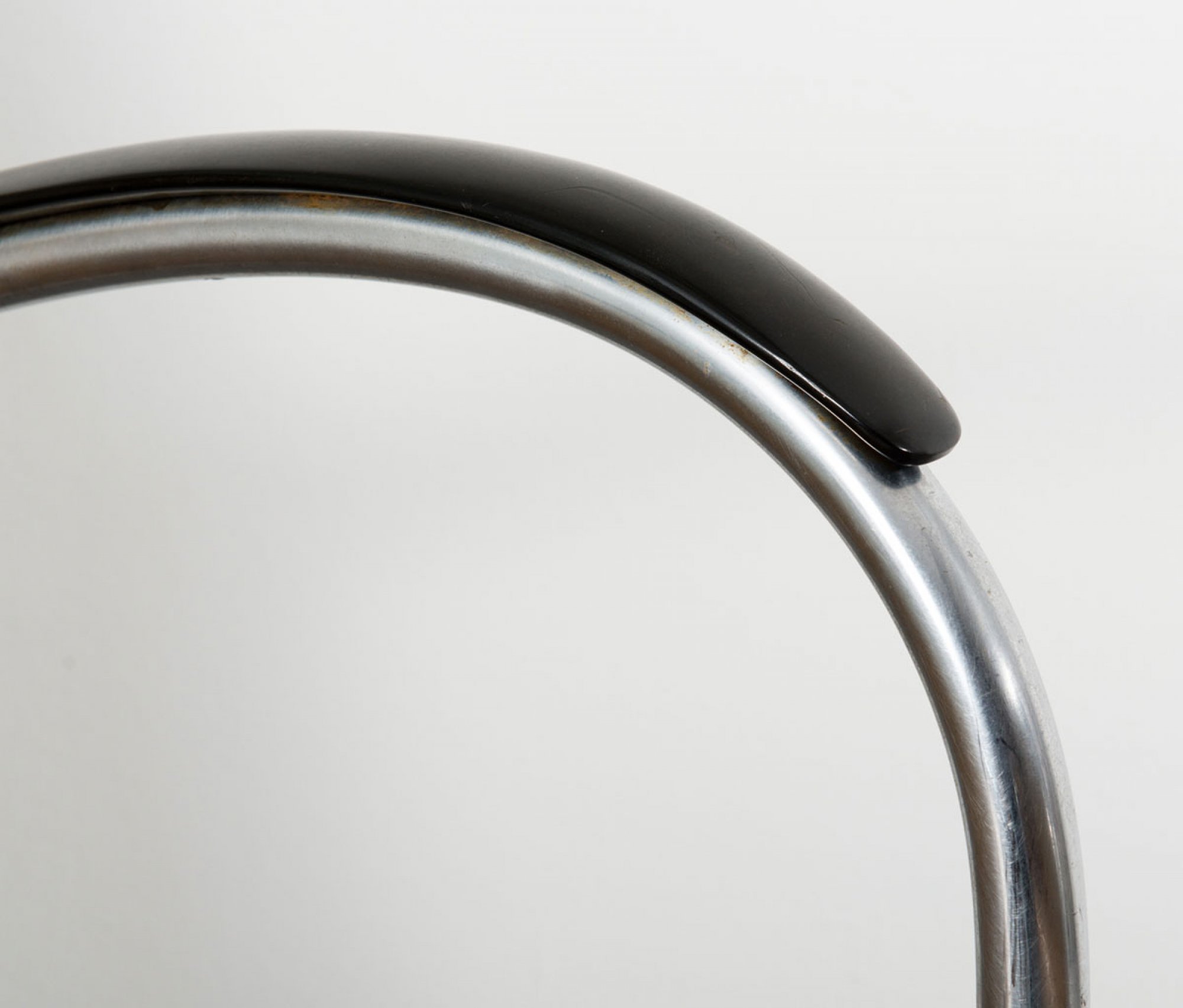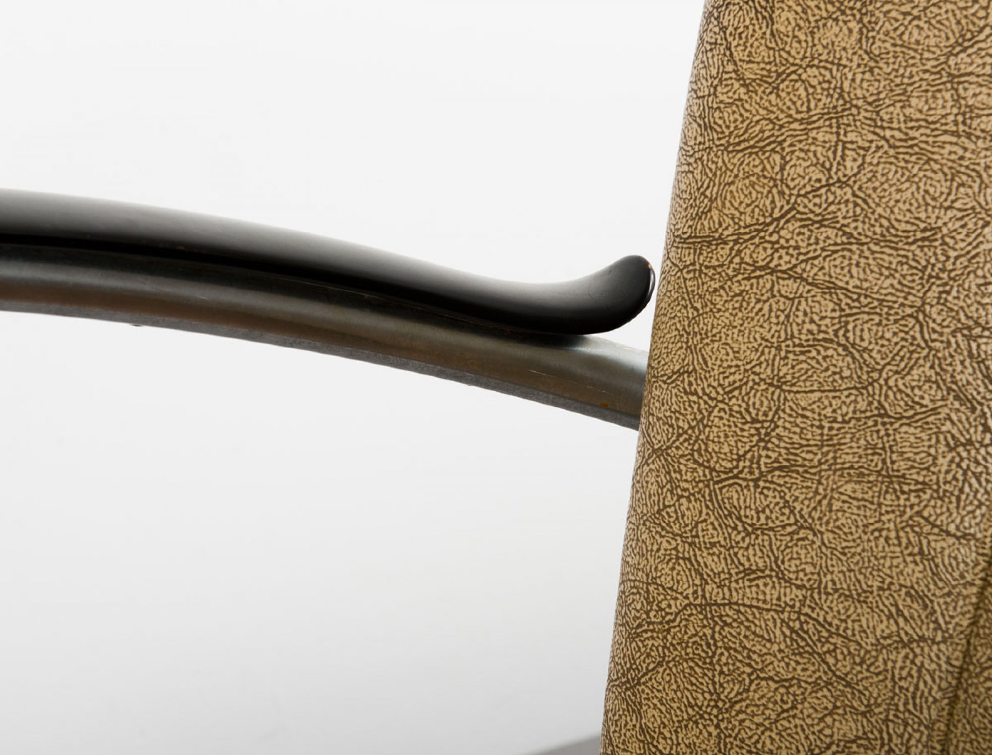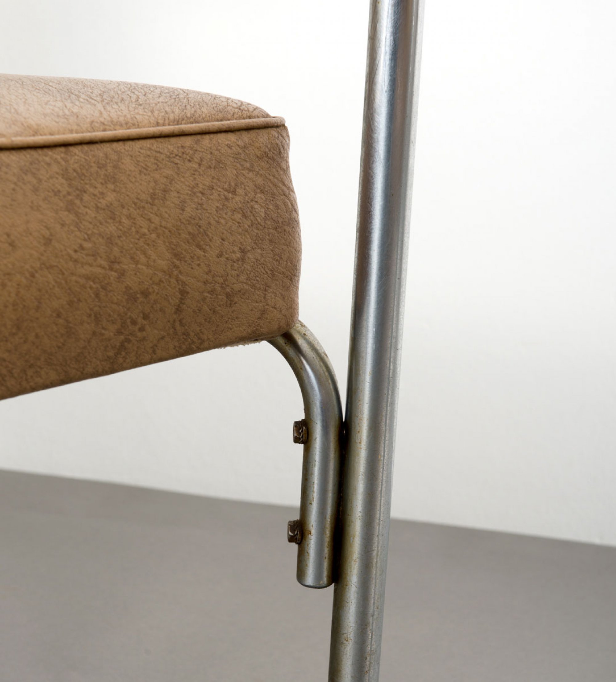 Stahlrohr, vernickelt, Armlehnen aus 'Gisolite'-Kunststoff, mittelbraunes, marmoriertes Kunstleder.