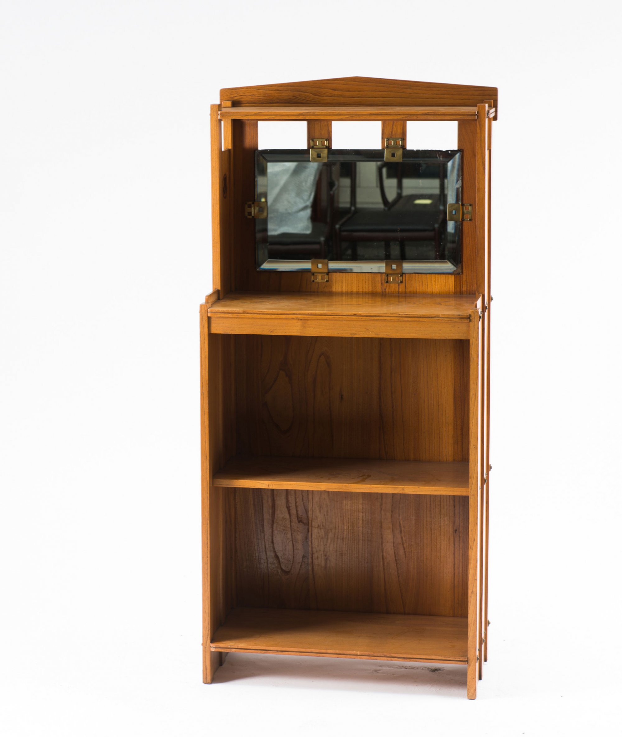Vierstufig. Hochrechteckiger Korpus mit flach eckigem Abschluß. H. 141 cm, 64 x 26 cm. Rüster, massiv, an der Innenseite des Oberteils blattartiges Motiv, intarsiert, wohl aus Mahagoni. Rückwand partiell verspiegelt. Beschläge und Schrauben aus Messing.