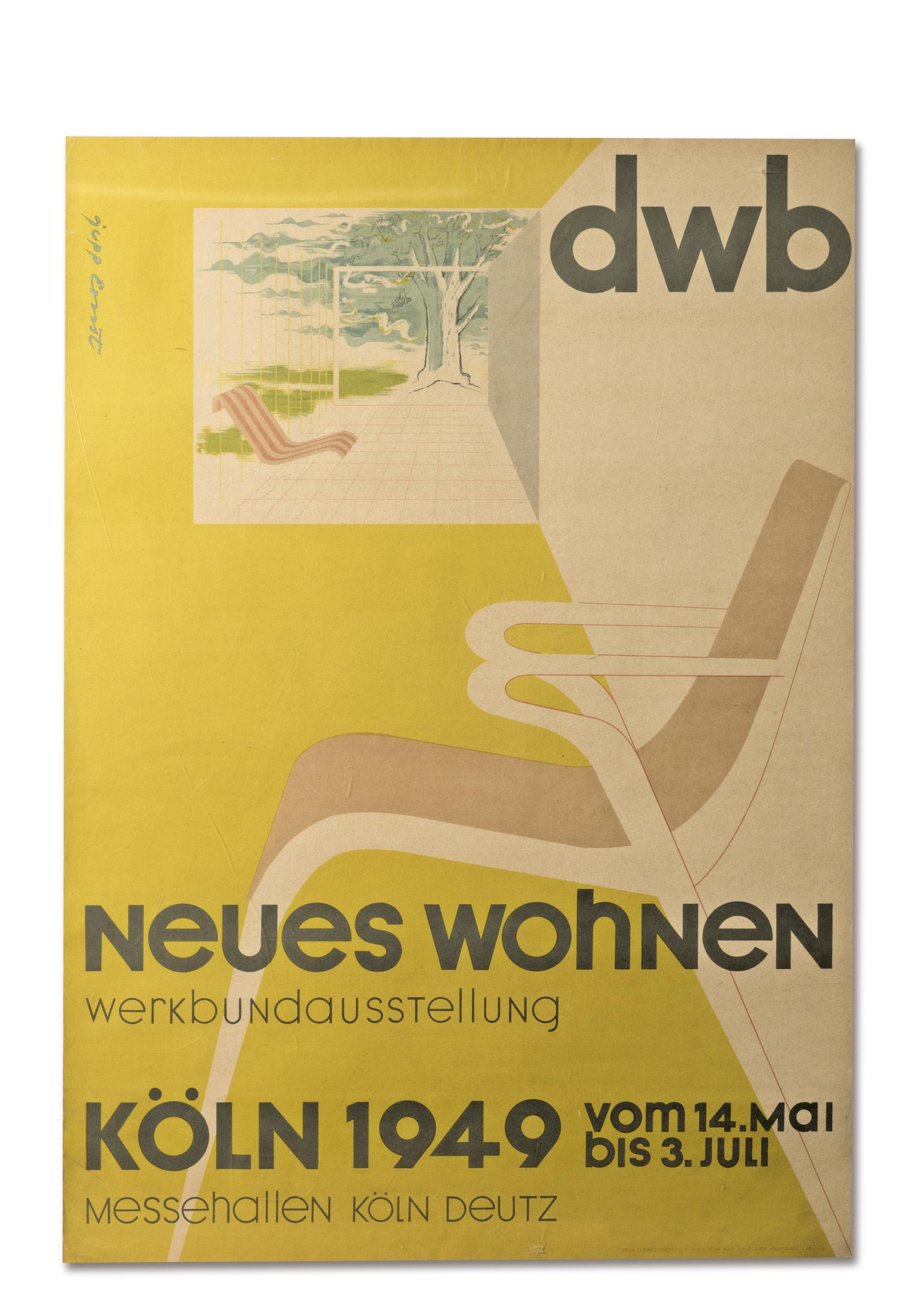 Bez.: dwb Neues Wohnen werkbundausstellung KÖLN 1949 vom 14. Mai bis 3. Juli Messehallen Köln Deutz. Links oben bez.: Jupp Ernst (Schriftzug), rechts unten: KÖLN VERLAGSDRUCKEREI G.M.B.H. KÖLN NRW. 2/7 D 3/351 10091/5000 4.49 Kl.B. Verglast gerahmt.
