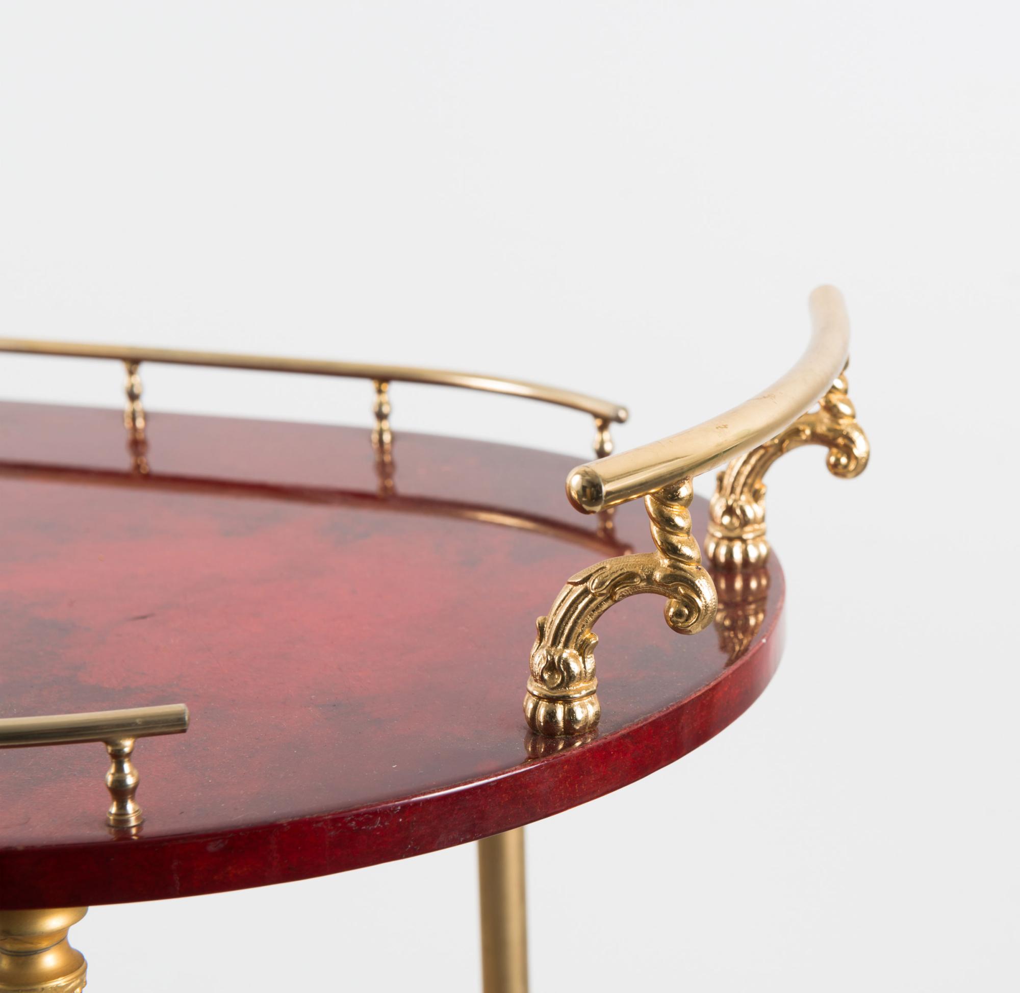 Tischlerplatte, mit Ziegenleder bezogen, rot gefärbt, klar lackiert, vergoldetes Messingrohr.