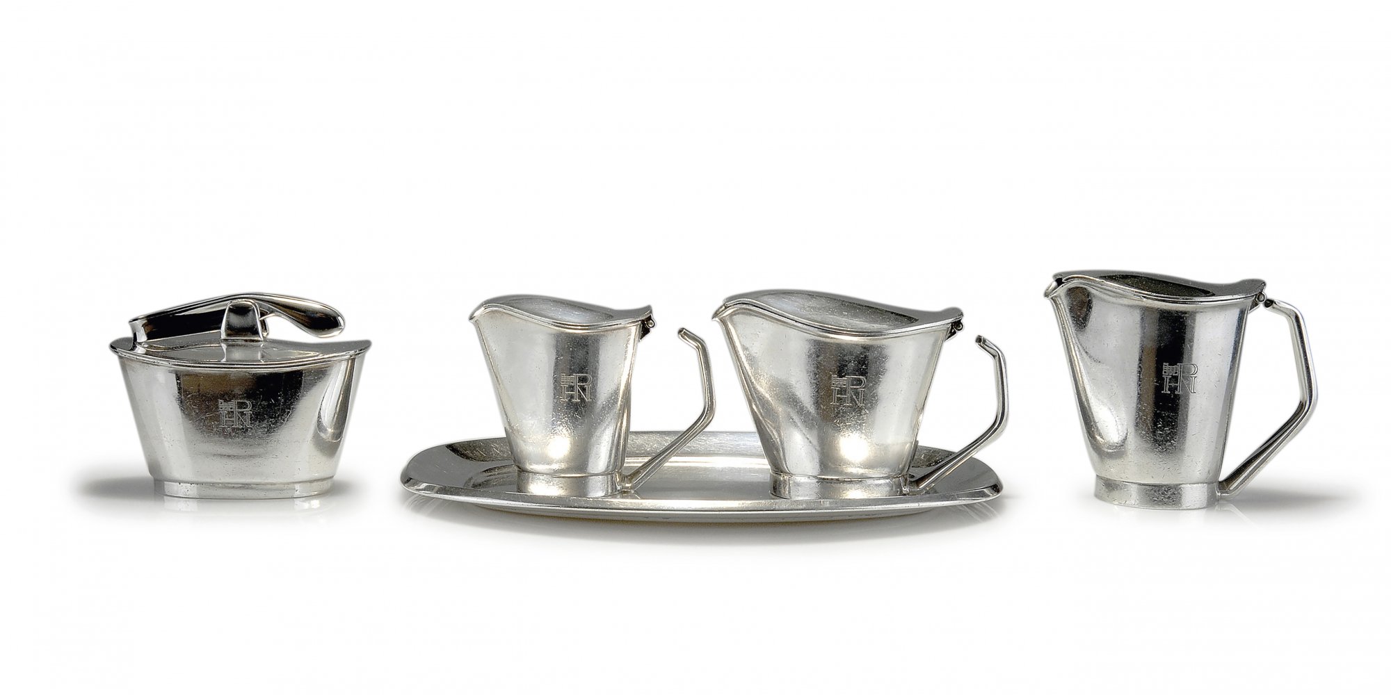 Sechs Teile. Kaffeekanne: H. 11,2 cm; Teekanne: H. 9,7 cm; Milchkanne: H. 9,4 cm; Zuckerdose: H. 9,6 cm; Zuckerzange: L. 10,2 cm; Tablett: 29,7 x 23,3 cm.