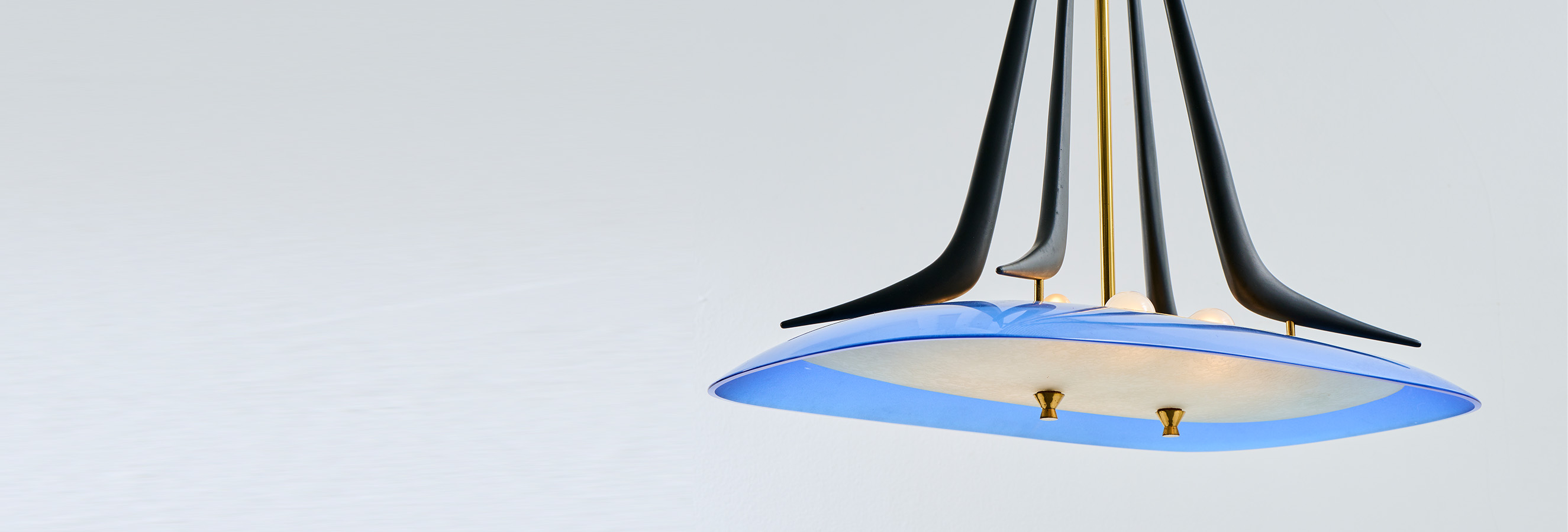 Ein Highlight der Auktion ist zweifellos Max Ingrands äußerst elegante Deckenleuchte für Fontana Arte. Ingrand entwarf in den Jahren seiner künstlerischen Leitung der Glasmanufaktur zahlreiche Leuchten und Glasobjekte, die in ihrem geschmackvollen Stil bis heute modern bleiben. Die um 1955 entstandene Deckenleuchte aus farblosem und blauem Glas mit feinen Konturen ist mit 10.000 bis 12.000€ realistisch geschätzt.