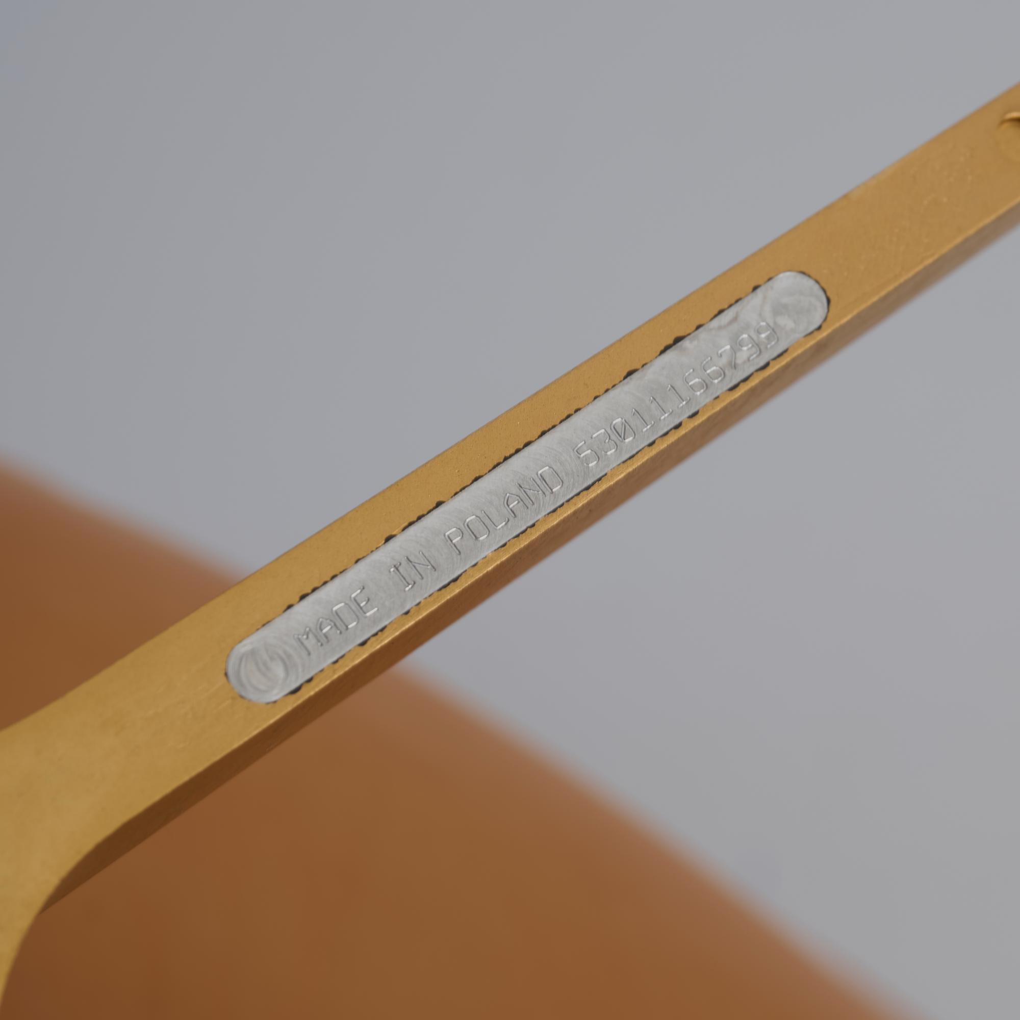 Aluminiumguss, vergoldet, hellbraunes Leder.