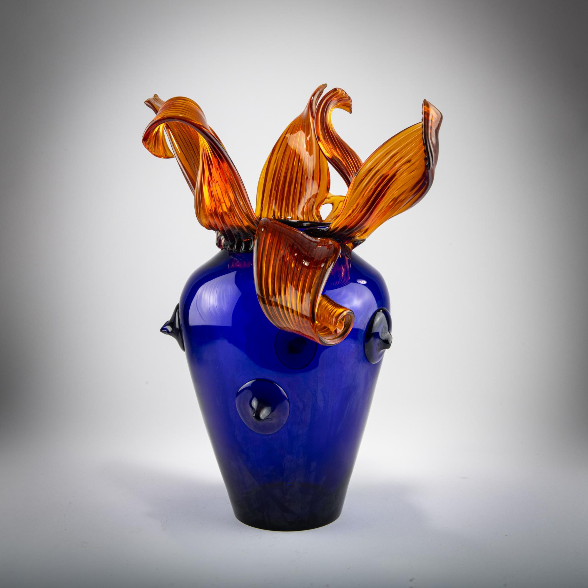 Glas, blau und bernsteinfarben.