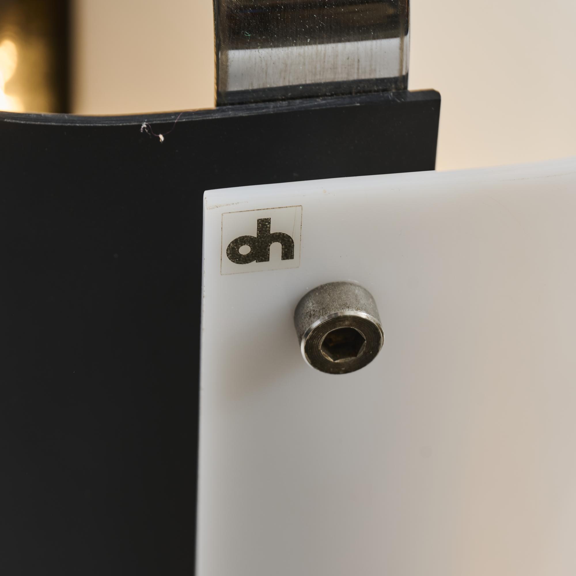 Metall, verchromt, Plexiglas, weiß und schwarz.