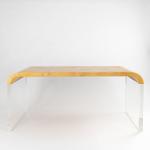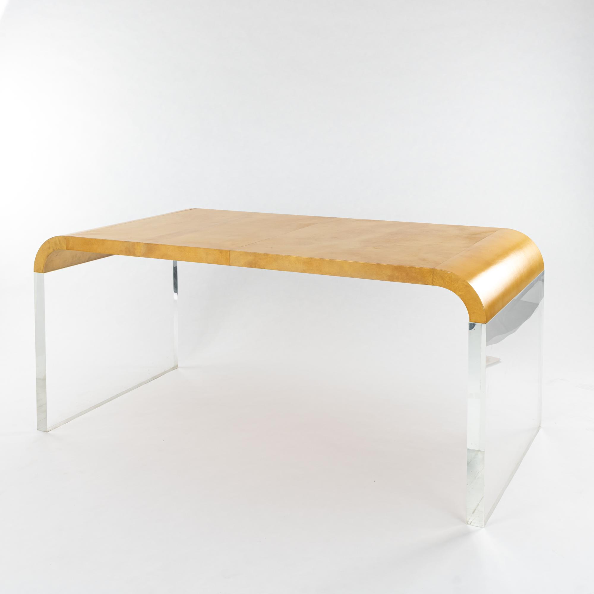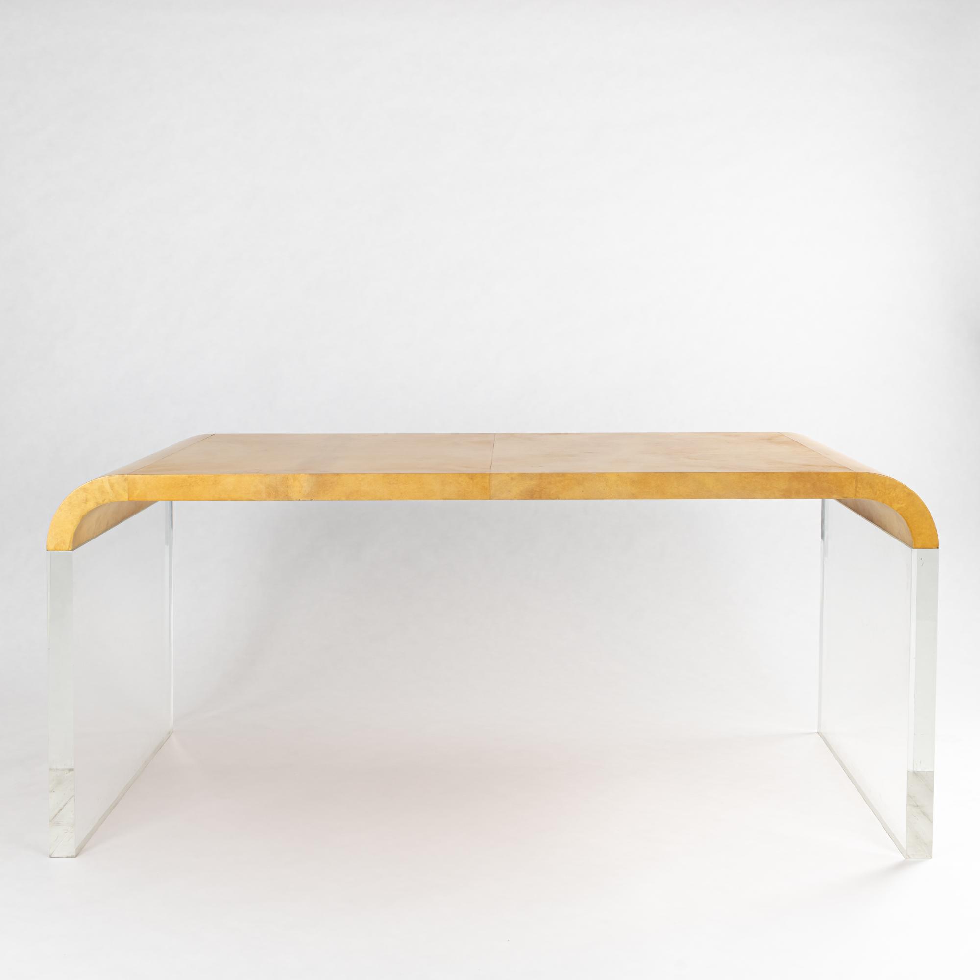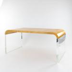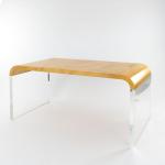 Acrylglas, Holz mit gelblich/beigem Ziegenleder bezogen.