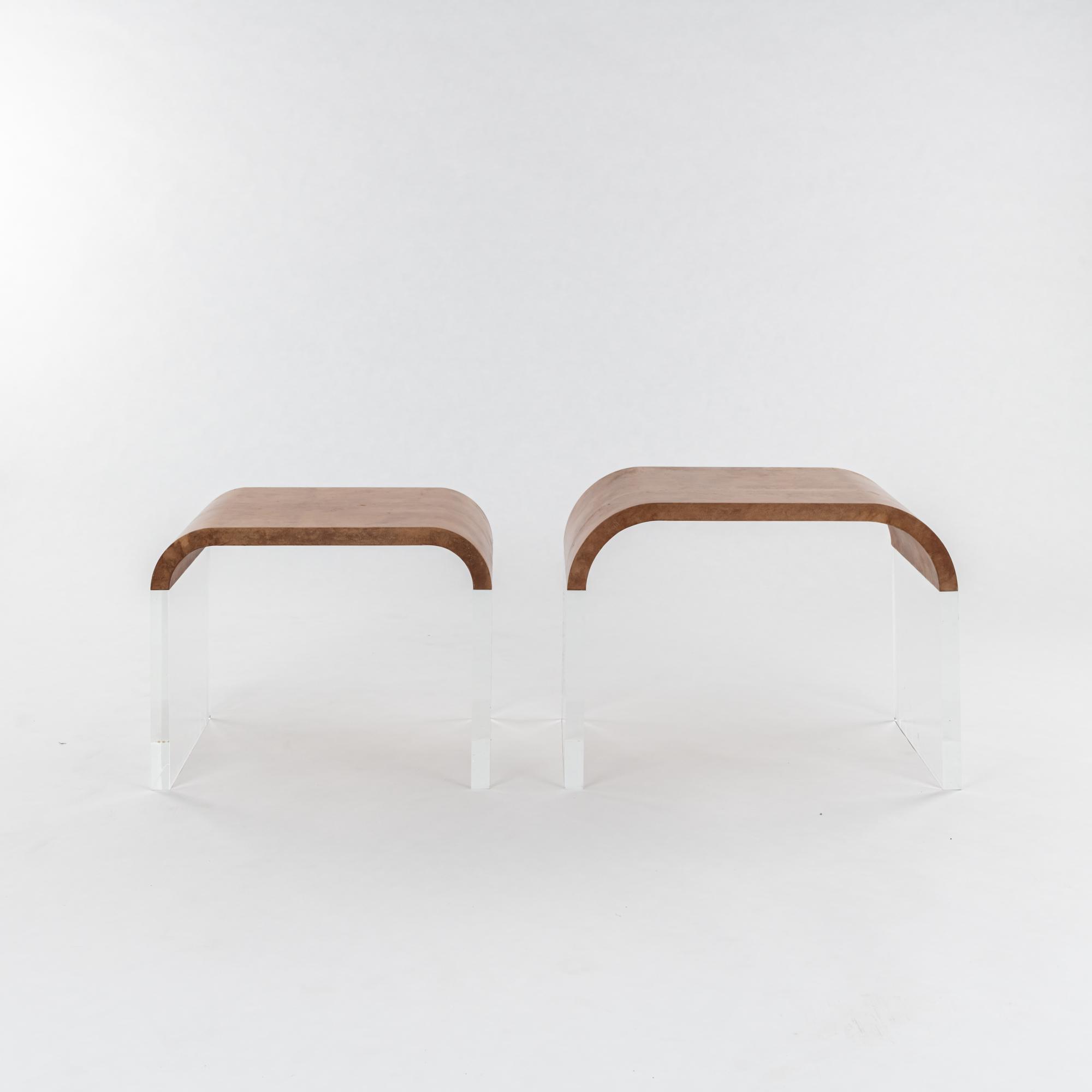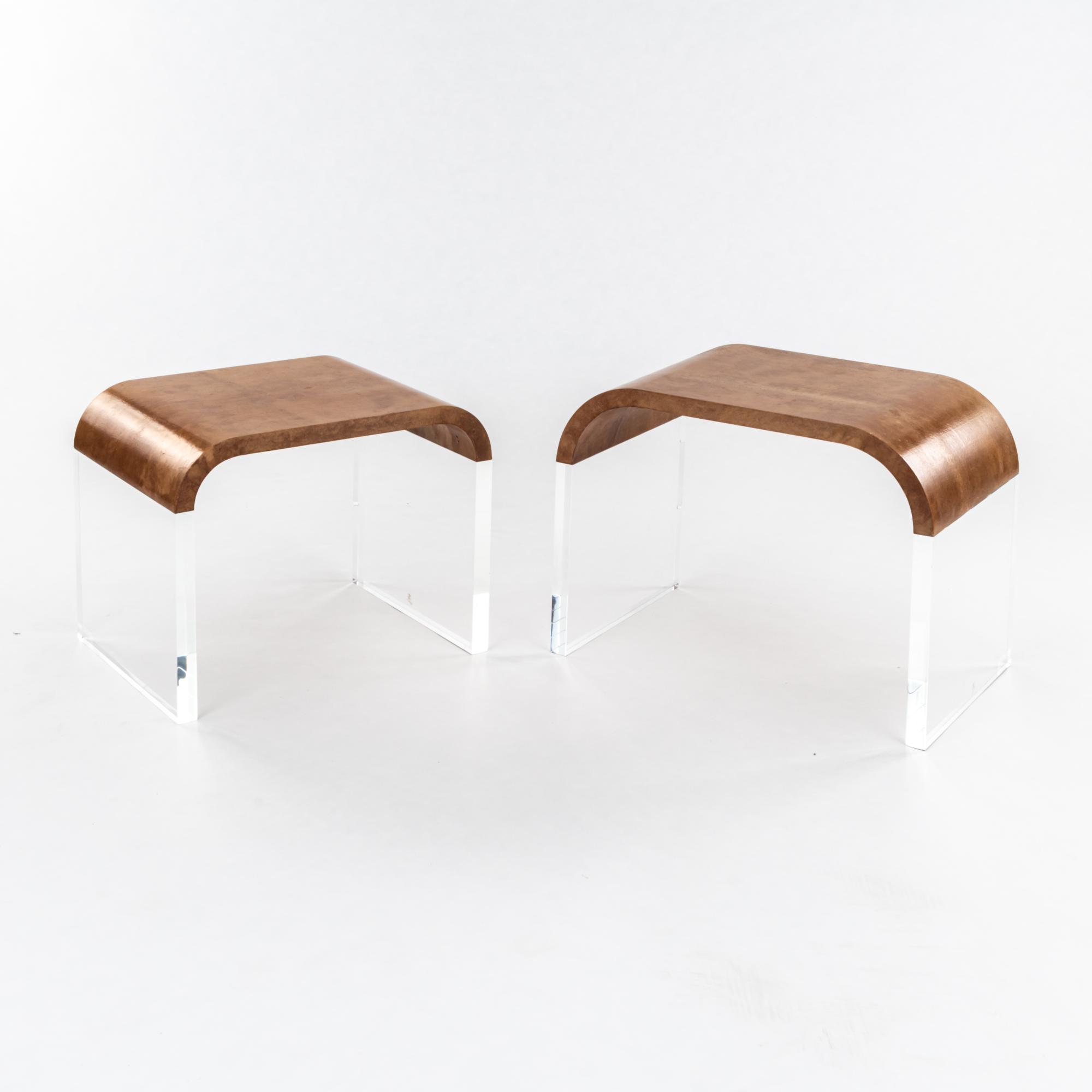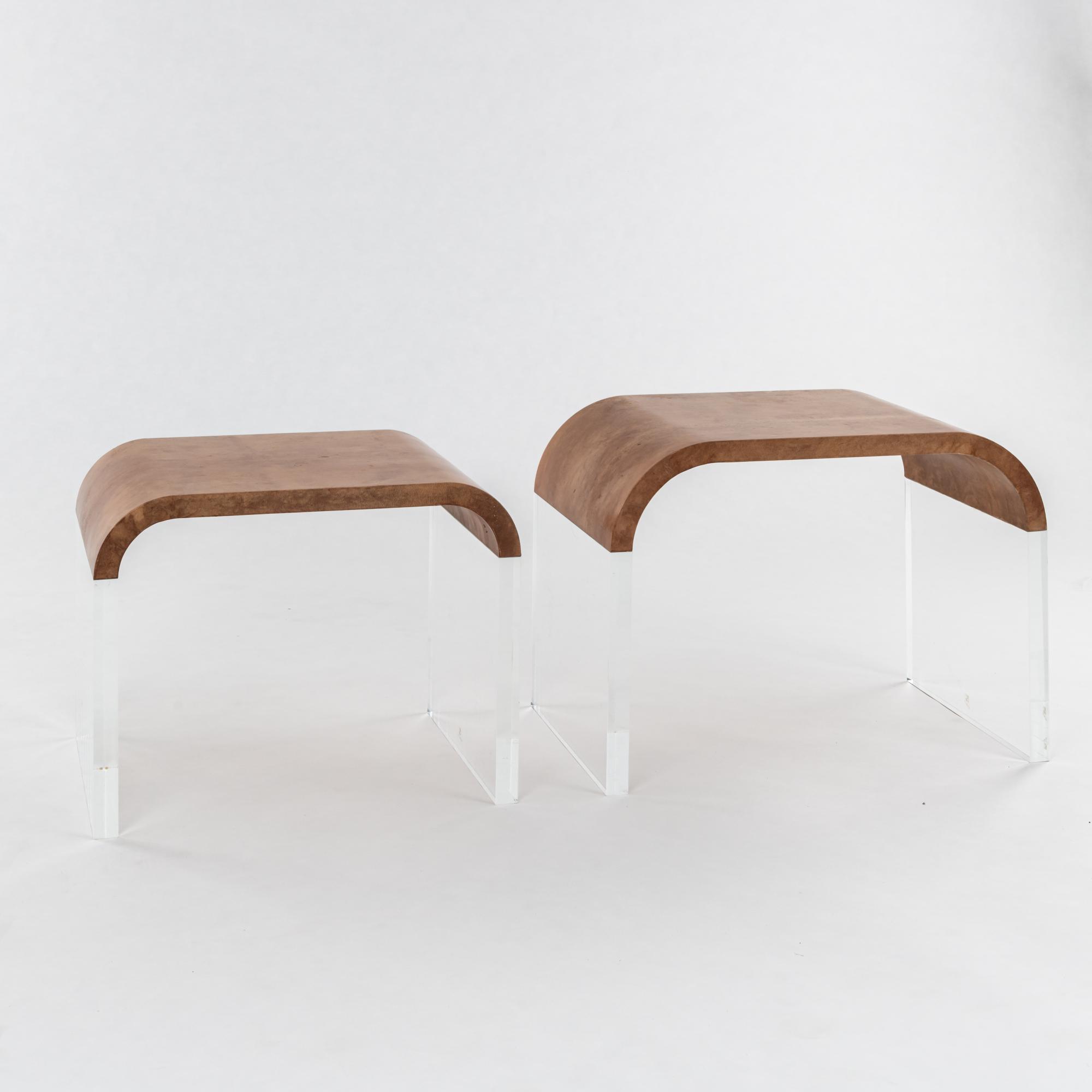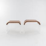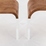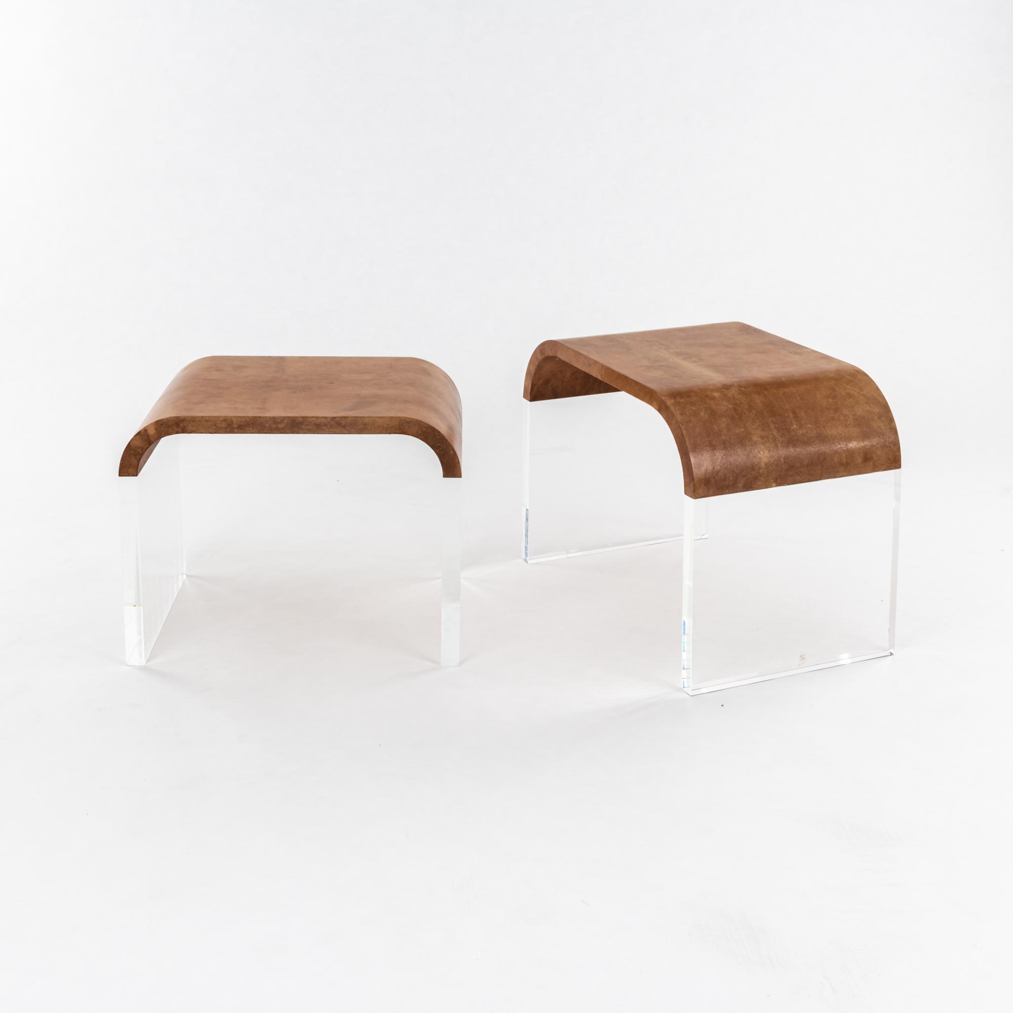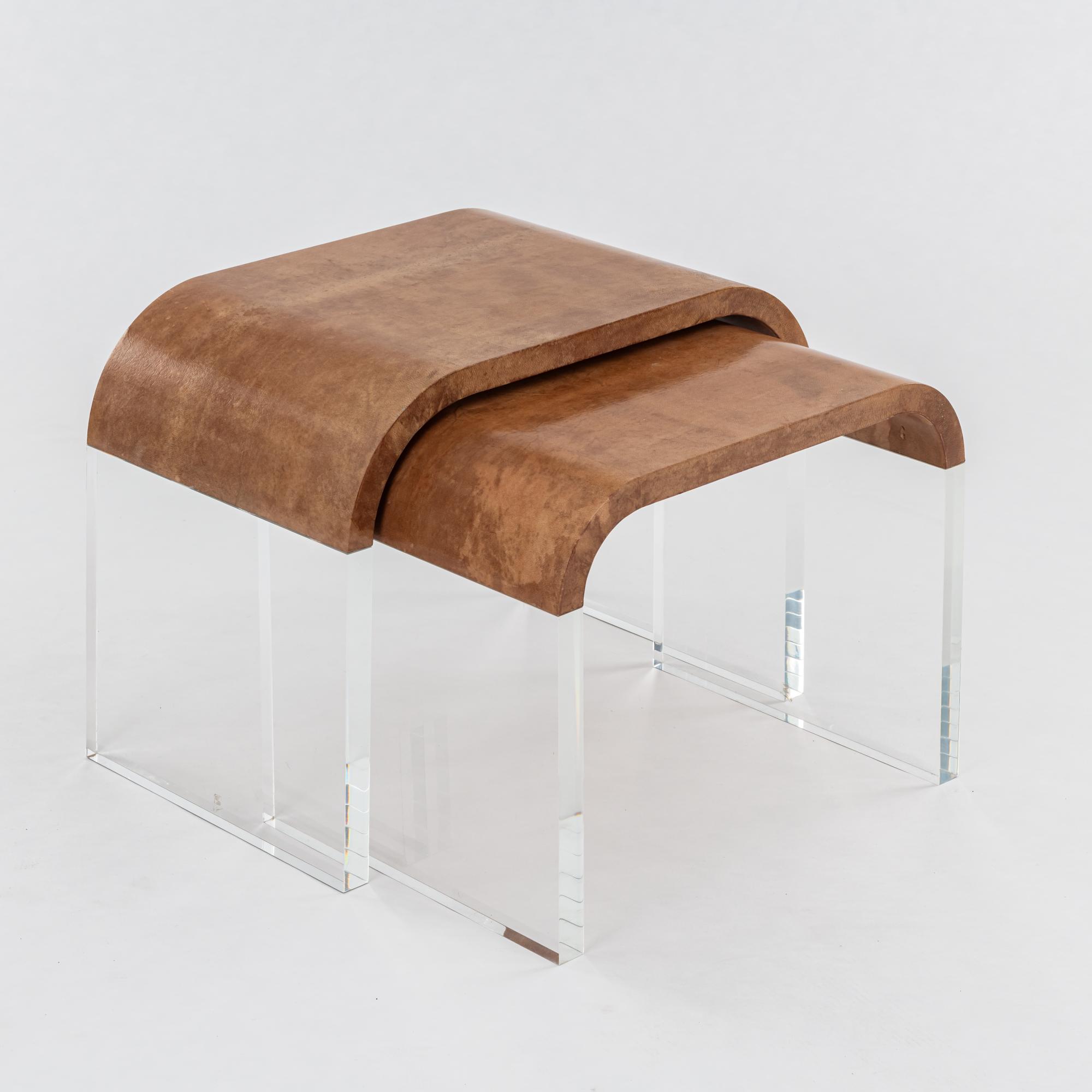 Acrylglas, Holz mit braunem Ziegenleder bezogen.