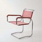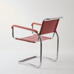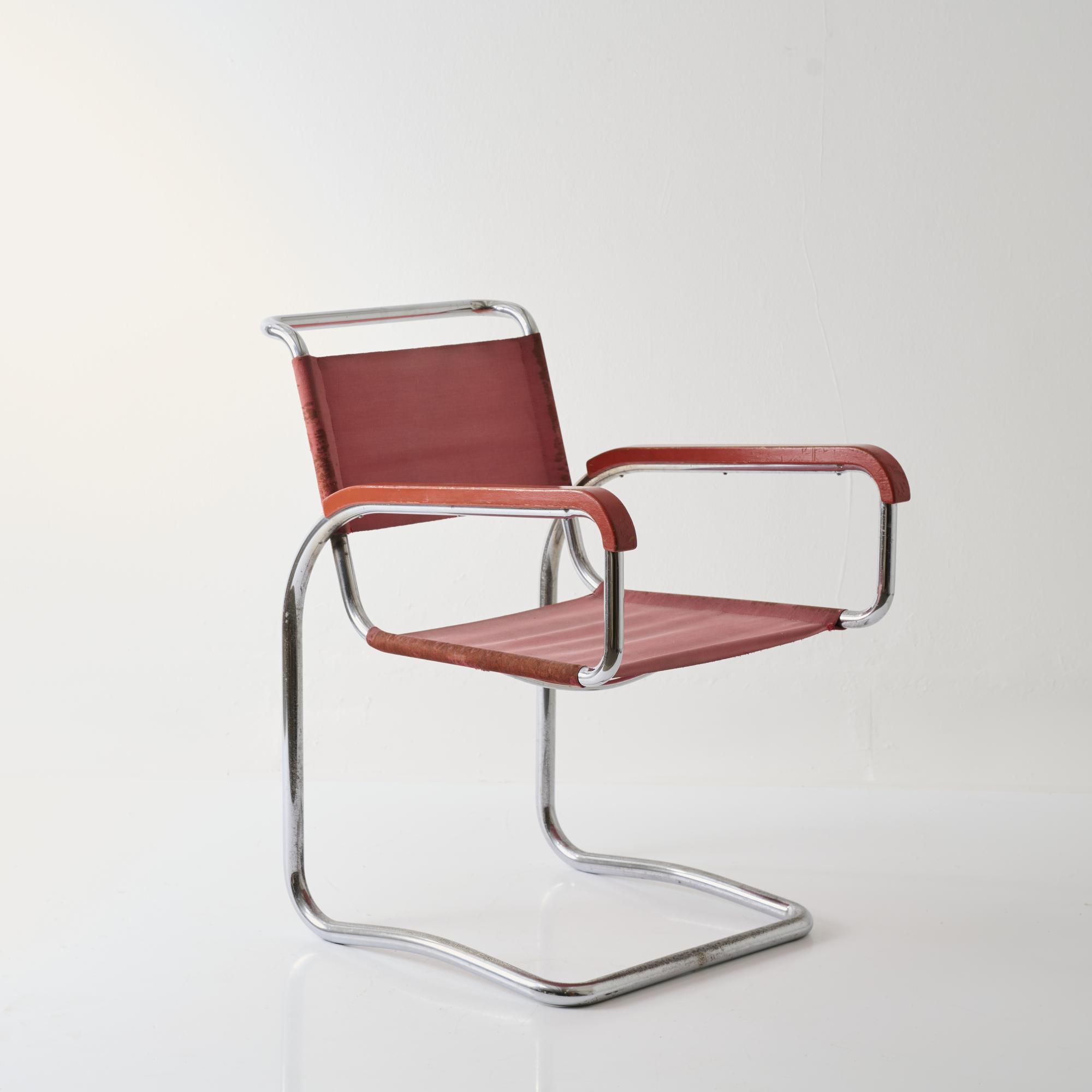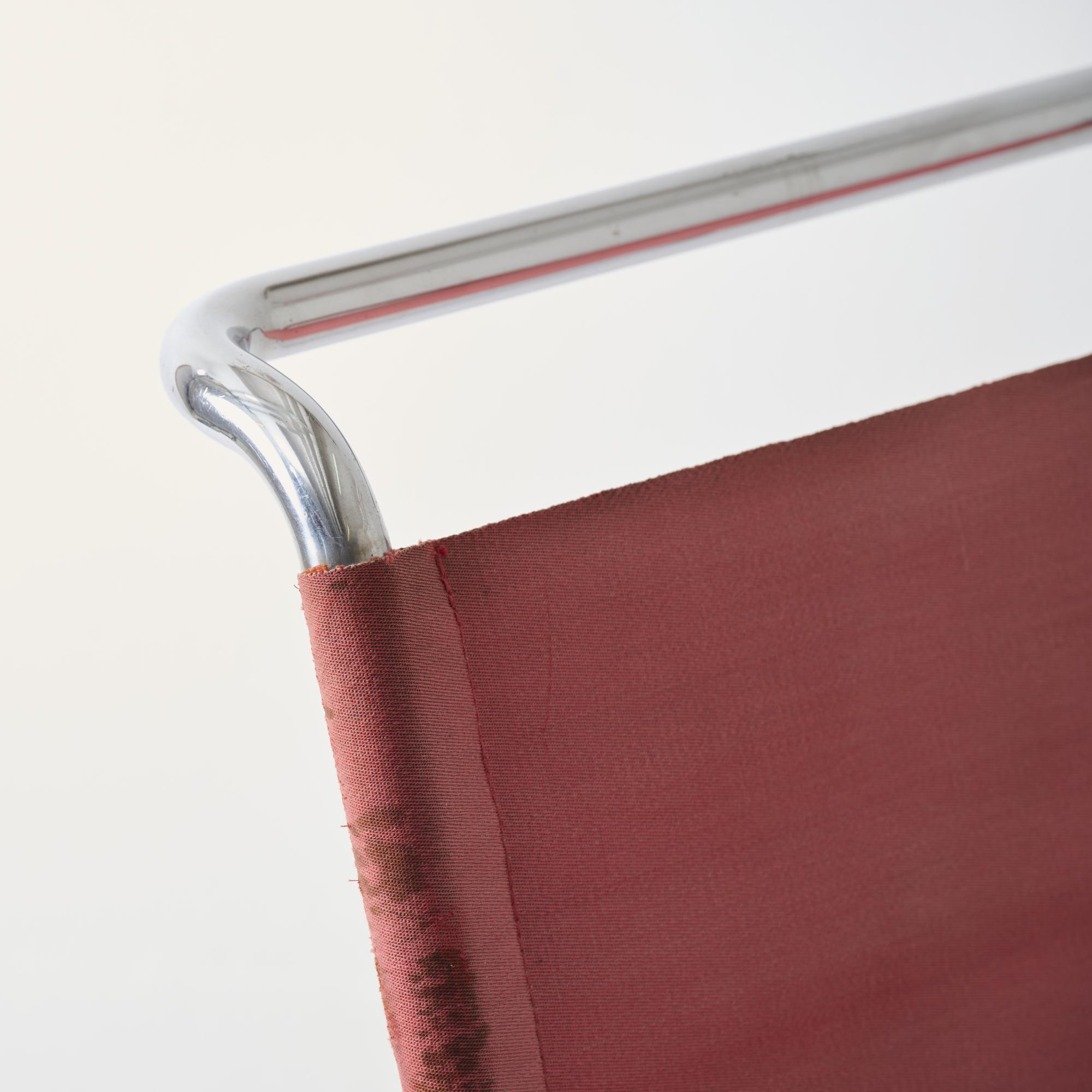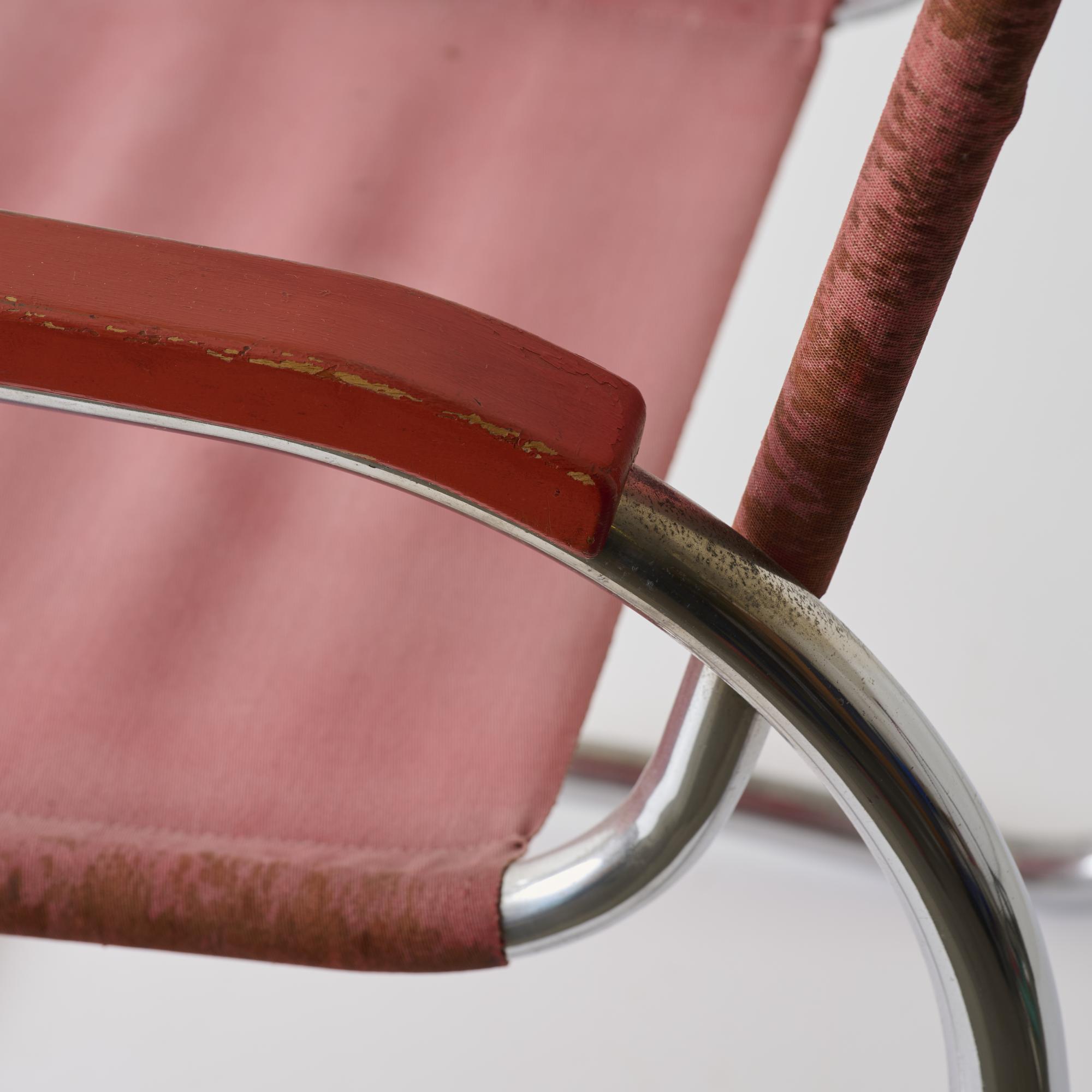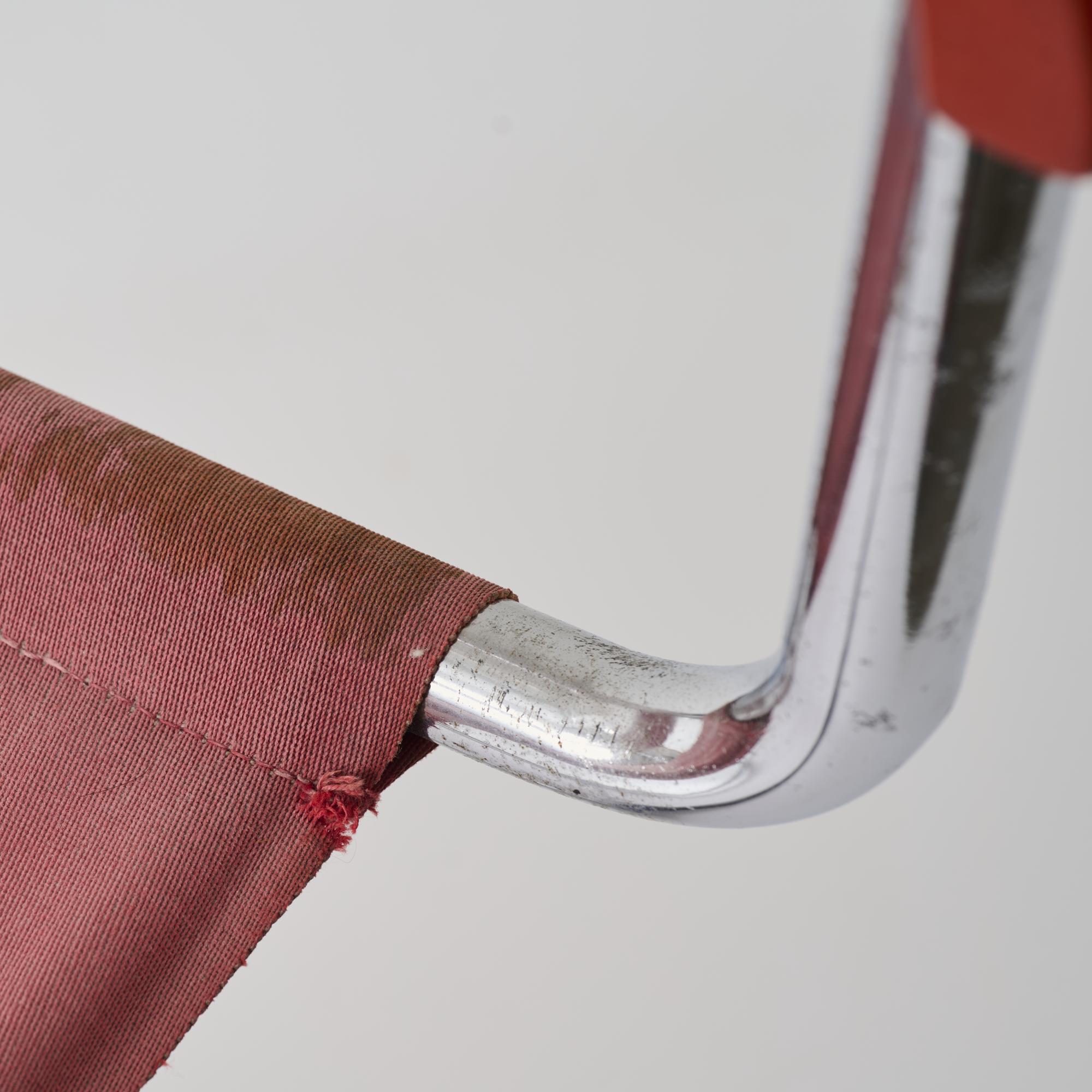 Stahlrohr, verchromt, Holz, dunkelrot lackiert, roter Eisengarn-Bezug.