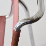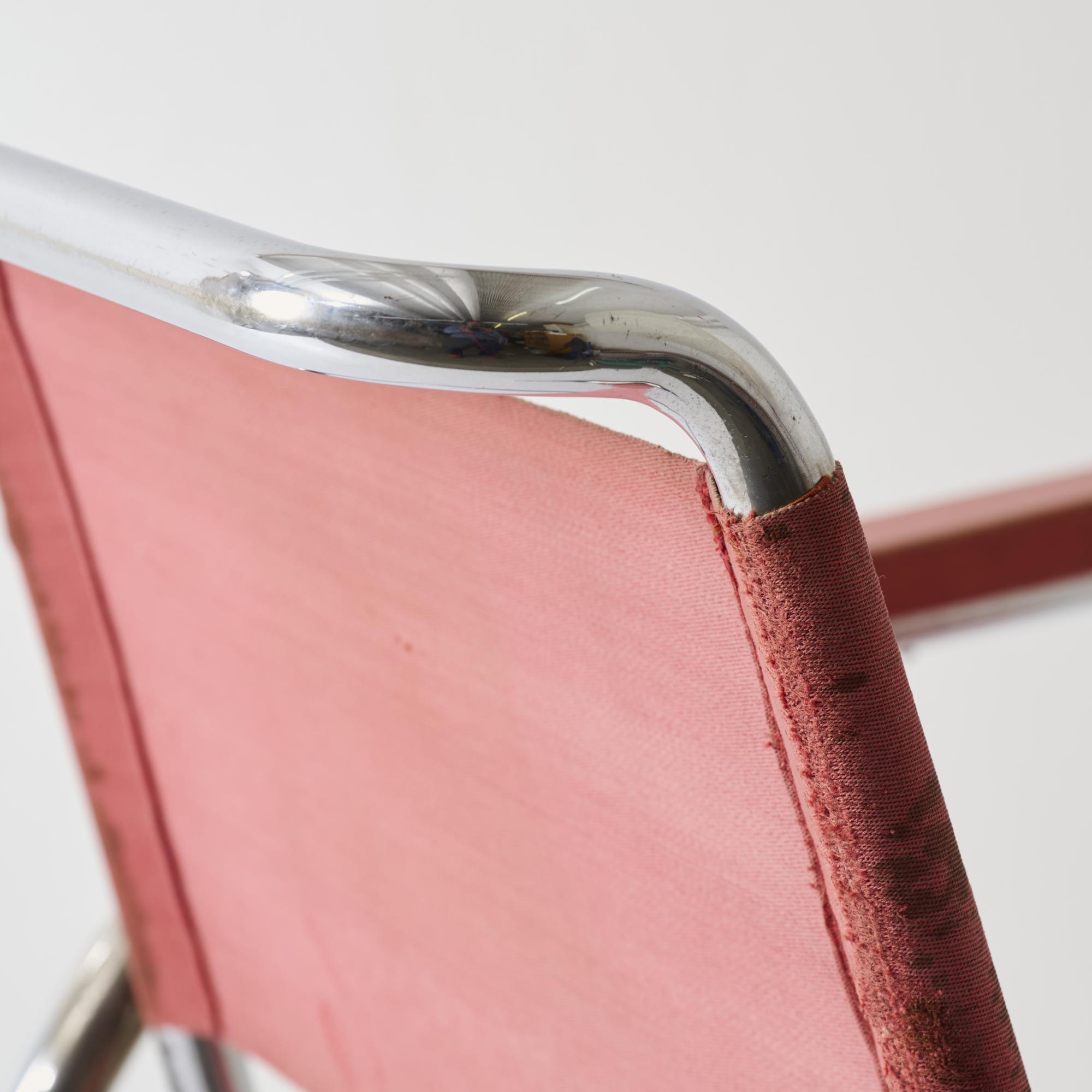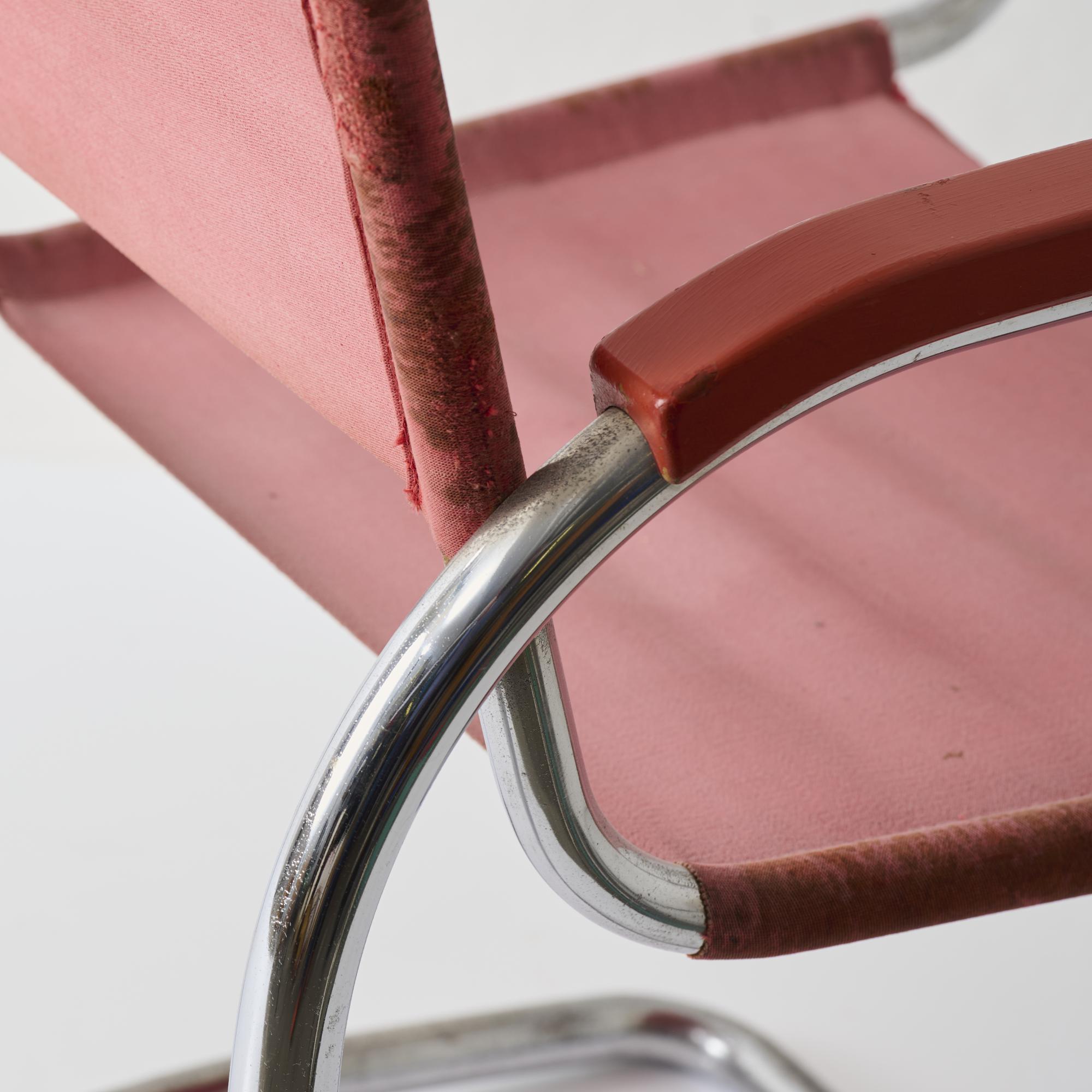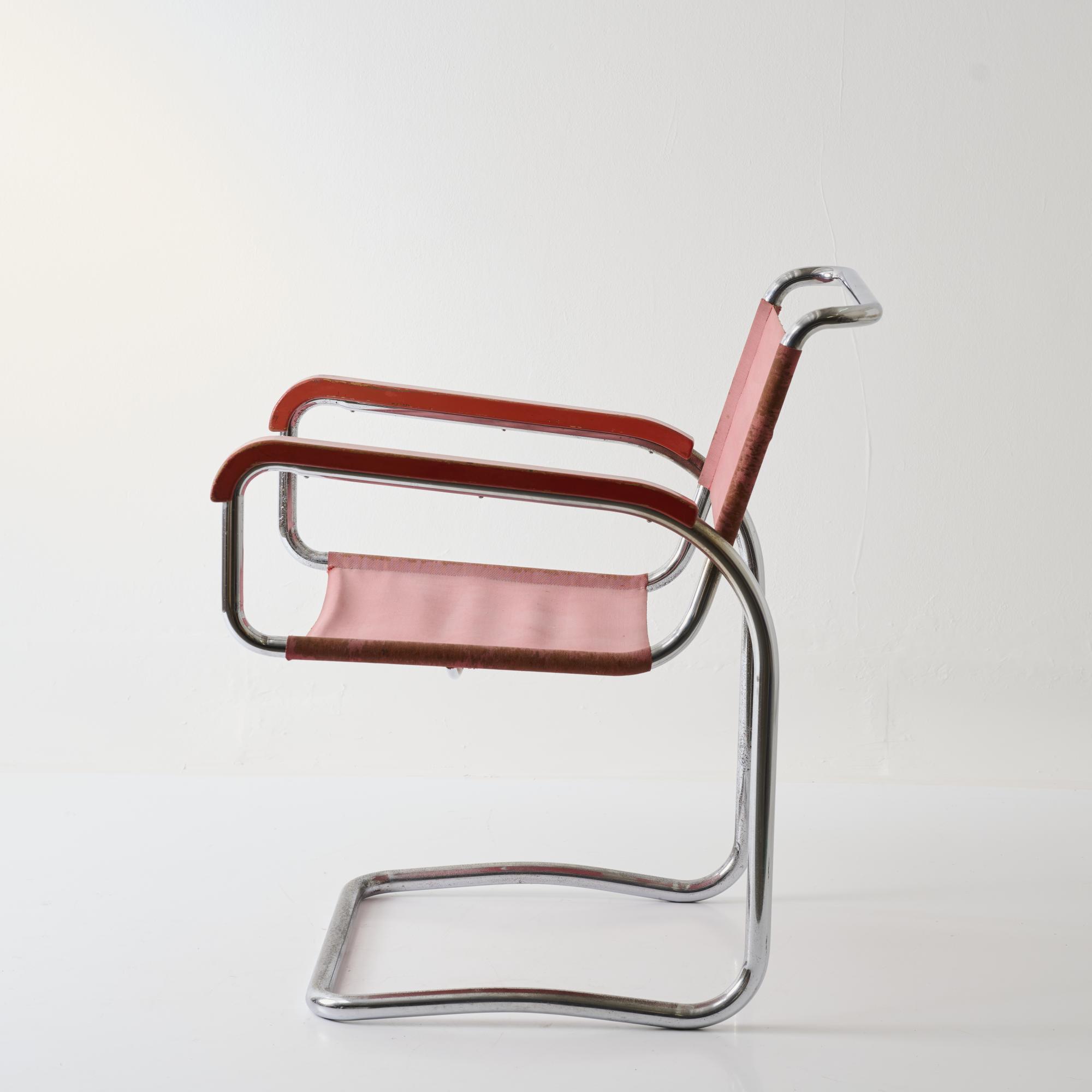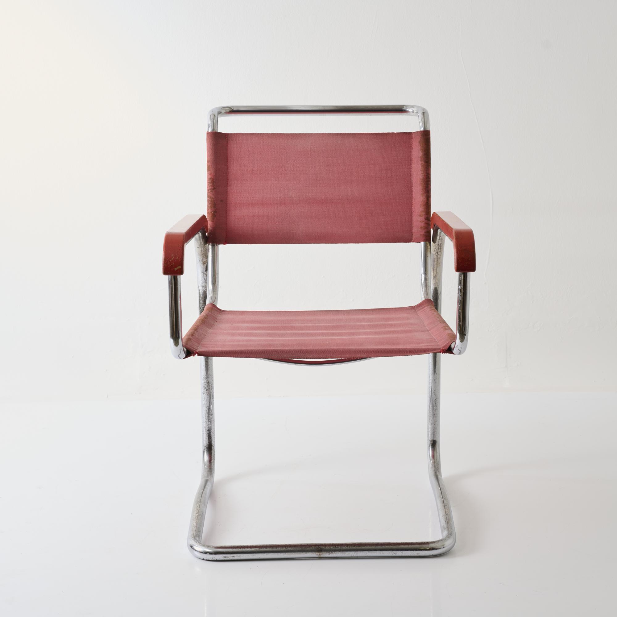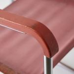 Stahlrohr, verchromt, Holz, dunkelrot lackiert, roter Eisengarn-Bezug.