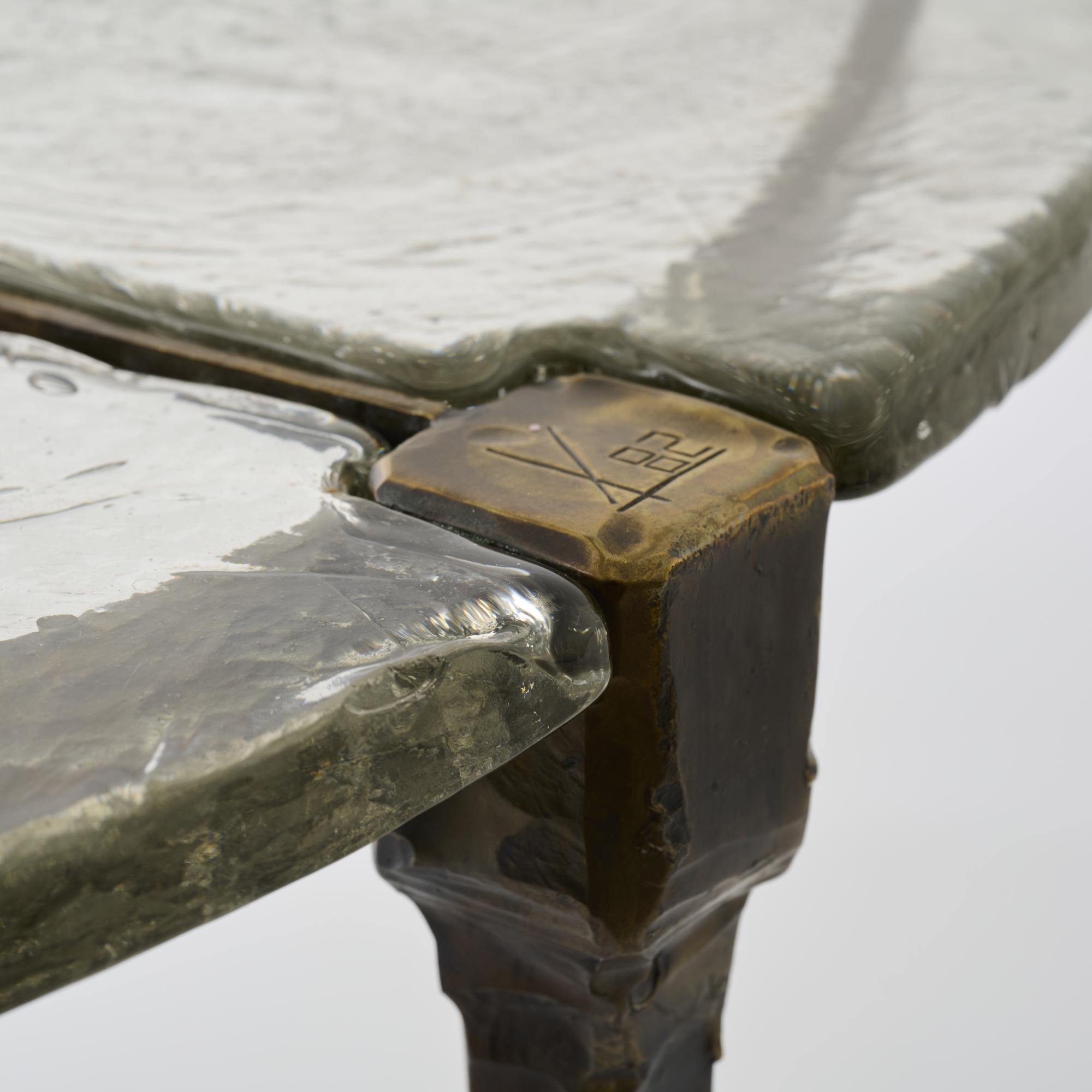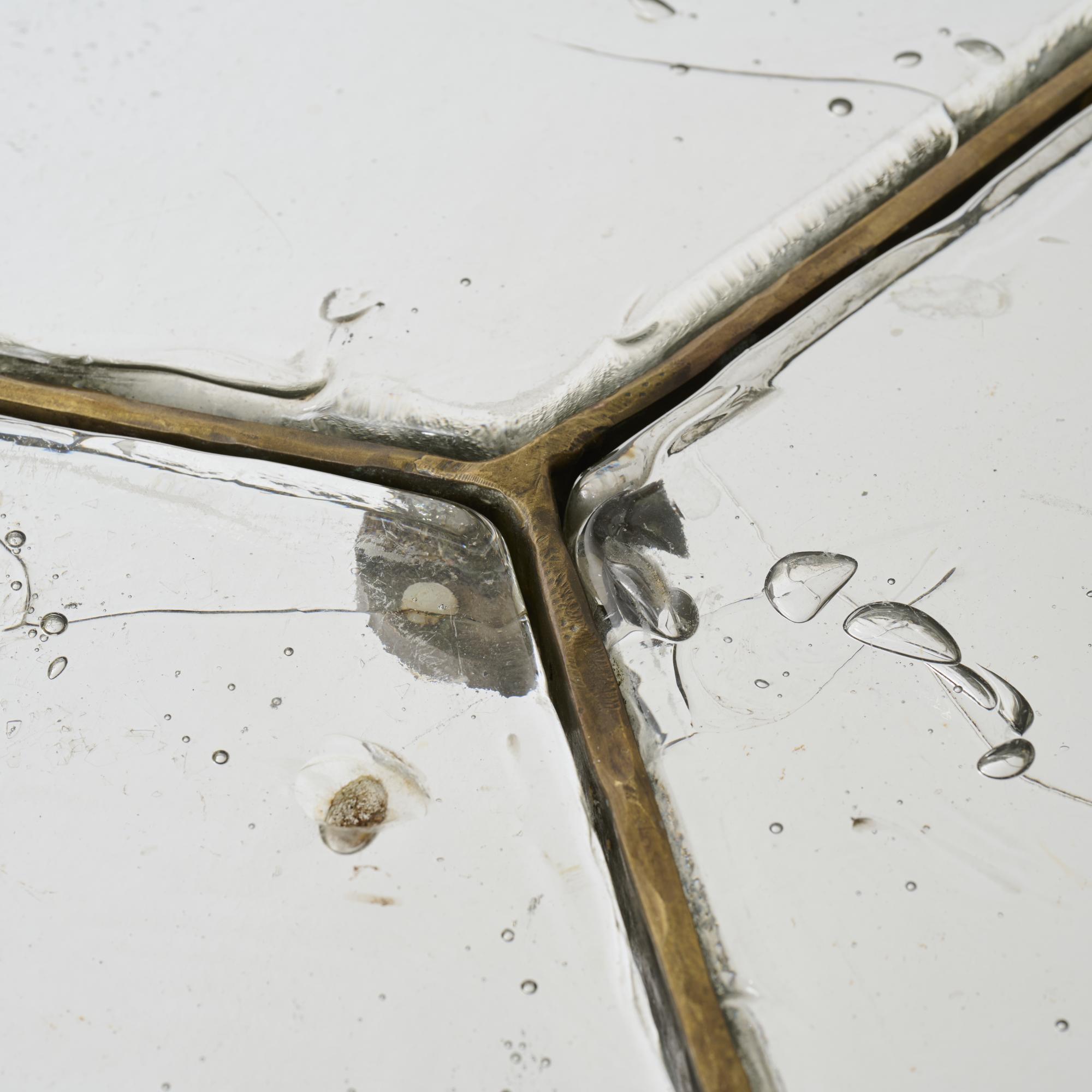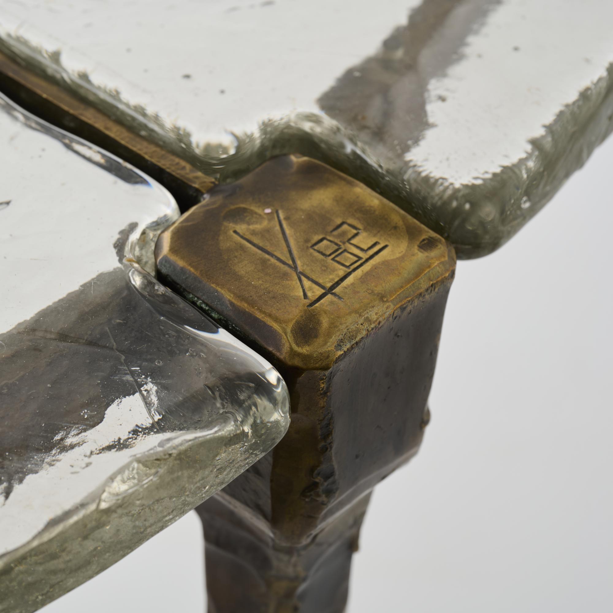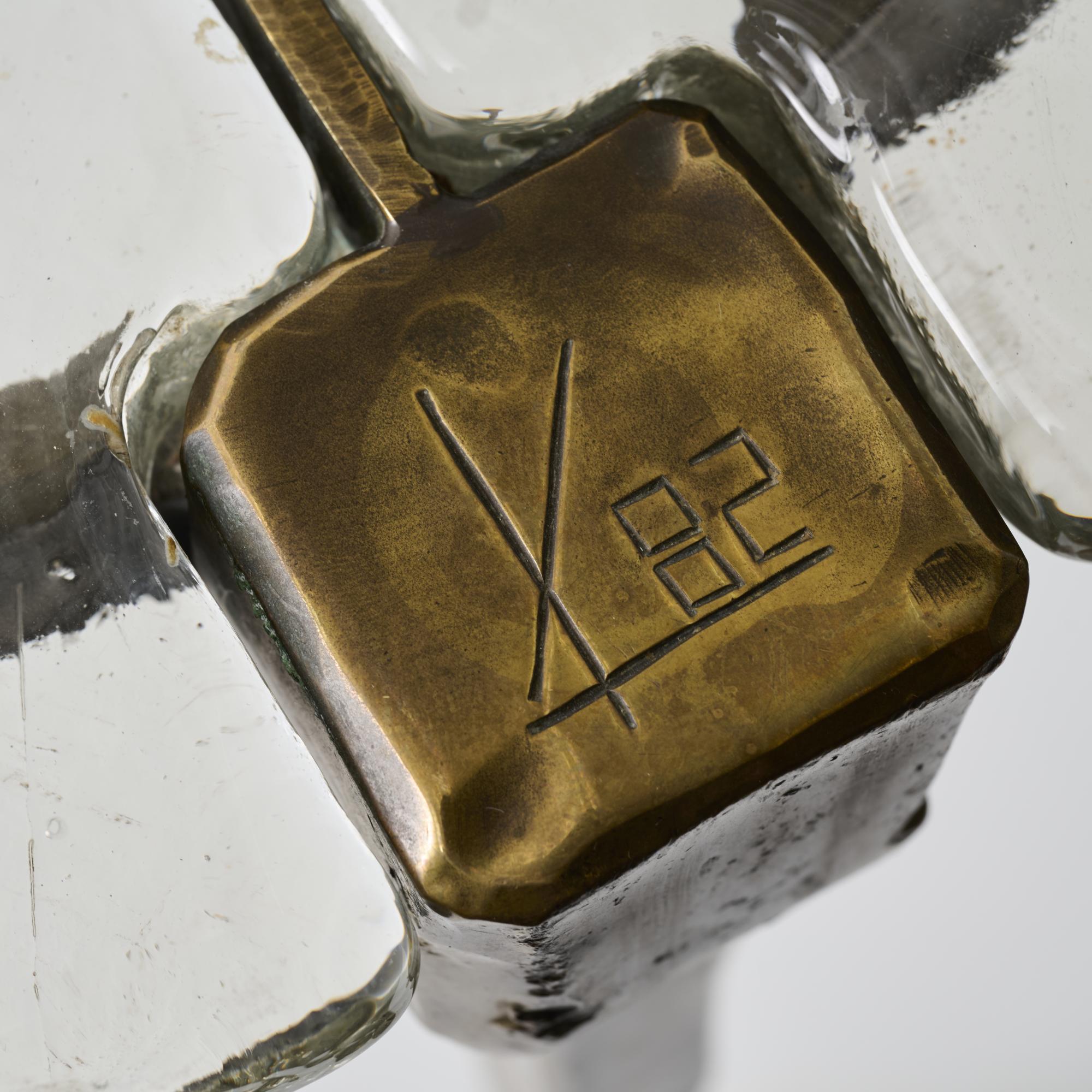 Bronze, geschmiedet, dunkel patiniert, blasiges Gussglas.