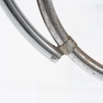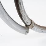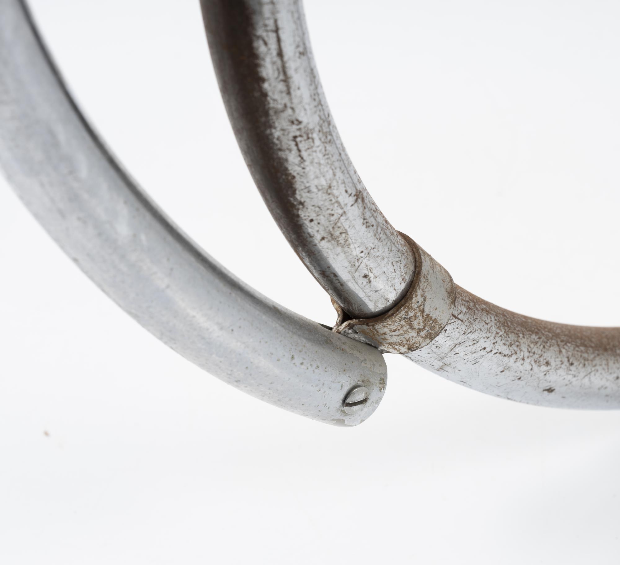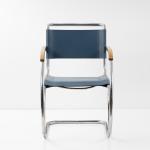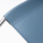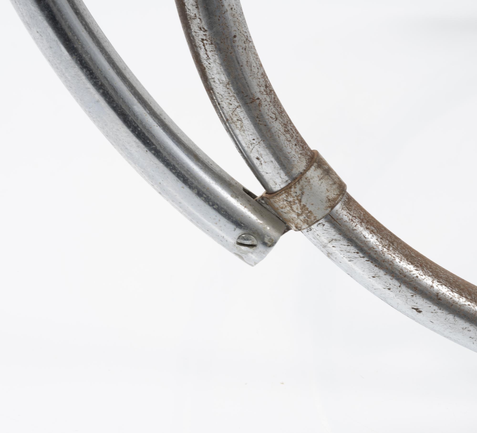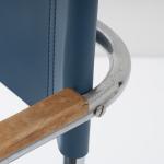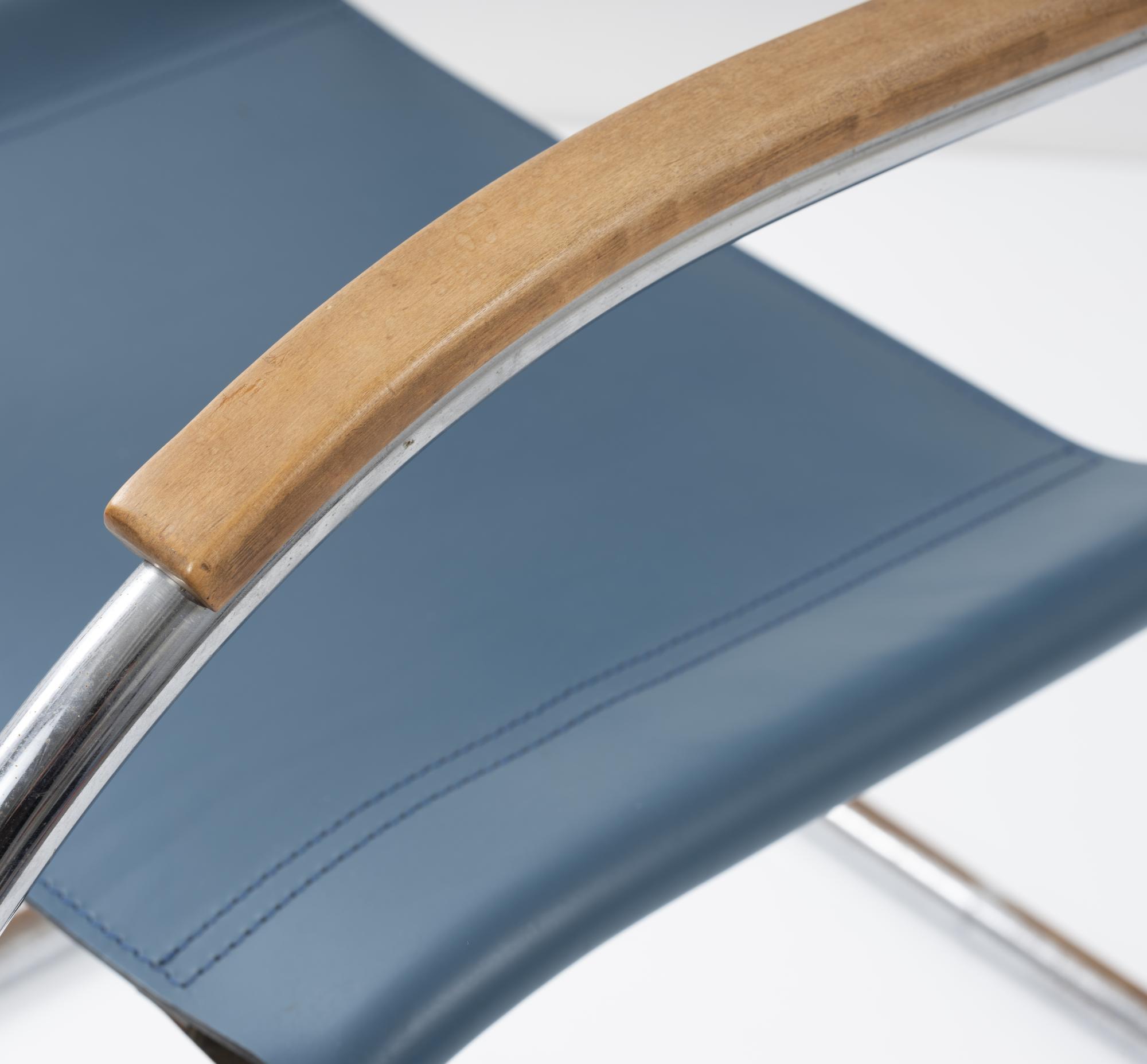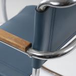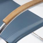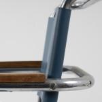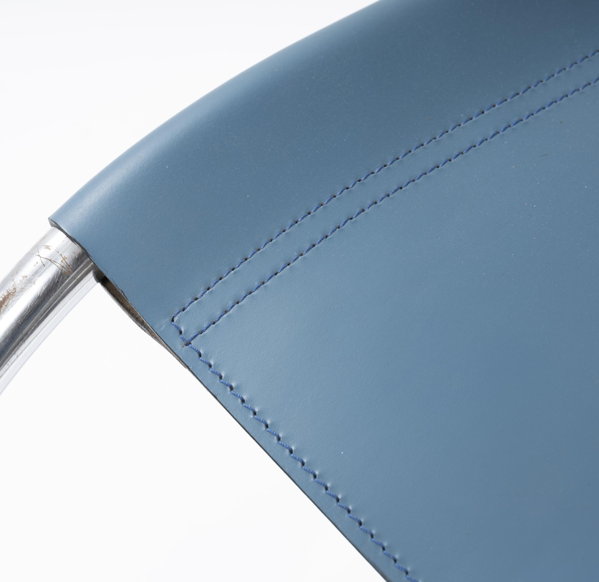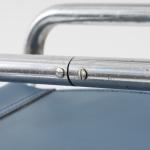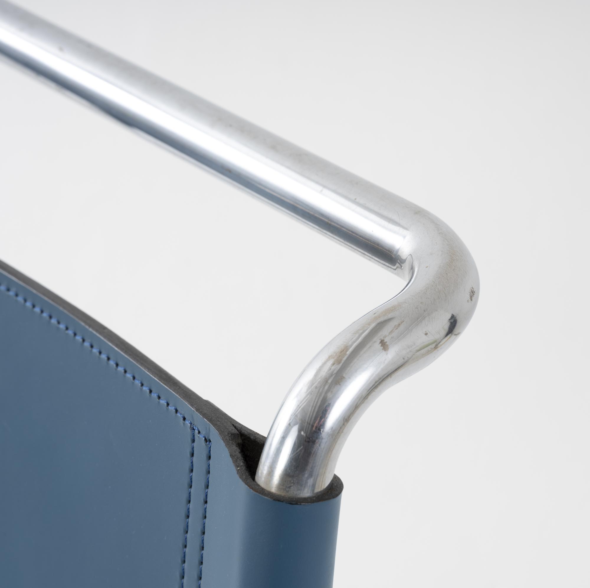 Stahlrohr, verchromt, gesteckt und verschraubt, mittelblaues Leder; ein Spreizbügel: Kantrohr, verchromt, gesteckt.