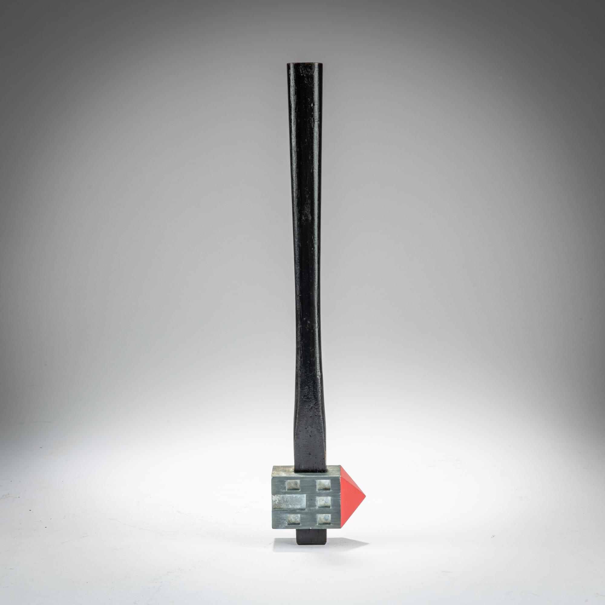 Holz, schwarz lackiert, Stahl, rot lackiert.